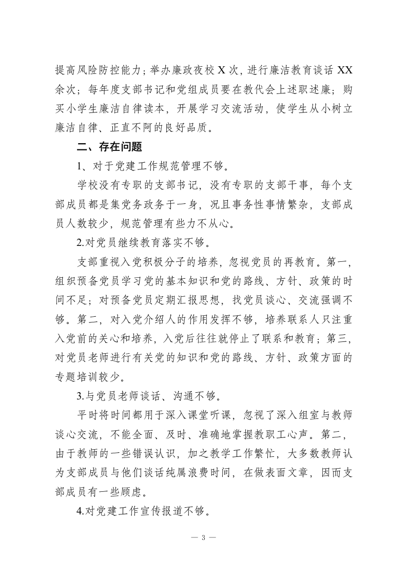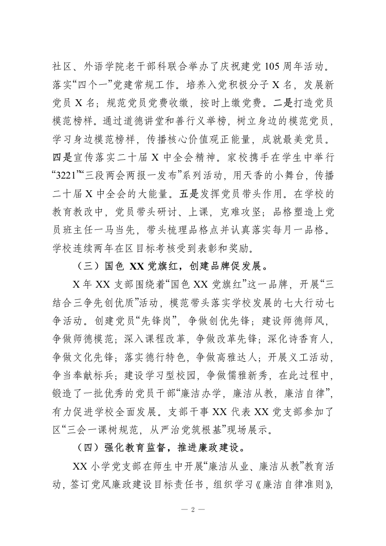 2025年学校党支部书记抓基层党建工作述职报告(五)X年,在区委、区政府、教体局的领导下,XX小学党支部以“抓党建促校建,抓党风促校风”为准则,以开展党史“四风建设“学习二十届X中全会精神”等专题教育活动常态化为抓手,团结带领XX小学全体教职工,砥砺奋进,乘势而为,扎实开展党建工作。一、主要工作(一)高标准带队伍,突主业落责任。党支部坚持带头学习,认真学习贯彻落实党的二十届X中全会精神,严格执行“三会一课”制度,了解新形势新任务,掌握新部署新要求。本年度中,共召开支部委员会XX次,支部党员大会X次,党小组会XX次,专题的党课学习X次,参加党的固定组织生活日活动X次,开放性组织生活一次,开展专题学习二十届X中全会报告XX次,共撰写心得体会X多万字。与广大教师开展交心谈心XX人次,每年召开X次教代会,进行述职评议。坚持深入教学一线,全年听课指导XX节次。看望慰问困难、生病党员XX人次。(二)强管理抓落实,突重点出效率。一是深入开展党史学习教育。举行“学党章,知党章,跟党走”演讲比赛、活动,XX代表XX党支参加“决胜全面小康让中原更加出彩”微党课比赛,获区一等奖。我校党支部、建设西路1