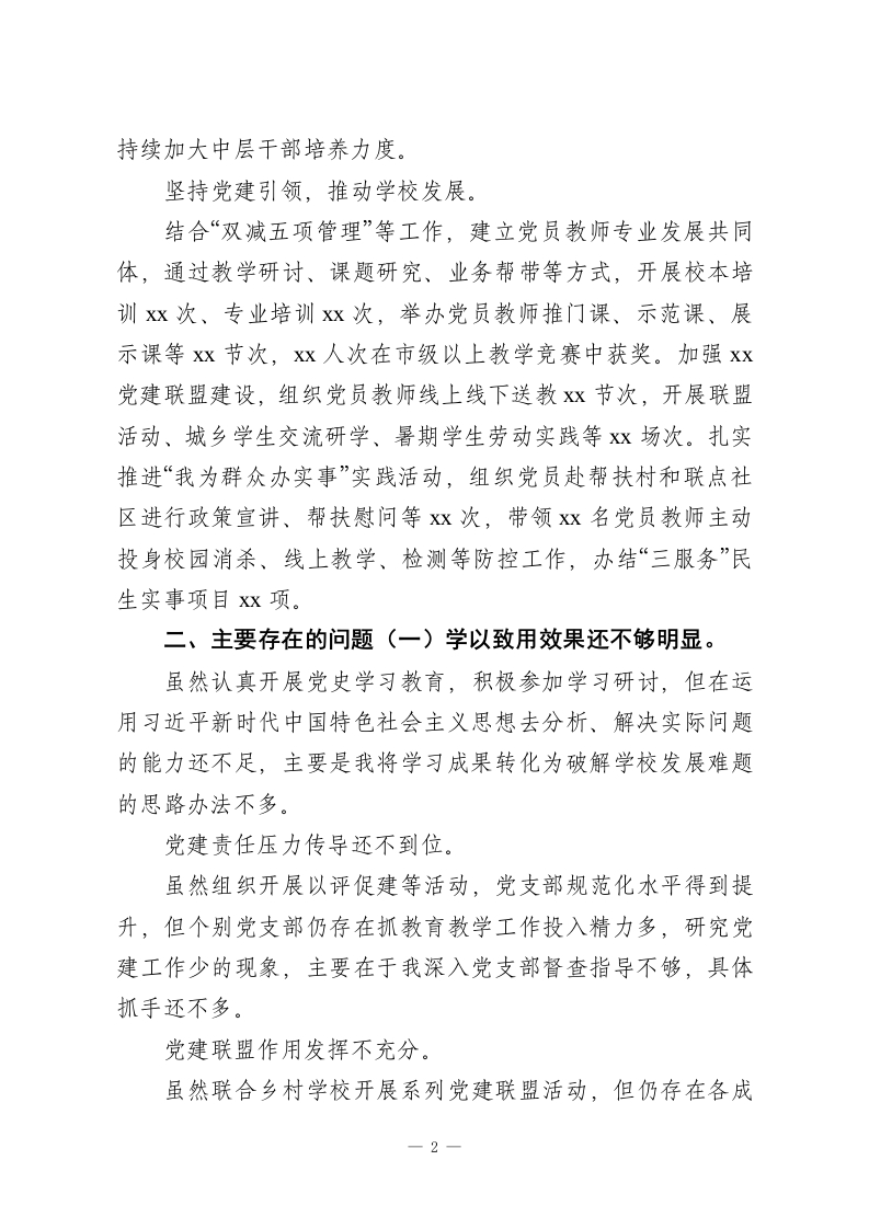 2025年学校党支部书记抓基层党建工作述职报告(一)根据会议安排,现就2025年度抓党建工作情况述职如下。一、工作开展情况(一)突出政治建设,加强党的领导。在学深悟透习近平新时代中国特色社会主义思想上持续用力,主持召开中心组学习会和支委会x次,及时学习习近平总书记重要讲话重要指示批示精神、党中央和省市委相关会议精神等。扎实推进党史学习教育,通过领学、讲学、互学、自学等形式,学习规定书籍和自选篇目,深入支部讲专题党课Xx节,开展专题研讨x次,形成了校级干部带头学、党员教师主动学全体教职工参与学的良好氛围。带头修订完善党委议事规则,对干部考察、职称评聘等事项,坚持集体审议决策,学校党组织把方向、管大局、作决策、抓班子、带队伍、保落实的作用充分发挥。强化责任落实,夯实党建基础。建立党小组组长、中层干部年度述职制度,健全完善班子成员联系支部机制,指导做好xx个党小组以评促建工作,完成上年度述职点评问题整改。围绕“组织体系建设三年行动”2025年行动计划,带头参加所在党支部的组织生活,抓好“三会一课”、主题党日、谈心谈话等制度落实,完善发展党员、党费收缴等工作台账,组织建设进一步加强。以队伍建设年为抓手,深化“双培养”工作,选派Xx名党员教师参加各级各类培训,轮岗交流中层干部Xx名,1