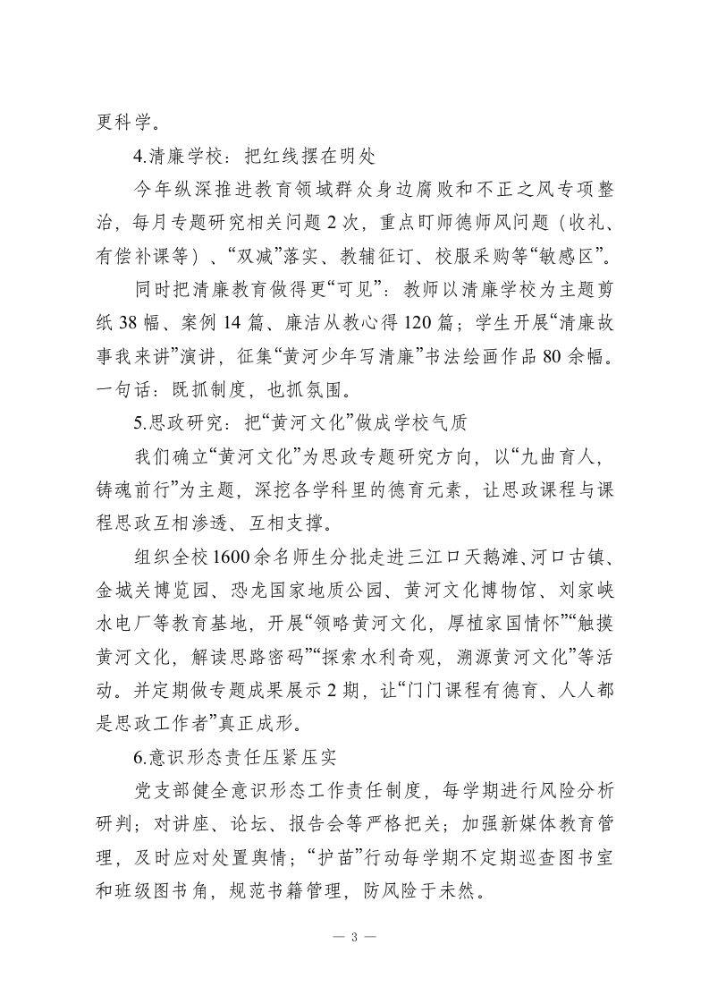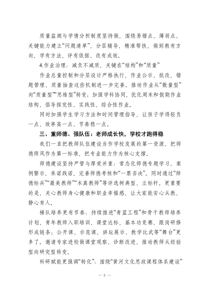 2025年学校工作总结:这一年,我们用实干让育人初心落地生根各位领导、各位老师、各位朋友,大家好!先用几句话把这一年“定个调”这一年,我们守初心、聚人心,党建领航把方向抓牢;这一年,我们讲规范、重师德,队伍一起往上走;这一年,我们盯课堂、拼质量,教研两条腿一起跑;这一年,我们做德育、立品格,“本真”二字落到学生身上;这一年,我们体艺齐开花,让更多孩子站上舞台、在阳光下发光:这一年,我们家校同频,劲儿往一处使;这一年,我们守住平安底线,把“生命至上”放在心里最重的位置。回头看,2025年很充实,也确实挺有成果。学校全面贯彻国家和省、市教育工作会议精神,紧扣区教育局2025年工作部署,坚持五育并举,落实立德树人。我们一直把教育教学当作主心骨,工作上有个很朴素的标准:办一所“我愿意把自己孩子送来读”的学校,做一名“我希望自已孩子遇到”的老师。今年的发力点也很清晰:以教师发展和学生成长为重点,以科技和体育为突破口,以“黄河文化”思政课体系建设为提升点,持续优化教育教学模式,提升教学质量和办学水平,推进学校治理现代化,进一步规范办学行为,努力把学校办成特色更鲜明、质量更扎实的区域优质学校。—1