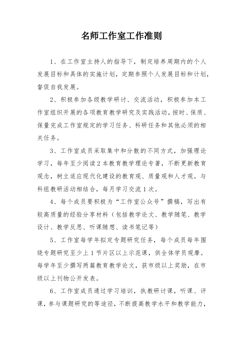 名师工作室工作准则1、在工作室主持人的指导下,制定培养周期内的个人发展目标和具体的实施计划,定期参照个人发展目标和计划,督促自我发展。2、积极参加各级教学研讨、交流活动,积极参加本工作室组织开展的各项教育教学研究及实践活动,按时、保质、保量完成工作室规定的学习任务、科研任务和其他必须的相关任务。3、工作室成员采取集中和分散的不同方式,加强理论学习,每年至少阅读2本教育教学理论专著,不断更新教育观念,树立适应现代化建设的教育观、质量观和人才观。与科组教研活动相结合,每月学习交流1次。4、每个成员要积极为“工作室公众号”撰稿,写出有较高质量的经验分享材料(包括教学论文、教学随笔、教学设计、教学反思、听课随想、读书笔记等)5、工作室每学年拟定专题研究任务,每个成员每年围绕专题研究至少上1节片区以上示范课,供全体学员观摩。每学年至少撰写两篇教育教学论文,获市级以上奖励,在市级以上刊物公开发表。6、工作室成员通过学习培训,执教研讨课,听课、评课,参与课题研究的等途径,不断提高教学水平和教学能力,
