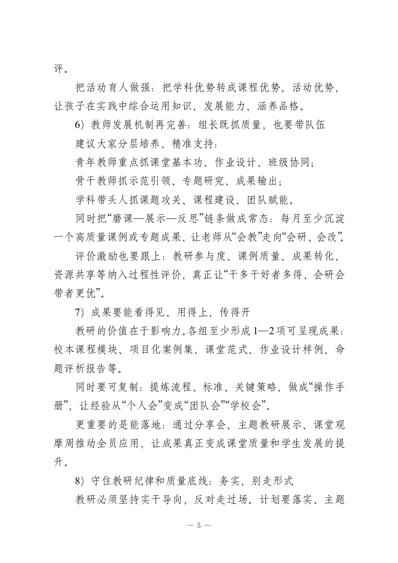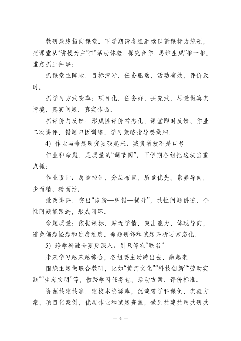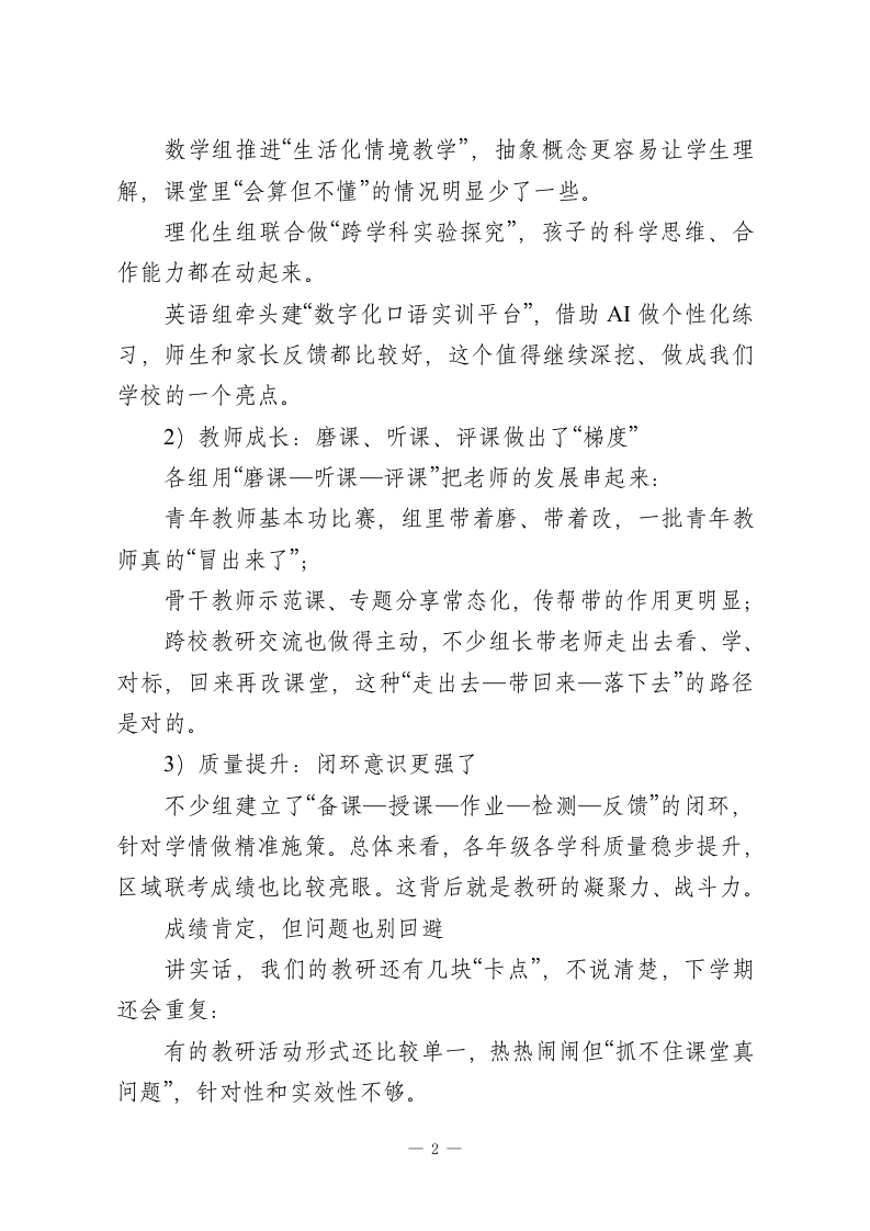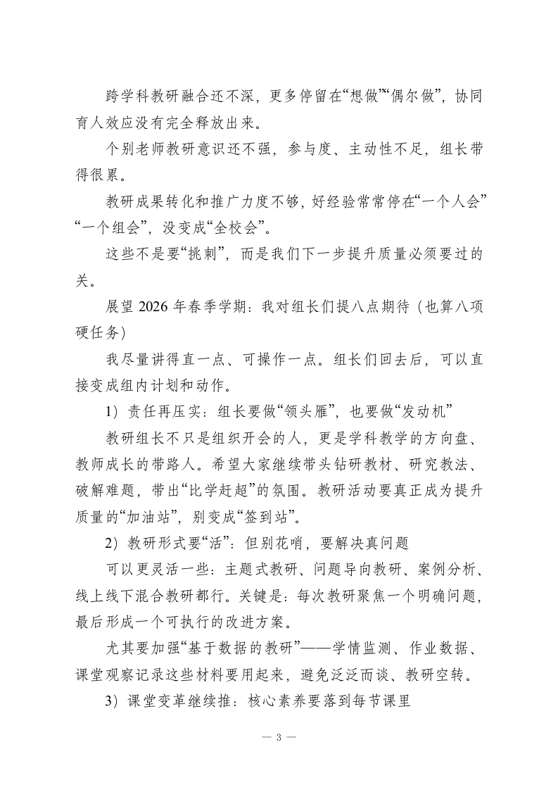 2025秋季学期,期末教研组长总结大会上,校长讲话:以研促教提质量,以责赋能育新人各位教研组长、各位老师:大家下午好!一转眼,2025年秋季学期就到尾声了。今天把大家请到一起,开这个期末教研组长总结会,说白了就两件事:回头看一—这学期我们教研到底做出了什么;往前想一一下学期质量提升怎么更扎实、更有效。我先代表学校领导班子,真心地跟各位组长说一声:辛苦了。你们这一学期既要扛教学、又要带团队,还要做组织协调,很多“看不见的活”都是你们在顶着。学校教学能稳住、能往前走,离不开各位组长的专业和担当。先聊聊这学期做得比较亮的地方这一学期,在各位组长带领下,我们的教研不是“开了几次会、写了几份记录”那么简单,确实有一些能落到课堂、落到学生身上的变化。1)课程建设:新课标落地更具体了各组都在围绕核心素养做文章,而且不是停在口号上。比如:语文组把“整本书阅读”和项目式学习做了融合,让经典不只停在课本里,跟生活、表达、实践连起来了。