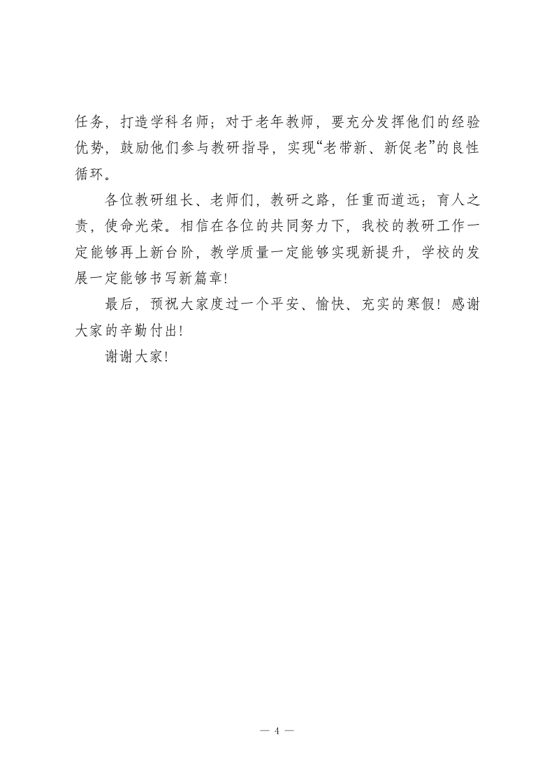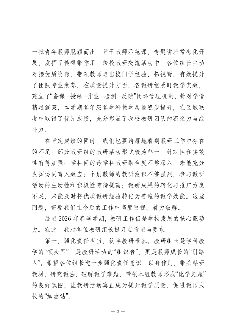 2025秋季学期,期末教研组长总结大会上,校长讲话:以研促教提质量,以责赋能育新人各位教研组长、老师们:大家下午好!时序更替,华章日新。转眼间,2025年秋季学期已近尾声。今天,我们齐聚一堂,召开期未教研组长总结大会,既是对过去一学期教研工作的全面复盘,也是对未来教学质量提升之路的集体谋划。首先,我代表学校领导班子,向各位教研组长致以最诚挚的感谢!感谢大家一学期来以身作则、恪尽职守,带领各学科教师深耕课堂、潜心教研,用专业与担当为学校教学工作筑牢了根基,为学生成长搭建了阶梯。回顾这一学期,在各位组长的引领下,我校教研工作亮点纷呈、成效显著。在课程建设方面,各教研组聚焦核心素养,持续推进新课标落地实践:语文组的“整本书阅读+项目式学习”融合课程,让经典文学走进生活;数学组的“生活化情境教学”改革,有效破解了抽象知识理解难题;理化生组联合开展的“跨学科实验探究”活动,培养了学生的科学思维与协作能力。尤其是英语组牵头的“数字化口语实训平台”建设,借助AI技术实现了个性化教学,得到了师生与家长的广泛认可。在教师成长方面,各组以“磨课、听课、评课”为抓手,搭建了多层次成长平台:青年教师教学基本功大赛中,各组精心指导、反复打磨,1