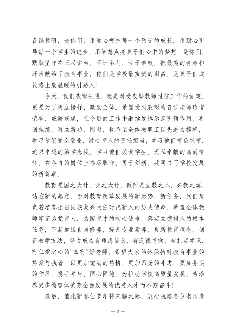 2025秋季学期期末教师表彰大会上,校长讲话:衷心祝愿各位老师身体健康、工作顺利尊敬的各位老师:大家下午好!岁末冬安,硕果盈枝。今天,我们齐聚一堂,隆重召开2025年秋季学期期未教师表彰大会。首先,我谨代表学校领导班子,向辛勤耕耘在教育教学一线的全体教职工,致以最诚挚的问候和最衷心的感谢!向即将受到表彰的先进个人和优秀集体,致以最热烈的祝贺!回望这个学期,是学校发展步履坚实、成果丰硕的一学期,更是全体教师凝心聚力、砥砺奋进的一学期。在大家的共同努力下,学校各项工作稳步推进、亮点纷呈:教育教学质量持续攀升,课堂改革不断深化,“双减”政策落地见效,学生核心素养全面提升一一在各级各类学科竞赛、文体活动、科技创新大赛中,我校学子捷报频传;师资队伍建设再上新台阶,多名教师在优质课评比、课题研究、论文发表中斩获佳绩,青年教师快速成长,骨干教师示范引领作用充分彰显;校园文化建设有声有色,德育活动形式多样,师生关系和谐融洽,校园充满了向上向善的正能量。这些成绩的取得,离不开每一位教师的辛勤付出和无私奉献。是你们,清晨迎着朝阳走进校园,深夜还在灯下批改作业、