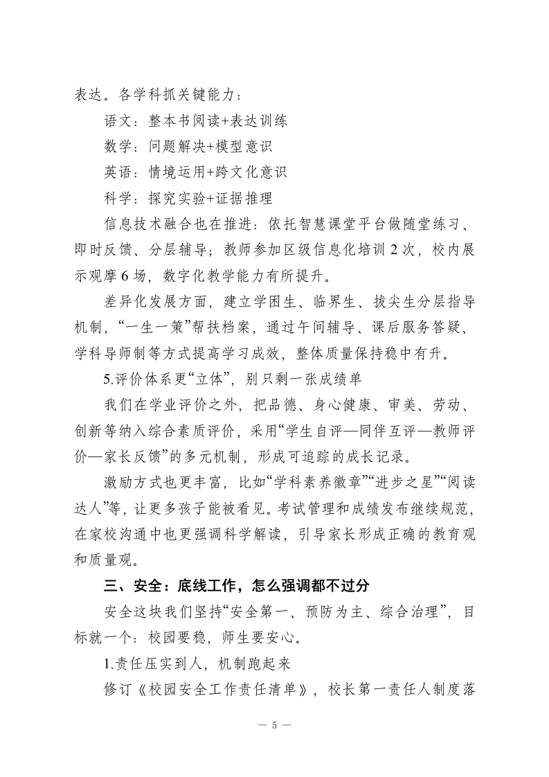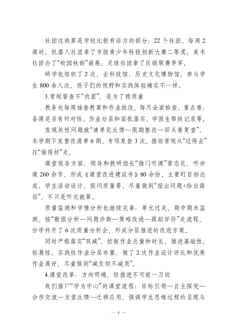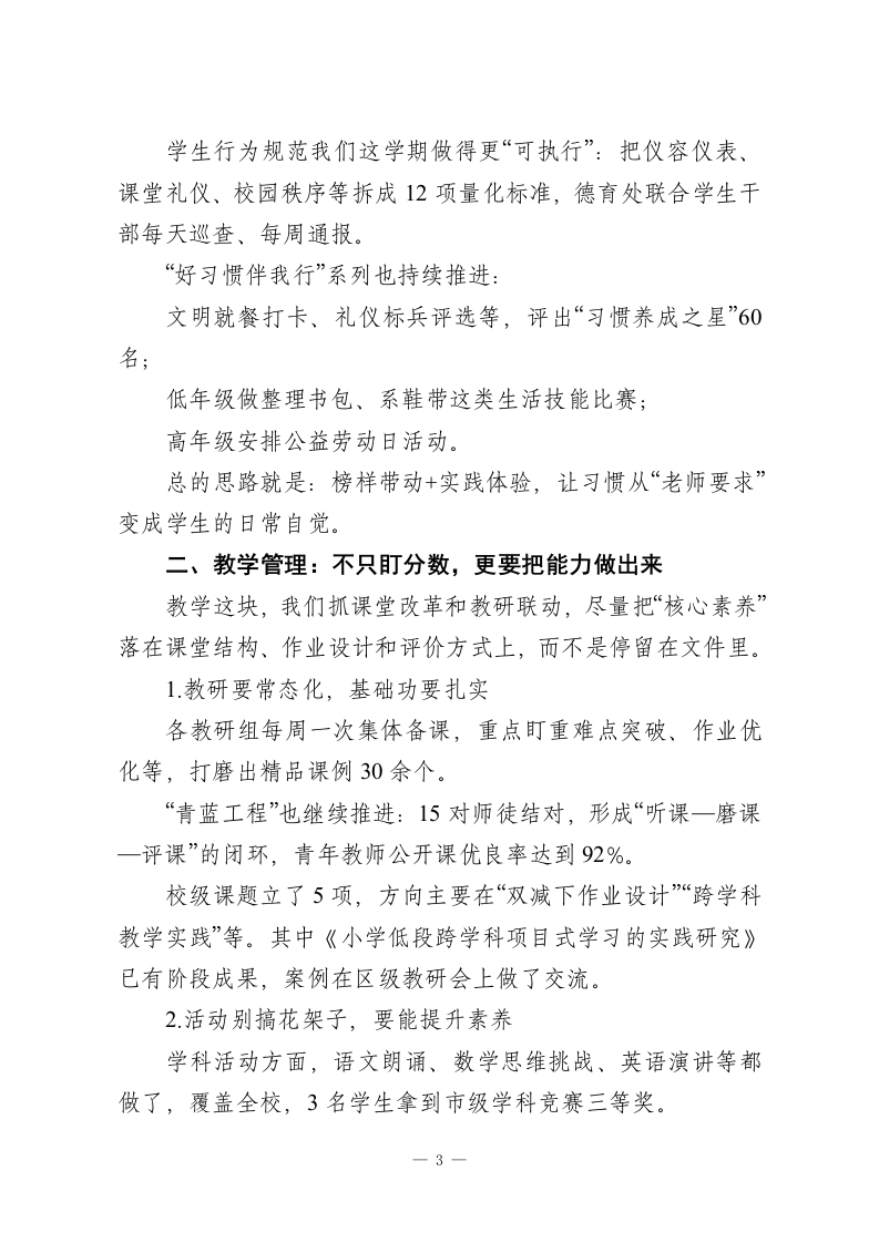 2025秋季学期期末总结学校工作汇报:凝心聚力抓落实,守正笃行谋发展尊敬的各位领导、各位同仁:本学期,学校工作总体上还是围绕“稳基础、提质量、强特色”这条主线来走的。我们以…为指导,全面贯彻党的教育方针,把“立德树人”放在最重要的位置,德育、教学、安全、后勤几条线一起抓、一起推,边做边改、边改边完善。下面把这学期的主要情况做个汇报。一、德育:先把“人”育好,底盘才稳这学期我们一直强调“全环境育人”,说白了就是:不光靠德育处和班主任,课堂、家里、社区都得一起上,形成合力,不能各管一段。1.制度先理顺,大家才好一起干我们把《学校德育工作实施方案》重新修订了一遍,目标分层、内容分类、评价多元这些框架都明确下来,避免“想起来抓一阵、忙起来放一放”。家校社这块也继续往前推:成立了校级家长委员会,每两周固定开一次家校沟通会(这点坚持下来挺关键)。和辖区社区、文化馆共建了5个德育实践基地,让学生有地方“做中学”。推出了《家校共育手册》,把家长该怎么配合(习惯养成、心理疏导等)写得更清楚。一1