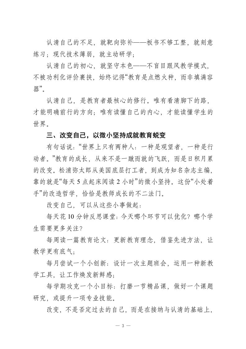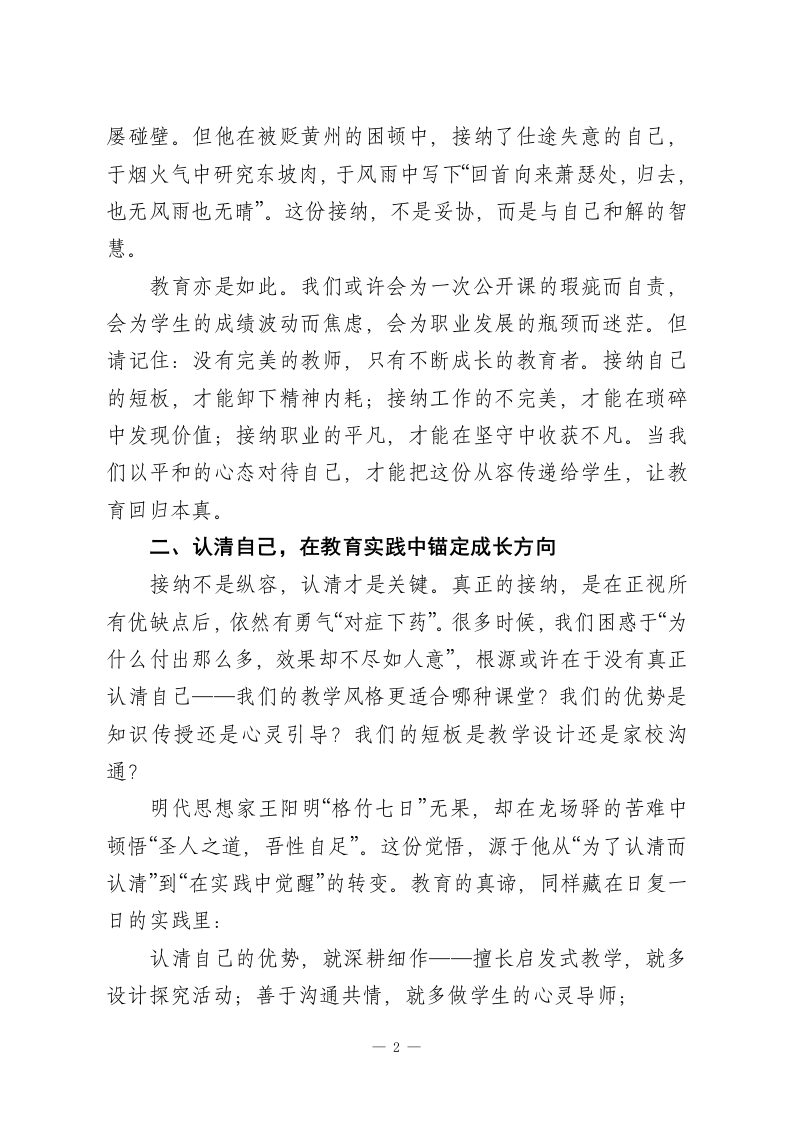 2025秋季学期最后一次全体教师大会,校长讲话:接纳自己,认清自己,改变自己尊敬的各位老师:大家下午好!岁聿云暮,冬意渐浓,我们又一次站在了学期的终点、新年的门槛。今天,我们齐聚这里,既是对2025秋季学期的复盘总结,更是为2026年的教育征途积蓄力量。此刻,我想和大家分享一个贯穿一生的命题一接纳自已,认清自己,改变自已。这个命题,源于心理学家荣格的人生实践。38岁的他遭遇严重精神危机,却没有沉沦,而是以每日记录梦境、绘画直面阴影的勇气,用16年时间完成《红书》,最终实现自我救赎。他那句“一个人不是通过想象光明而觉悟的,而是通过让黑暗变得有意识”,恰恰道出了教育者最需要的修行:教育是渡人,更是渡己。我们每天面对几十个鲜活的生命,处理纷繁的教学事务,承受多重的责任压力,唯有先与自己和解,才能给学生传递温暖与力量。一、接纳自己,与不完美的教育人生温柔相拥蒙田说:“世界上最伟大的事,是一个人懂得如何做自己的主人。”作为教师,我们总渴望成为“完美的引路人”一课堂零失误、学生全优秀、家校无矛盾。可现实往往是:精心备好的课可能效果平平,耐心引导的学生可能反复犯错,掏心掏肺的付出可能不被完全理解。就像北宋文豪苏东坡,一身傲骨、直言敢谏,却在官场屡一1