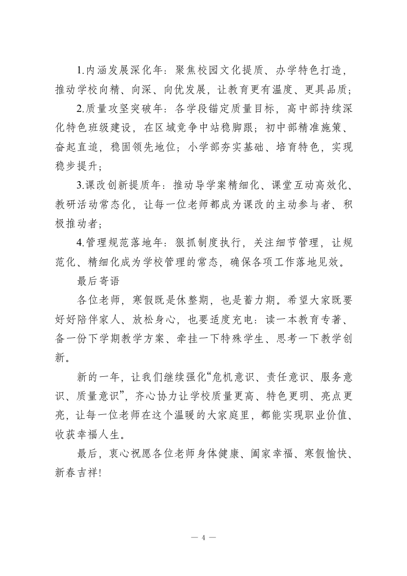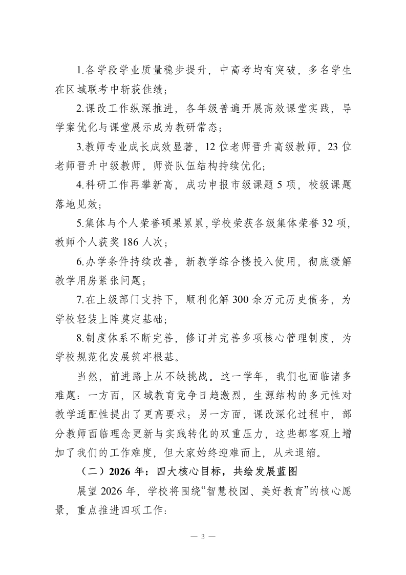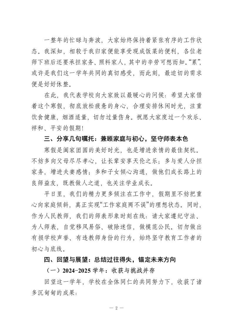 2025秋季学期最后一次全体教师大会,校长讲话:凝心聚力启新程,笃行致远向未来各位老师:岁未将至,学年收官。在这辞旧迎新的重要时刻,我们齐聚一堂,召开2025年度最后一次全体教师大会。关于学年总结的核心内容,我已在述职报告中详细阐述,今天借着这场相聚,我想再用四层心里话,向大家致以最诚挚的感谢一一感谢大家一整年里对学校发展、班子工作以及我个人履职的理解、信任与鼎力支持。一、致以崇高敬意:感谢每一份坚守与奉献在过去的一学年里,大家既要圆满完成核心教学任务,又要全力配合学校阶段性目标推进,不折不扣落实上级下达的各项工作。多少个日夜,我们见证了年轻教师强忍牵挂坚守岗位,无暇顾及家中病弱的孩子;看到了不少老师带着病痛依然站在讲台;许多同事天未亮便踏上来校之路,夜幕降临才踏上归途。没有怨言,唯有坚守,这正是新时代教师职业道德的生动诠释。学校每一项成绩的取得、每一次获得家长与社会的赞誉,都绝非一人之功,而是我们这个集体凝心聚力的成果,是团队力量的最佳彰显。在此,我代表学校,向每一位辛勤付出的老师,致以最崇高的敬意!二、送上暖心问候:愿假期安康与惬意相伴