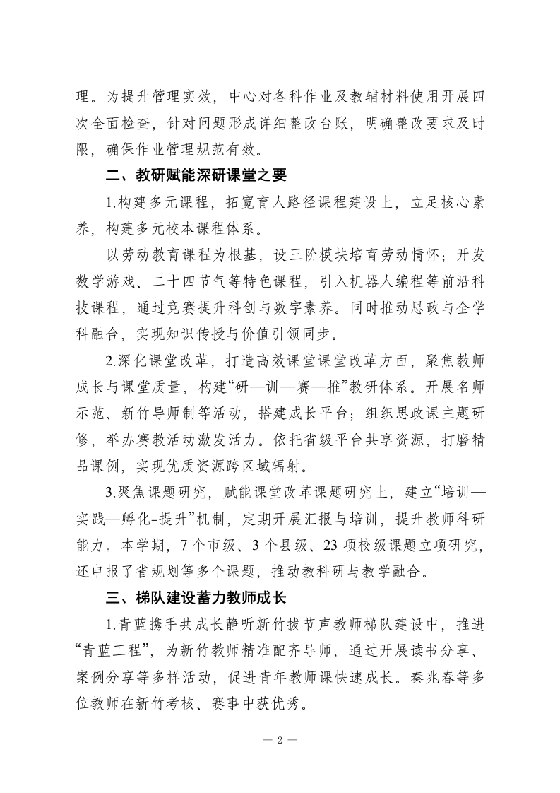 2025年秋季学校教导处工作总结时光清浅,辗转流年。时间的画卷总在砥砺前行中铺展;精彩的华章总在持续奋斗中书写,转眼间,一学期的教育征程圆满落幕。依据本学期教学和教研计划,全体教师在领导的关心和支持下,以提高教学质量为目标,着力打造高效课堂;以培养学生创新精神和实践能力为重点,力足提升教育教学质量;以新课标为抓手,以全面提高学生的核心素养为目的,采用多种教研形式开展教学工作,力求教研工作做到“实、广、新、细”回眸来时耕耘路,既是总结,亦是展望。一、常规立基精耕教学之本1.抓细备课环节筑牢课堂根基教师发展中心立足新课标要求,紧扣“以生为本”教学理念,围绕“学什么、怎么学、怎么学懂学会”,全力推行新的课堂模式,组织全校骨干教师开展集体备课。集备活动聚焦“备教材重整合、备学情重分层、备教法重创新”,充分发挥集体智慧,让备课真正服务于高效教学。2.抓实课堂质效强化巡课督导本学期所有行政领导中心下沉教学一线,通过“校长领衔+包段领导+包级领导”巡课小组,推行“每日随机巡、每周抓重点”机制,重点督查课堂互动效率、学生参与度及科学、道法等小学科落实情况,实时掌握师生课堂状态,每周在行政会反馈问题,在年级组及时传达并立行立改,推动课堂管理精细化,助力师生共成长。3抓严作业管理优化评价体系依据“双减”政策,持续规范作业设计,严格控制总量,在“质”与“量”上实现精准把控与精细管一1