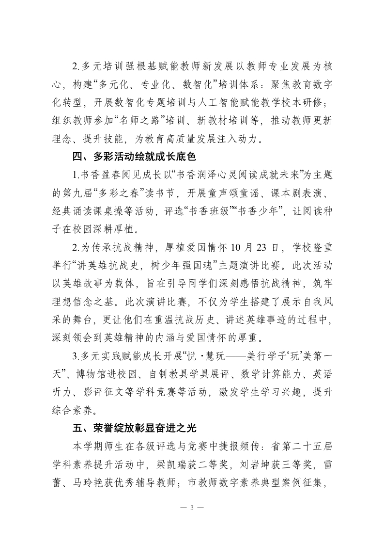 2025年秋季学校教导处工作总结时光清浅,辗转流年。时间的画卷总在砥砺前行中铺展;精彩的华章总在持续奋斗中书写,转眼间,一学期的教育征程圆满落幕。依据本学期教学和教研计划,全体教师在领导的关心和支持下,以提高教学质量为目标,着力打造高效课堂;以培养学生创新精神和实践能力为重点,力足提升教育教学质量;以新课标为抓手,以全面提高学生的核心素养为目的,采用多种教研形式开展教学工作,力求教研工作做到“实、广、新、细”回眸来时耕耘路,既是总结,亦是展望。一、常规立基精耕教学之本1.抓细备课环节筑牢课堂根基教师发展中心立足新课标要求,紧扣“以生为本”教学理念,围绕“学什么、怎么学、怎么学懂学会”,全力推行新的课堂模式,组织全校骨干教师开展集体备课。集备活动聚焦“备教材重整合、备学情重分层、备教法重创新”,充分发挥集体智慧,让备课真正服务于高效教学。2.抓实课堂质效强化巡课督导本学期所有行政领导中心下沉教学一线,通过“校长领衔+包段领导+包级领导”巡课小组,推行“每日随机巡、每周抓重点”机制,重点督查课堂互动效率、学生参与度及科学、道法等小学科落实情况,实时掌握师生课堂状态,每周在行政会反馈问题,在年级组及时传达并立行立改,推动课堂管理精细化,助力师生共成长。3抓严作业管理优化评价体系依据“双减”政策,持续规范作业设计,严格控制总量,在“质”与“量”上实现精准把控与精细管一1