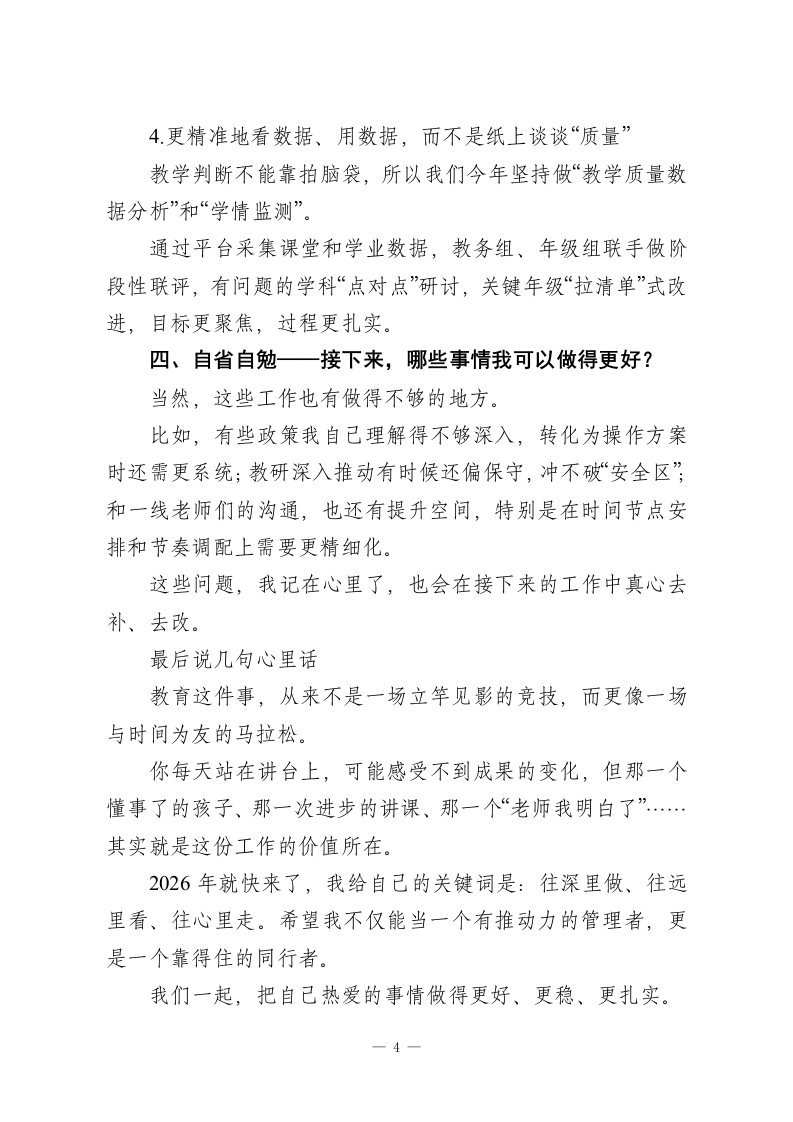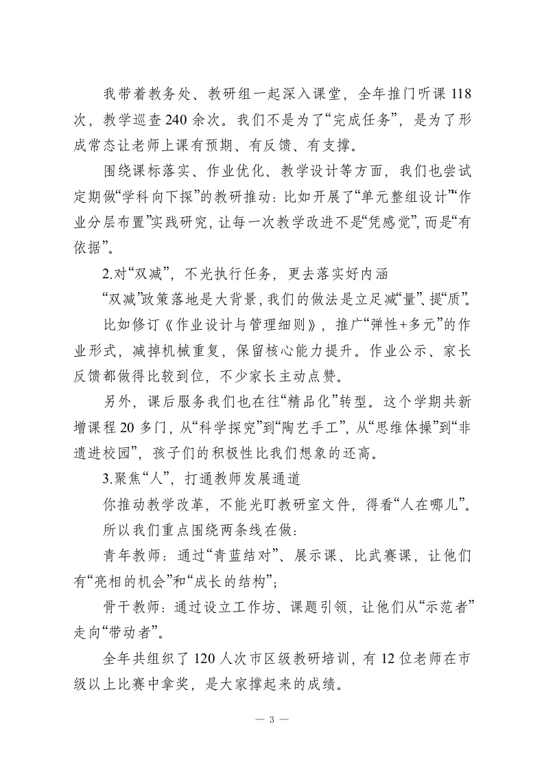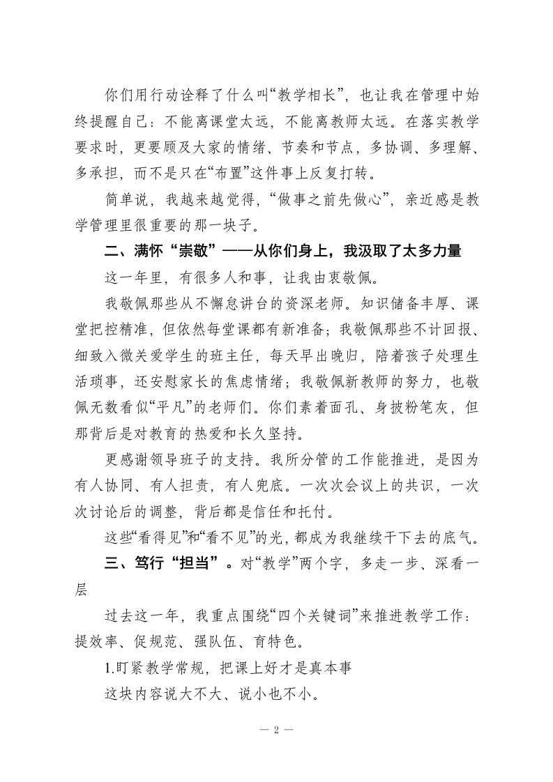 2025年度教学副校长述职报告:聚焦提质增效,聚力师生成长尊敬的各位领导,各位老师:大家上午好!时间真快,一转眼,我们就站在了2025学年的尾声上。这一年,有忙碌、有挑战,也有很多值得定格的瞬间。在此,我想带着一颗感恩的心,把我作为教学副校长在过去一年的履职情况,向大家做一个简要汇报。说实话,搭班做事这一年,我得到很多支持,也学到了不少。校长的引领、班子同仁的协同推进,以及在座各位老师的真心配合和实打实的行动,一起撑起了我们整个学校的教育教学秩序。感谢大家的信任,也诚恳欢迎大家对我的工作多提意见。那么,今天我想从四个关键词来汇报我的工作感受与实践经历,分别是:亲近、崇敬、担当、自省。一、心怀“亲近”一一和大家站在一起,才能走得更远如果说过去的管理经验让我更懂得“怎么干”,那么这一年的共同工作,让我更深刻体会到“为什么而干”。这份工作并不轻松,但让我感动的是,身边的每一位老师都在以各自的方式,诠释着对教育的执着,有的老师在备课中一遍遍打磨课件,为了把抽象的知识讲透讲活;有的老师在午休时间趴在阅览室里陪学生修改文稿,只因为他说孩子努力,他不能辜负。