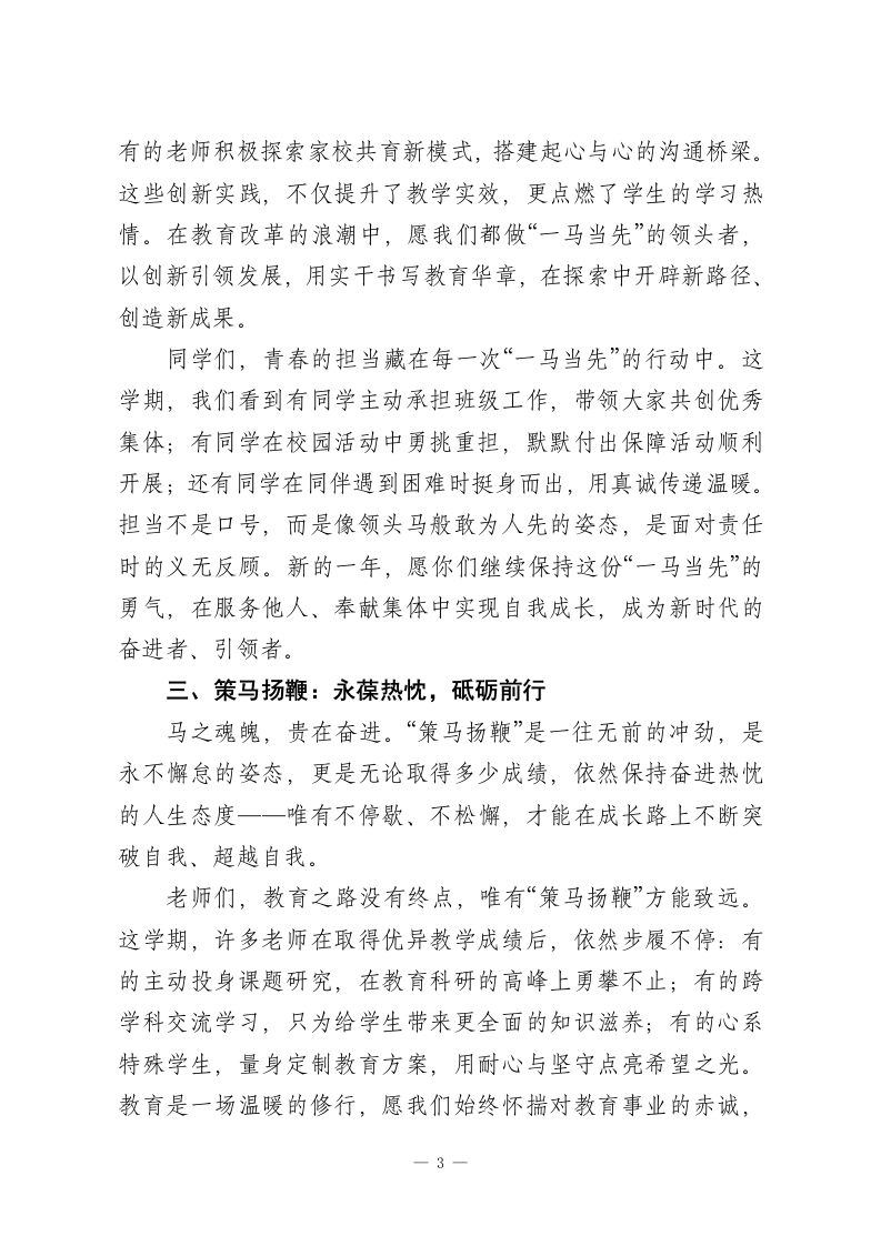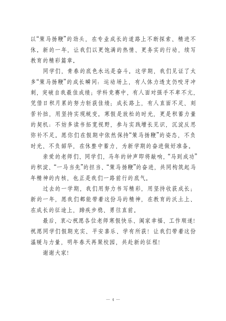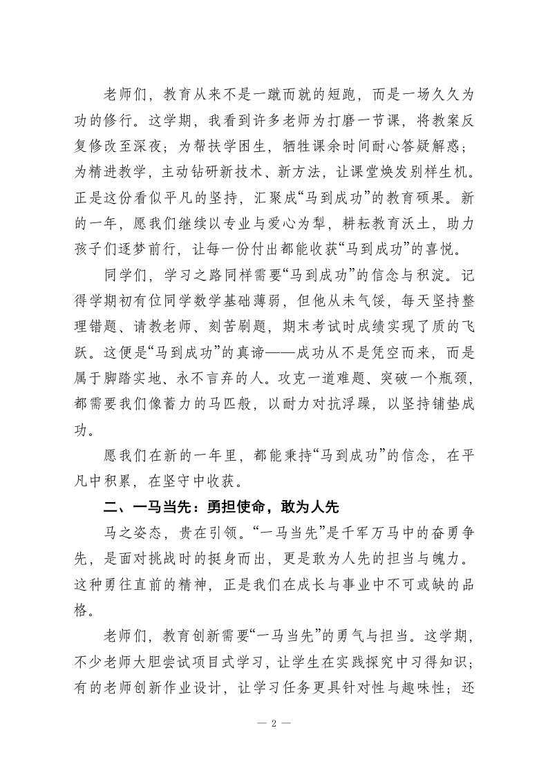 2026马年寒假散学典礼,校长讲话:三马精神铸底气,马年逐光向春行!亲爱的老师们、同学们:大家上午好!暖煦的阳光铺满校园,映照着同学们朝气蓬勃的笑脸。此刻站在大家面前,我的心中满是欣慰与感动。时光荏苒,一个充实的学期即将画上句号,马年的钟声也正悄然临近。回首这一学期,我们共同镌刻了太多温暖而珍贵的记忆。运动场上,你们矫健的身姿彰显着拼搏的力量;教室里,你们专注的眼眸传递着求知的渴望;社团活动中,创意的火花点亮了青春的梦想;志愿服务里,温暖的善举诠释着责任与担当。每一个平凡的日夜,都在见证着我们并肩成长的足迹。在此,我要特别感谢亲爱的老师们。是你们披星戴月、坚守讲台,用智慧与爱心浇灌每一株幼苗;是你们春风化雨般的关怀,温暖着每一颗求知的心灵。你们的付出,早已深深镌刻在孩子们成长的年轮里,成为最珍贵的底色。今天,在这个承前启后的特殊时刻,我想用三个承载着马年精神的词语一“马到成功”“一马当先“策马扬鞭”,与大家分享期许,共赴马年新程。一、马到成功:厚积薄发,功不唐捐马之精神,贵在积淀。“马到成功”从不是偶然的幸运,而是厚积薄发的必然。正如千里马日行千里,离不开日复一日的训练与蓄力,所有耀眼的成就,都源于日积月累的沉淀与坚守。1
