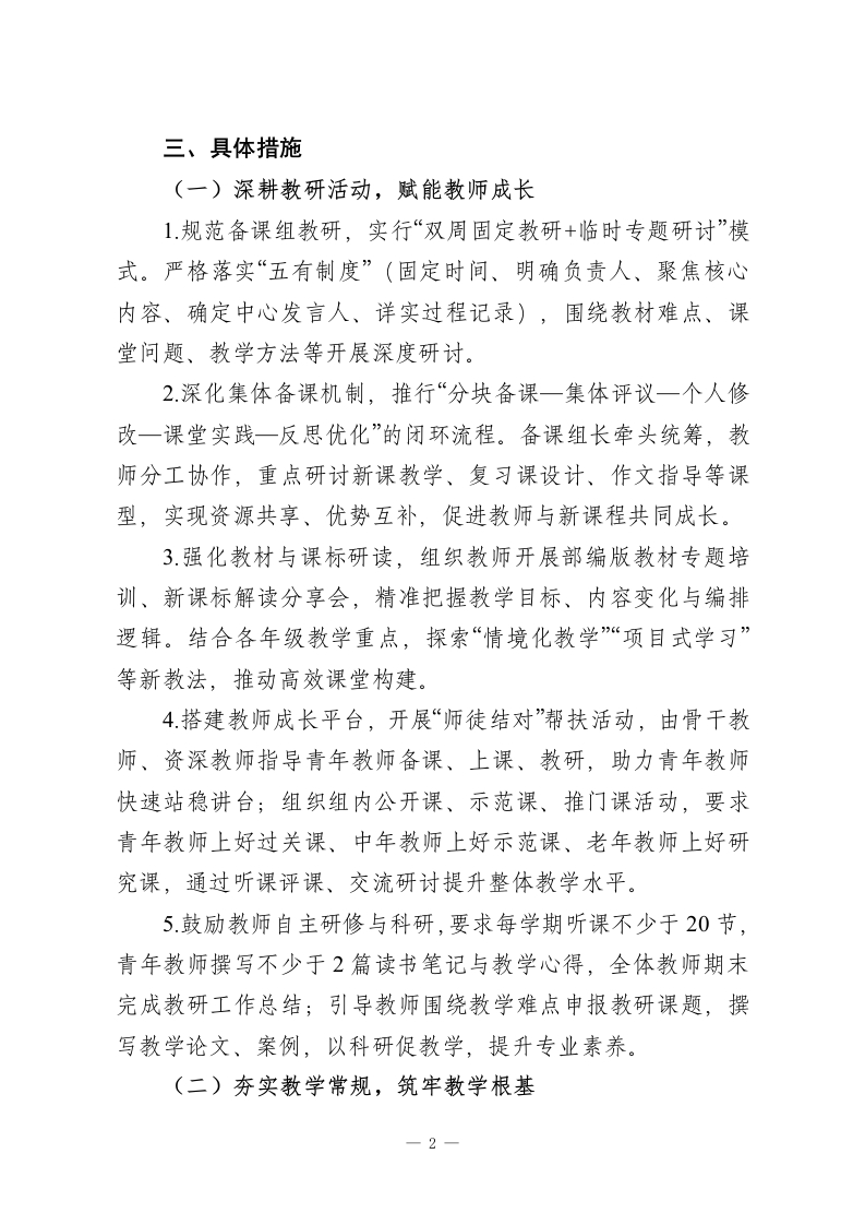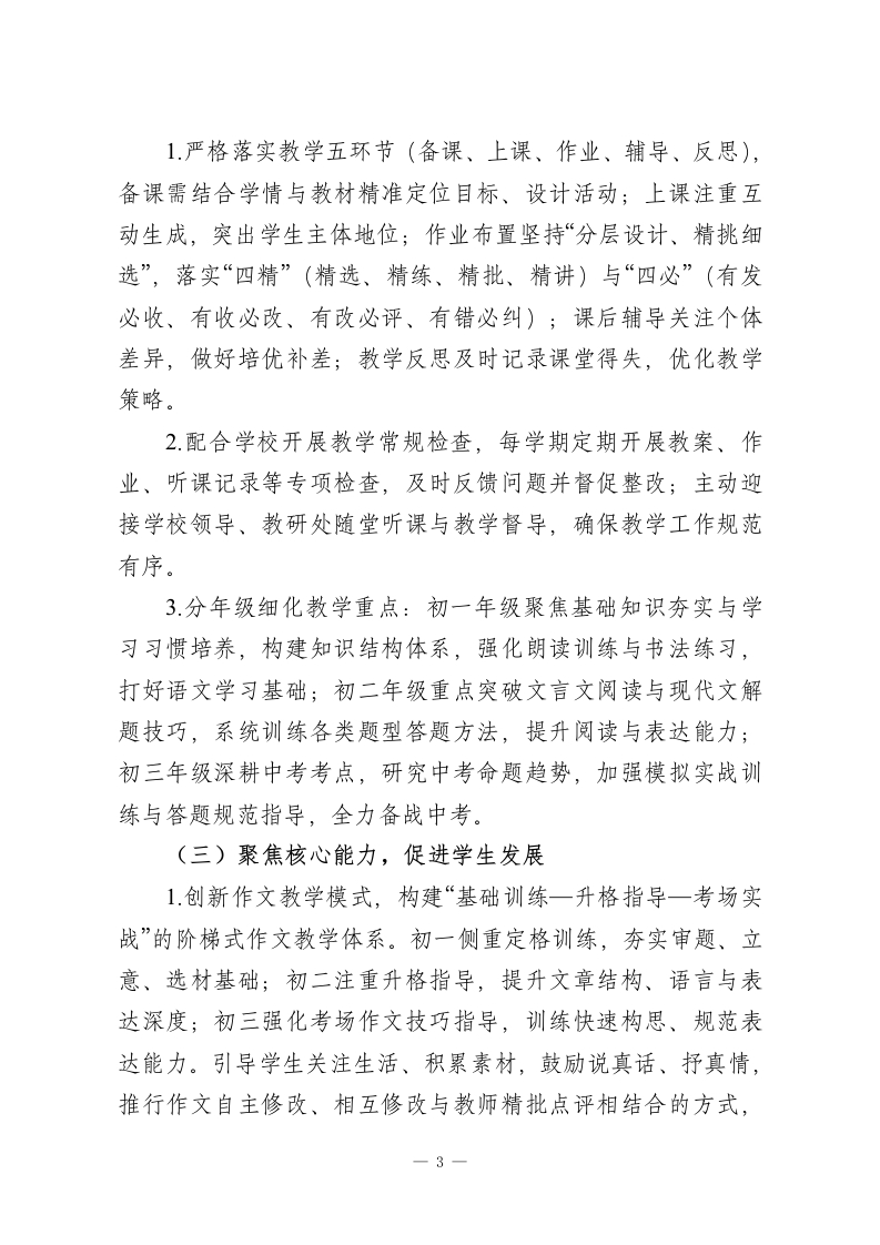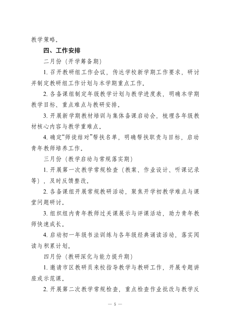 2026年春季第二学期初中语文教研组工作计划一、指导思想本学年第二学期,初中语文教研组将全面贯彻党的教育方针,紧扣学校教研处整体工作部署,以新版《语文课程标准》为根本遵循,深耕部编版教材内涵。聚焦学生语文核心素养培育,强化听说读写综合能力训练与迁移应用,注重学法指导与思维提升。秉持“以生为本、教研赋能、共同成长”的理念,着力打造高效课堂,夯实教学常规,创新教研形式,切实提升语文教学质量,助力学生在语言建构、思维发展、审美鉴赏与文化传承方面实现全面进步。二、工作目标1.深化教材研究与课堂改革,探索符合初中各年级学情的教学模式,推动语文课堂教学效率与质量双提升。2.健全教研机制,丰富教研活动形式,促进组内教师专业成长,打造一支团结协作、业务精湛、勇于创新的语文教师队伍。3.强化学生语文基础,培养良好学习习惯,提升阅读与写作核心能力,稳步提高学生语文综合素养与学业成绩。4.规范教学常规管理,完善评价体系,推进培优补差工作落地见效,实现各年级学生均衡发展。5.打造特色教研品牌,积累优质教学资源与教研成果,为学校语文教育教学持续发展提供有力支撑。1