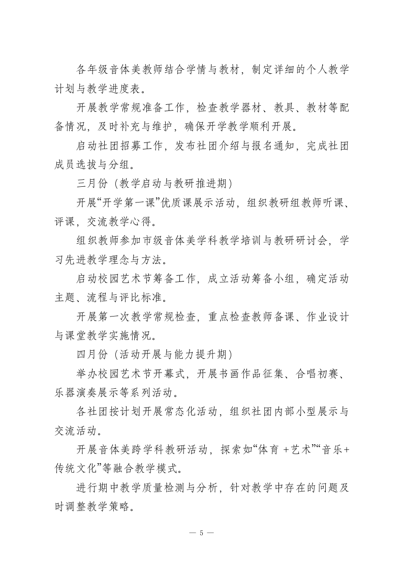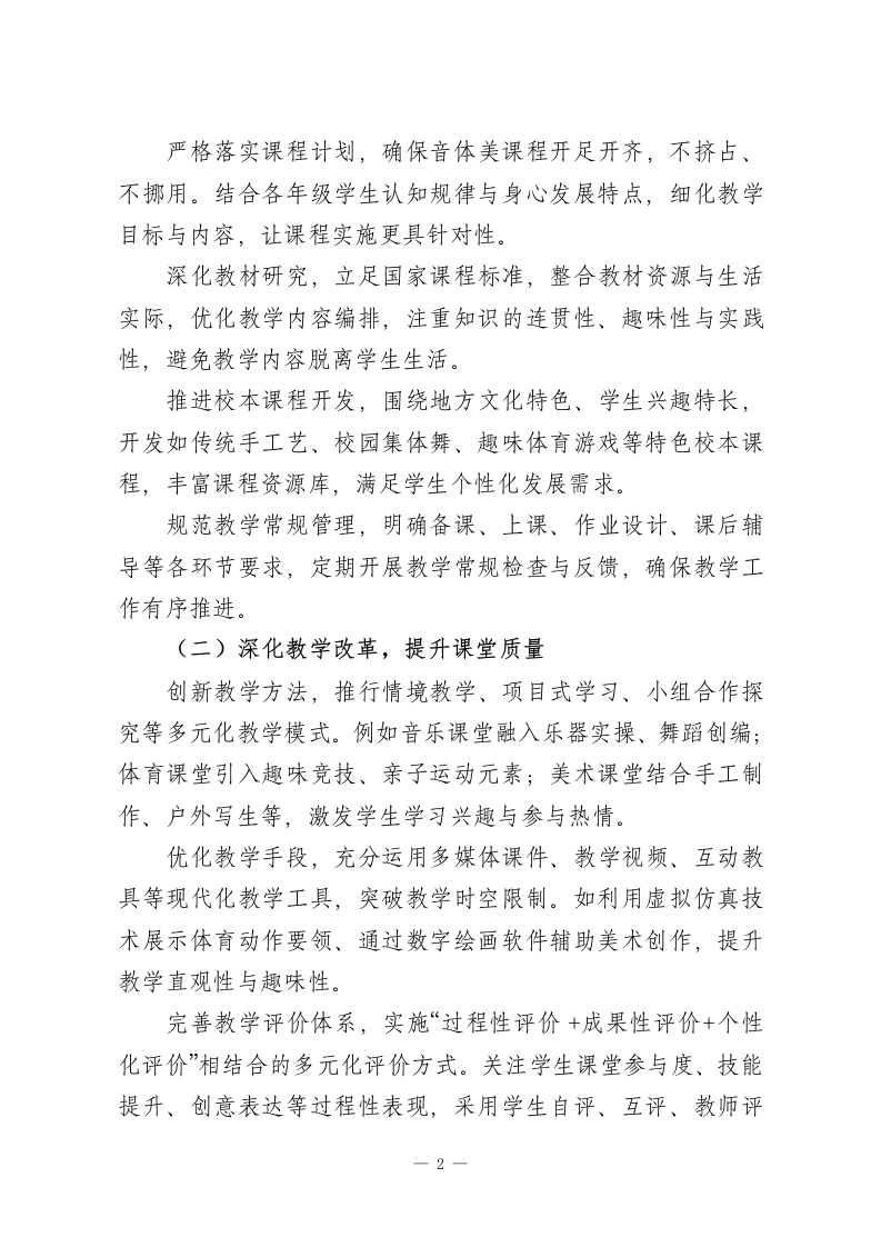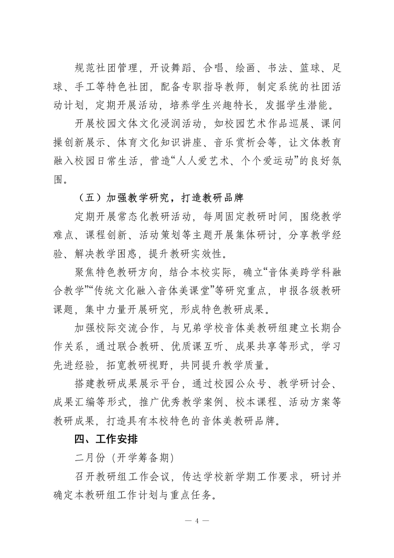 2026年度春季第二学期小学音体美教研组工作计划一、指导思想本学年第二学期,音体美教研组将以学校整体工作计划为核心指引,紧扣“五育并举”育人方针,以提升学生综合素养为根本目标,聚焦审美能力培养与身体素质提升,突出创新精神和实践能力培育。充分整合教研组优质资源,深化课程改革与教学创新,优化教学评价体系,丰富校园文体活动,让音体美教育成为学生全面发展的重要支撑,助力学生成长为身心健康、审美高雅、富有活力的新时代少年。二、工作目标优化课程体系,推动音体美课程规范化、特色化发展,确保课程实施贴合学生年龄特点与成长需求。深化教学改革,创新教学模式与方法,提升课堂教学效率,让音体美课堂更具吸引力、实效性。强化师资队伍建设,通过多元培训与教研活动,提升教师专业素养、教学能力与科研水平。丰富校园文体活动,搭建多元展示平台,提升学生艺术鉴赏力、表现力与身体素质,营造积极向上的校园文化氛围。加强教学研究与成果转化,打造特色教研品牌,形成可推广、可复制的教学与教研成果。三、主要工作及措施(一)完善课程建设,夺实教学基础一1