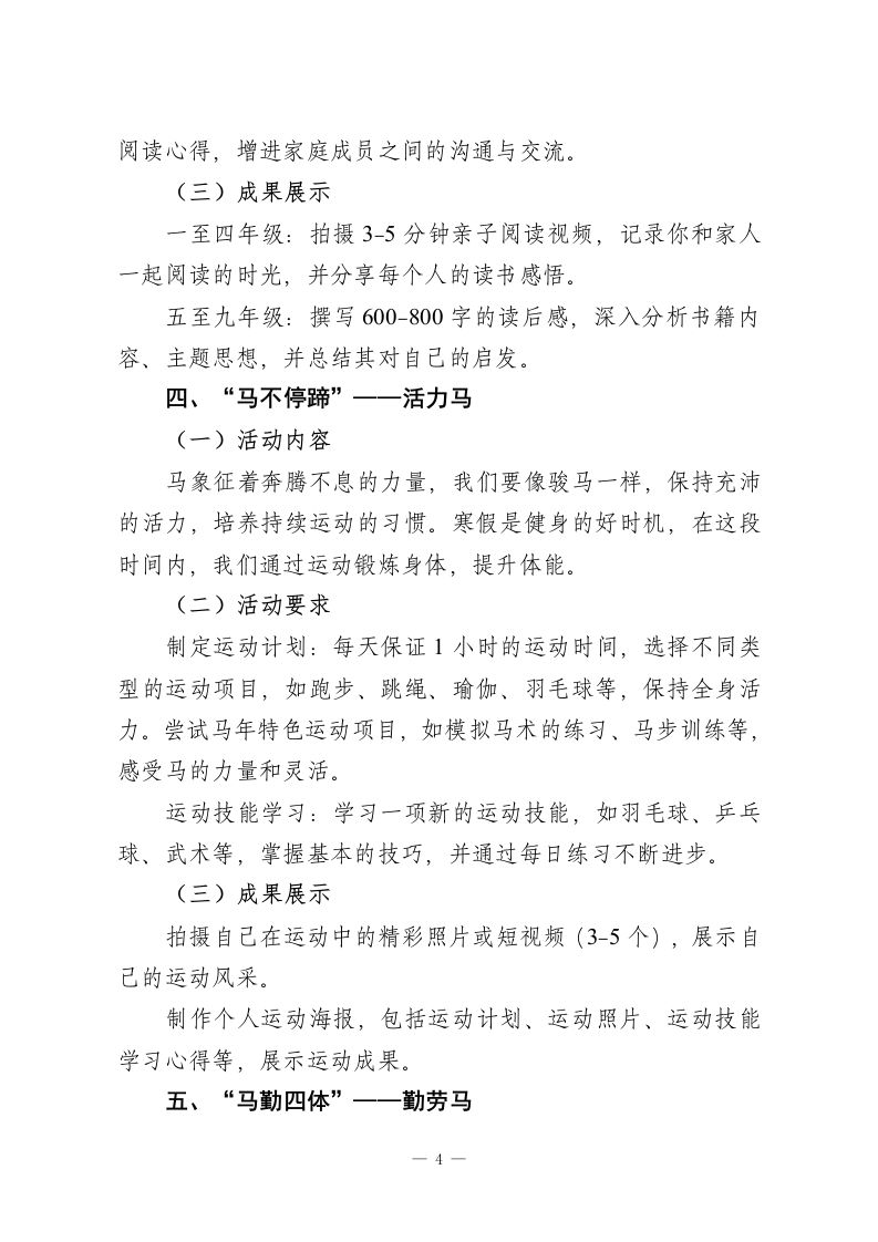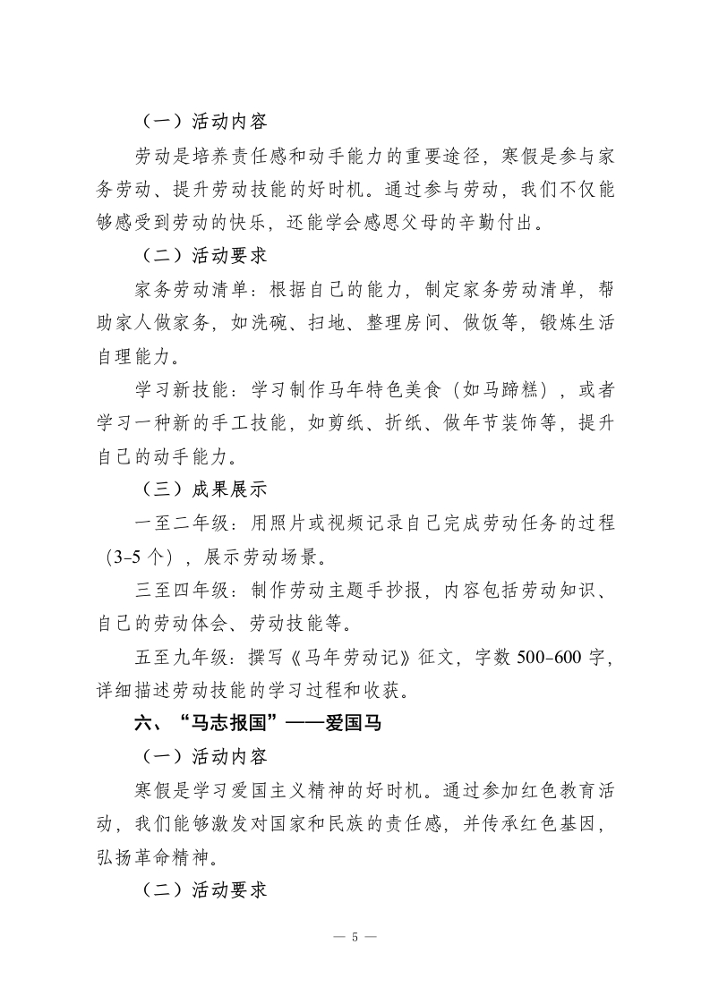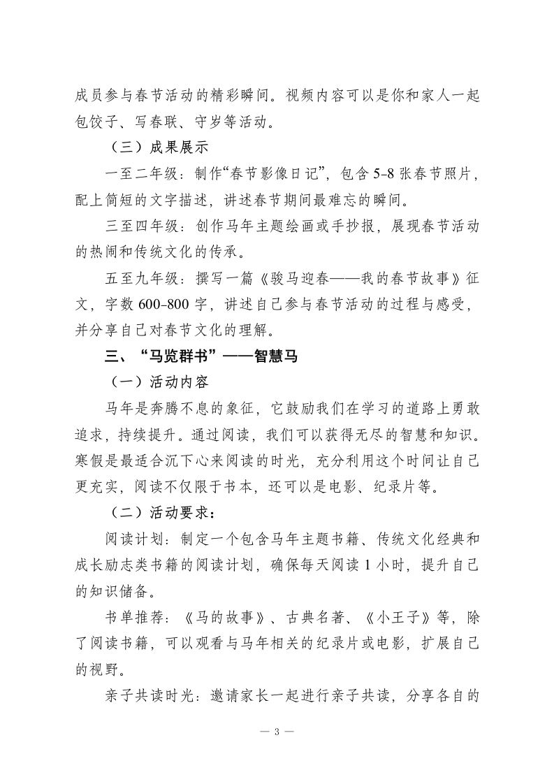 2026年马年德育实践作业一一马驰磊骉志气昂,前程朋朋步步升骏马踏春至,少年奋蹄时!随着2026年马年的到来,我们迎来了充满活力与希望的寒假。马,象征着奔腾不息、勇往直前的精神,正如你们在成长的道路上,正蓄势待发,准备在新的一年里追逐梦想、勇敢前行。为了让大家能够在假期中获得更多的成长,学校精心设计了以“骏马”为主题的寒假德育实践作业。这些活动不仅有助于你们更好地规划假期,体验春节文化、提升品德素养、参与运动锻炼,还鼓励大家勇敢追梦,勇往直前,像马一样,奔腾在各自的道路上,收获不一样的成长与体验。一、“骏马驰骋”一一规划马(一)活动内容寒假是一个短暂的休息时光,但如果没有合理的规划,它很容易变得拖沓和懒散。为了让寒假既充实又有意义,合理规划是关键。你将通过“马年主题规划法”制定一个详细的寒假计划,确保在轻松的氛围中也能提高效率,度过一个充实有意义的假期。(二)活动要求勇往直前:设定一个学习目标,例:阅读一本书、完成一项线上课程等。马不停蹄:设定一个运动目标,例:每天运动30分钟或挑1