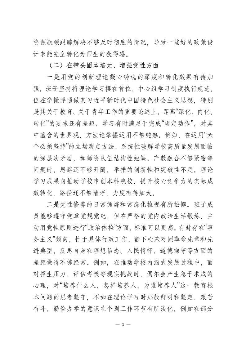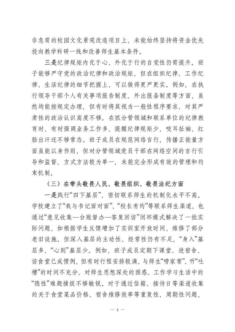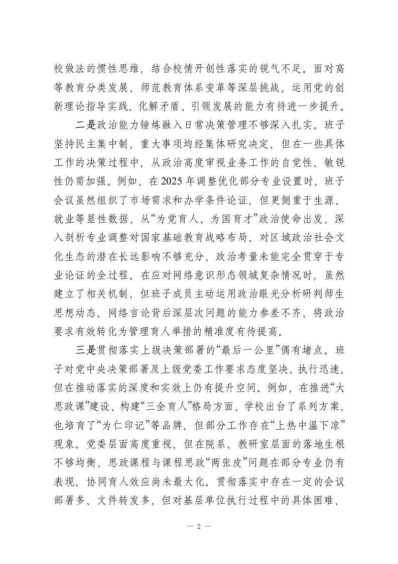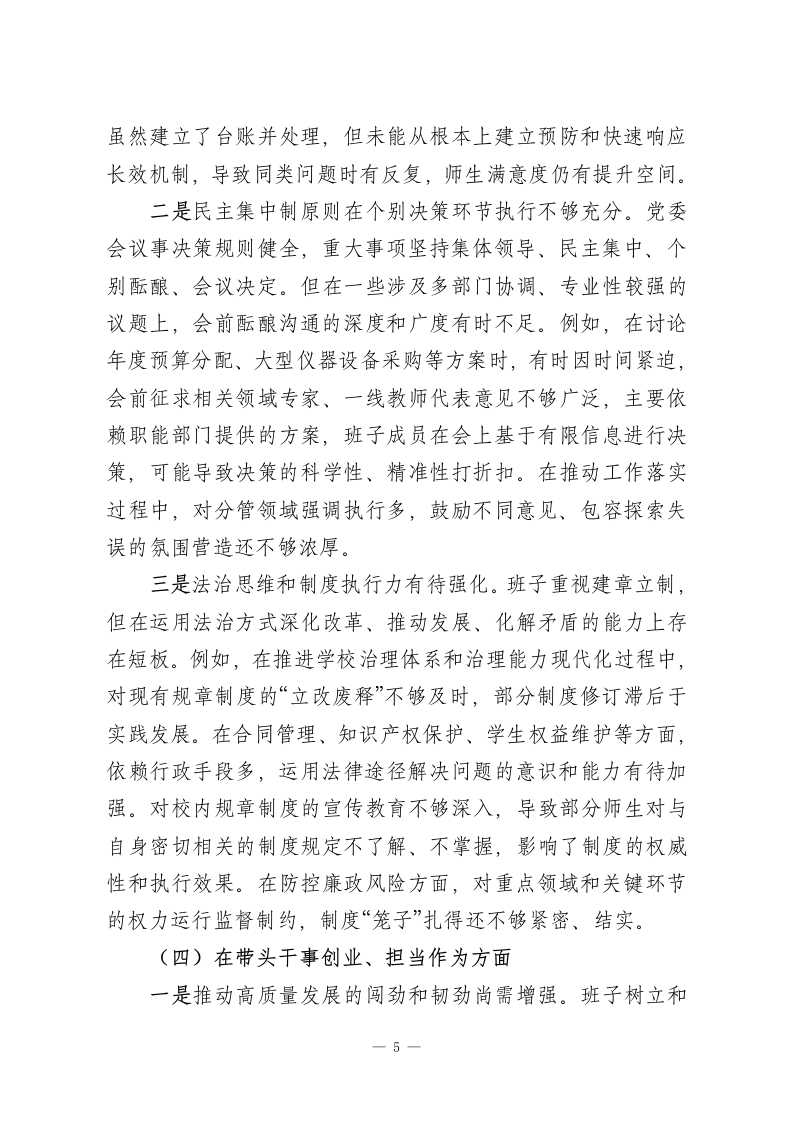 XX高等专科学校党委领导班子2025年度民主生活会对照检查材料(五个带头)根据上级统一部署,学校党委紧扣2025年度民主生活会主题,在深入学习研讨、广泛征求意见、坦诚谈心谈话基础上,紧扣学习贯彻习近平新时代中国特色社会主义思想主线,聚焦党的二十届三中、四中全会战略部署,对照中央八项规定精神及其实施细则,对照本次民主生活会明确的五个方面重点内容,紧密联系班子思想、政治、作风、能力、廉政实际,深入查摆问题,深刻剖析根源,明确整改方向。现将对照检查情况报告如下。一、存在的主要问题党委班子坚持刀刃向内、自我革命,认真对照检视,主要存在以下五个方面问题。(一)在带头强化政治忠诚、提高政治能力方面一是政治判断力、领悟力、执行力与新时代新征程高标准要求尚有差距。班子能够深刻领悟“两个确立”的决定性意义,坚决做到“两个维护”,但在将党的创新理论、中央大政方针与学校改革发展具体实践进行创造性结合上,前瞻性、战略性思考不足。例如,在谋划学校“十五五”发展规划、服务区域发展战略时,虽然强调了对接地方需求,但对如何将“稳定、发展、生态、强边”四件大事的内涵要求深度融入师范教育体系,转化为具体学科专业建设和人才培养方案,缺乏系统性的顶层设计和破题举措,一定程度上存在等待上级明确指示、参照兄弟院-1