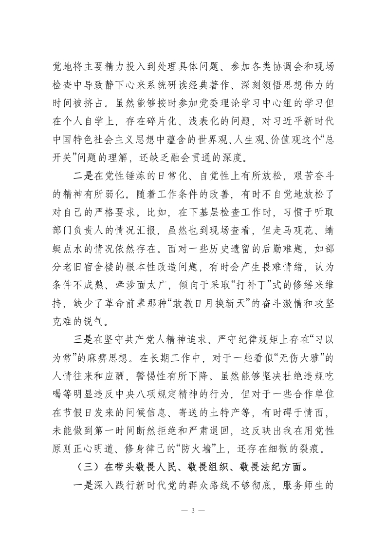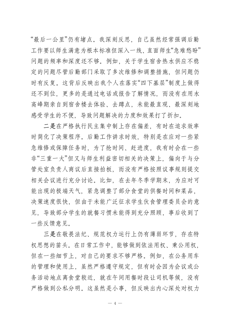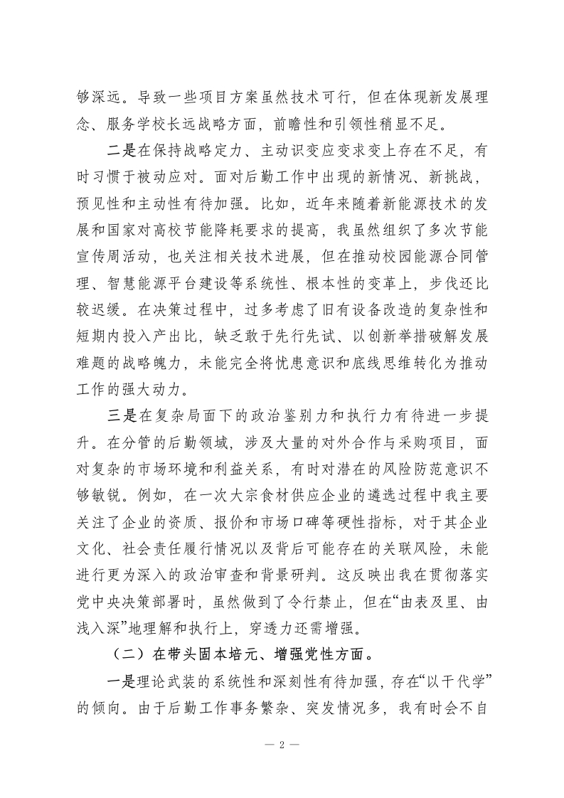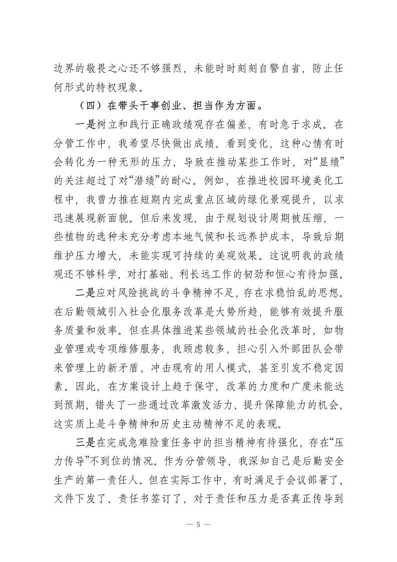XX高中分管后勤副校长2025年度民主生活会个人对照检查材料(五个带头)根据学校党委关于召开2025年度民主生活会的统一部署,我紧扣本次民主生活会主题,在深入学习领会习近平新时代中国特色社会主义思想、党的二十届三中、四中全会精神,以及习近平总书记重要讲话和重要指示批示精神的基础上,特别是结合深入贯彻中央八项规定精神学习教育,我进行了深刻的党性分析和自我剖析。通过广泛征求意见、深入谈心谈话,我认真查摆了自身在思想、政治、作风、能力、廉洁等方面存在的差距和不足。现将个人对照检查情况报告如下。一、存在的主要问题对照本次民主生活会重点查摆的5个方面内容,我坚持把自己摆进去、把职责摆进去、把工作摆进去,深入检视,发现自身仍存在一些亟待解决的问题。(一)在带头强化政治忠诚、提高政治能力方面。一是理论学习与后勤工作实践结合不够紧密,存在一定的“两张皮”现象。在将“两个确立”的决定性意义转化为推动后"勤高质量发展的具体行动上,思考的深度和谋划的精度仍有欠缺。例如,在推进校园基础设施“十五五”规划前期论证时,我更多地从技术参数、资金预算和建设周期等业务角度考量,但在如何将规划全面对标对表党中央关于绿色发展、节能减排的战略部署,如何通过后勤工作的提质增效来服务学校“双一流”建设和立德树人根本任务这一政治高度上,站位还不够高,谋划不—1