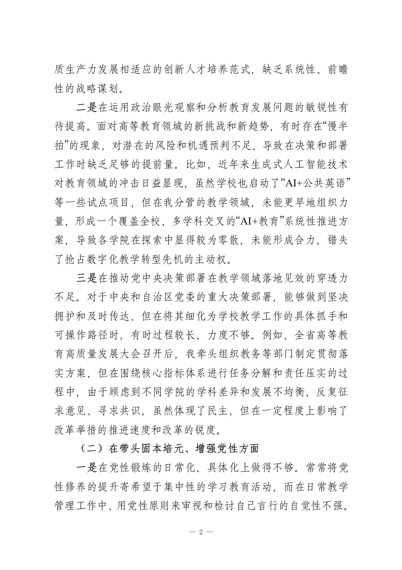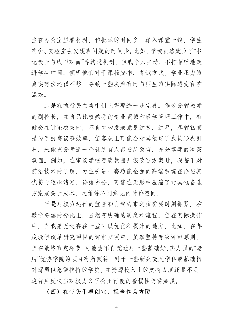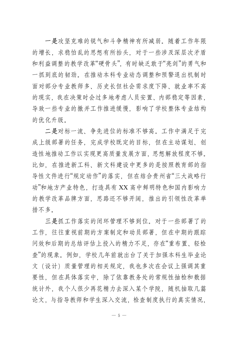 XX高中领导班子成员2025年度民主生活会个人对照检查材料(五个带头)按照学校党委关于召开2025年度民主生活会的统一部署和要求,我紧扣本次民主生活会主题,会前系统学习了习近平新时代中国特色社会主义思想,深入领会了党的二十届三中、四中全会精神和习近平总书记关于党的建设的重要思想,并结合近期关于深入贯彻中央八项规定精神的专题学习教育,广泛征求了分管领域和基层联系点的意见建议,与班子成员、分管部门负责同志深入开展了谈心谈话。在此基础上,我严格对照“带头强化政治忠诚、提高政治能力“带头固本培元、增强党性“带头敬畏人民、敬畏组织、敬畏法纪”“带头干事创业、担当作为”“带头坚决扛起管党治党责任”等五个方面,深入查摆自身存在的问题,深刻剖析问题根源,明确了今后的努力方向和整改措施。现将个人对照检查情况报告如下。一、存在的主要问题(一)在带头强化政治忠诚、提高政治能力方面一是在将政治理论学习成果转化为指导教学工作的具体实践上存在差距。虽然能够坚持参加党委理论学习中心组的集体学习和个人自学,但有时满足于通读文件、记录要点,对于一些新思想、新论断的深层次逻辑和实践要求钻研不够。例如,在学习领会“新质生产力”对高等教育人才培养提出的新要求时,我的思考更多地停留在推动专业课程设置和教学内容更新的层面对于如何从根本上重塑教学理念、改革评价体系、构建与新1
