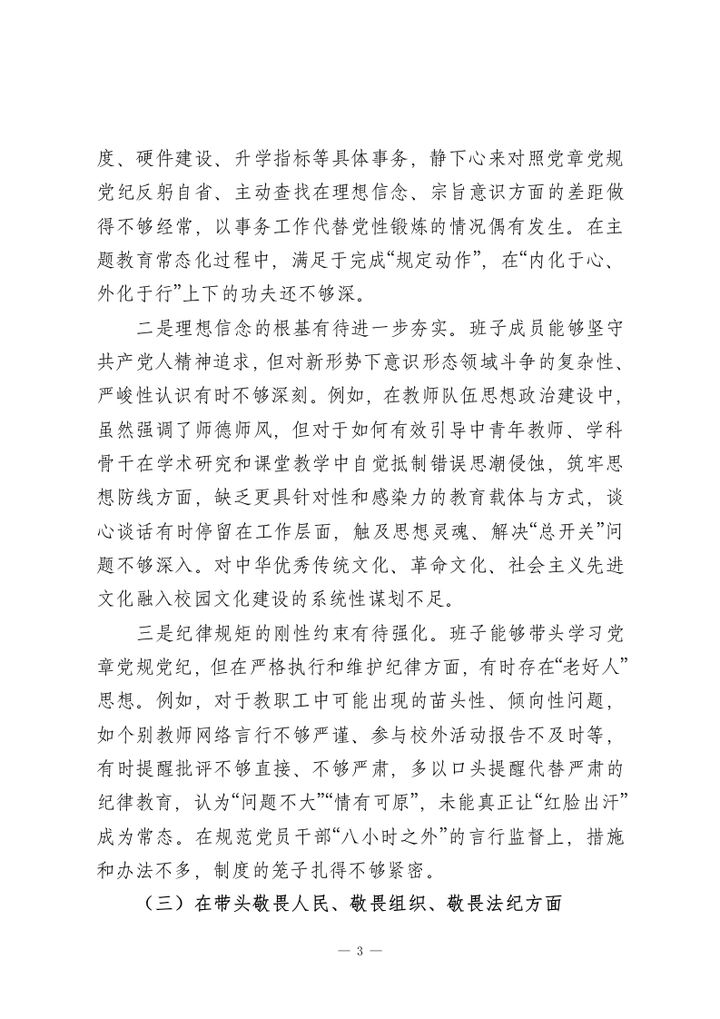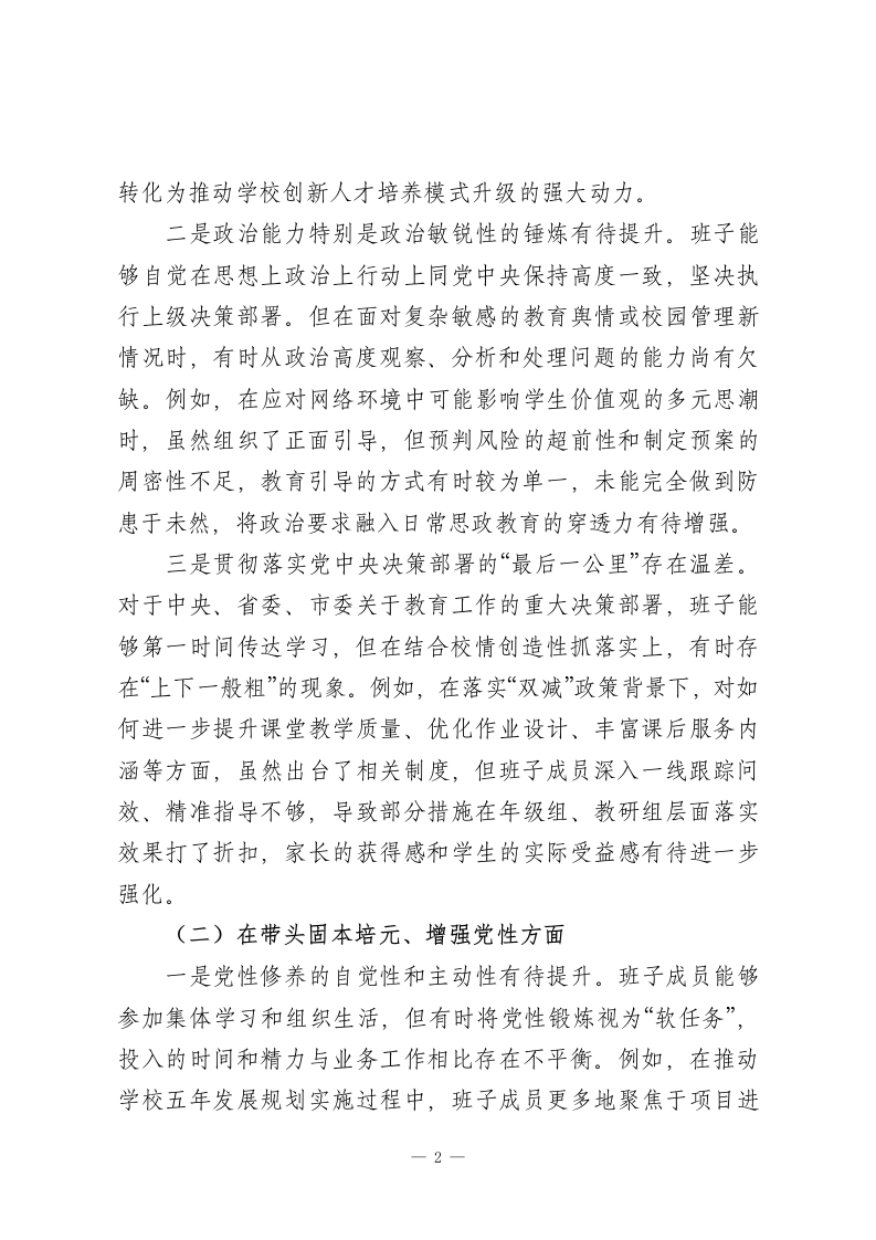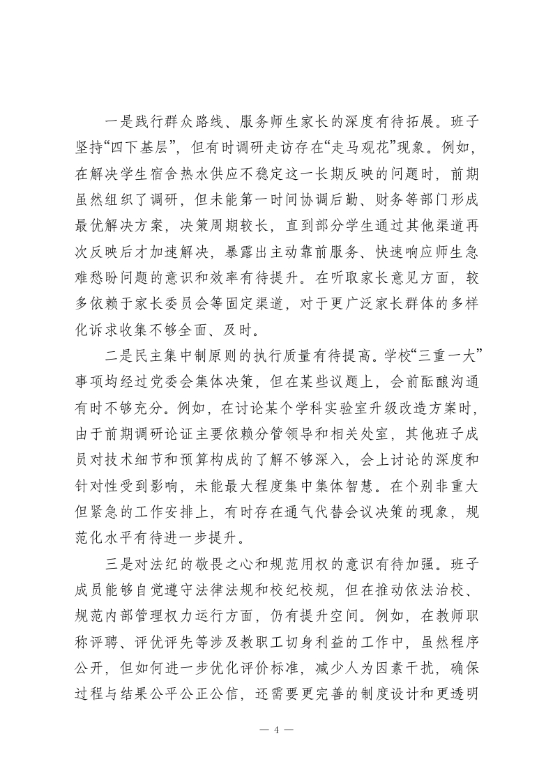 XX市第一中学党委2025年度民主生活会班子对照检查材料(五个带头)根据上级统一部署,XX市第一中学党委班子紧扣2025年度民主生活会主题,在深入学习党的二十届四中全会精神和系列重要文件精神、广泛征求意见建议、坦诚开展谈心谈话的基础上,严格对照五个方面重点内容,深入查摆突出问题,深刻剖析思想根源,明确整改方向措施。现将班子对照检查情况报告如下。一、存在的主要问题党委班子坚持问题导向,紧密联系学校工作实际,把自己摆进去、把职责摆进去、把工作摆进去,认真检视反思,查摆出以下突出问题。(一)在带头强化政治忠诚、提高政治能力方面一是理论武装的深度和转化效果有待加强。班子能够坚持“第一议题”制度,及时组织学习党的创新理论和重要指示精神,但在系统把握、融会贯通上还存在差距。例如,在结合学校实际贯彻落实党的教育方针,特别是将“发展素质教育”等宏观要求转化为具体的课程改革和评价体系改革举措时,思路不够开阔,举措创新性不足,有时仍习惯于参照既有模式,导致部分改革推进缓慢,与高质量发展的要求存在距离。对习近平新时代中国特色社会主义思想中关于教育、科技、人才“三位一体”战略部署的深层逻辑和实践路径研究不够透彻,未能完全将其1