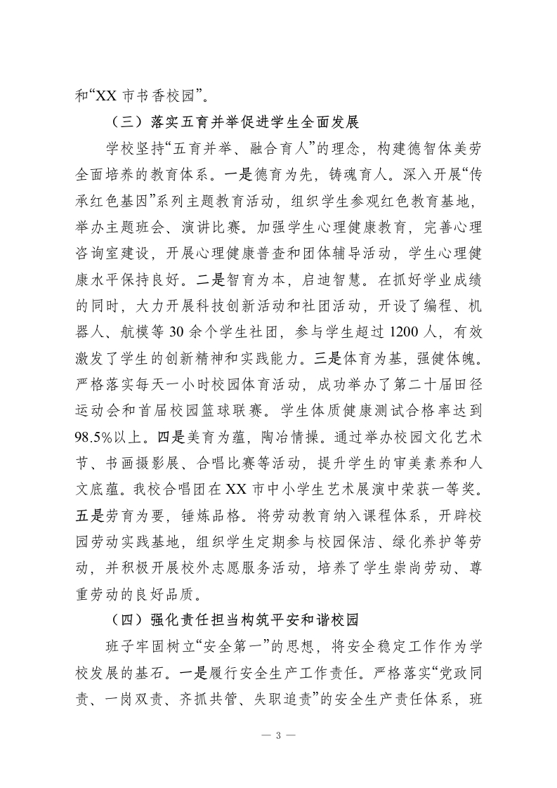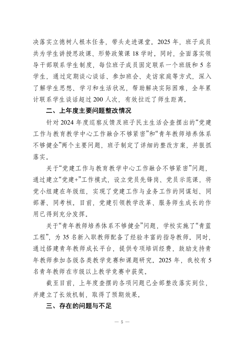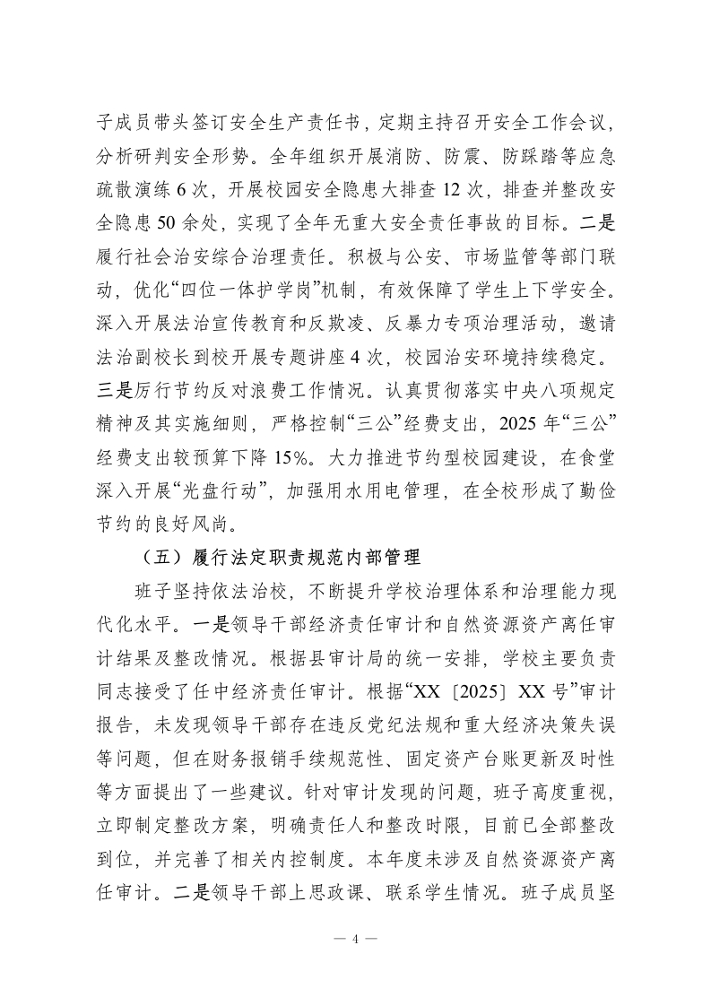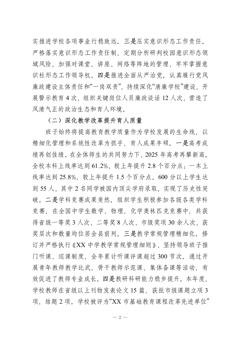 XX县第X中学领导班子2025年度述职述廉报告2025年,XX县第X中学领导班子在县委、县政府和县教育局的坚强领导下,坚持以习近平新时代中国特色社会主义思想为指导,深入学习贯彻党的二十大和二十届三中、四中全会精神,全面贯彻党的教育方针,紧紧围绕立德树人根本任务,团结带领全校师生员工,锐意进取,攻坚克难,圆满完成了年度各项目标任务,推动学校各项事业呈现出高质量发展的良好态势。现将班子2025年度履职及廉洁自律情况报告如下。一、年度目标任务完成情况(一)坚持党建引领筑牢思想根基学校领导班子始终将政治建设摆在首位,深刻领悟“两个确立”的决定性意义,增强“四个意识”、坚定“四个自信”、做到“两个维护”。一是深化理论武装。坚持“第一议题”制度,通过党总支理论学习中心组学习、专题读书班等形式,组织班子成员及中层干部系统学习《习近平著作选读》等重要文献,全年组织集中学习研讨24次,班子成员撰写心得体会30余篇,切实做到学思用贯通、知信行统一。二是树立和践行正确政绩观。班子成员深刻认识到,办好人民满意的教育是最大的政绩。在工作中,坚决摒弃急功近利的短期行为和华而不实的“形象工程”,坚持教育规律,聚焦内涵发展,将工作的出发点和落脚点放在提升教育教学质量、促进学生全面发展和增强教师幸福感上,以“功成不必在我”的精神境界和“功成必定有我”的历史担当,扎—1