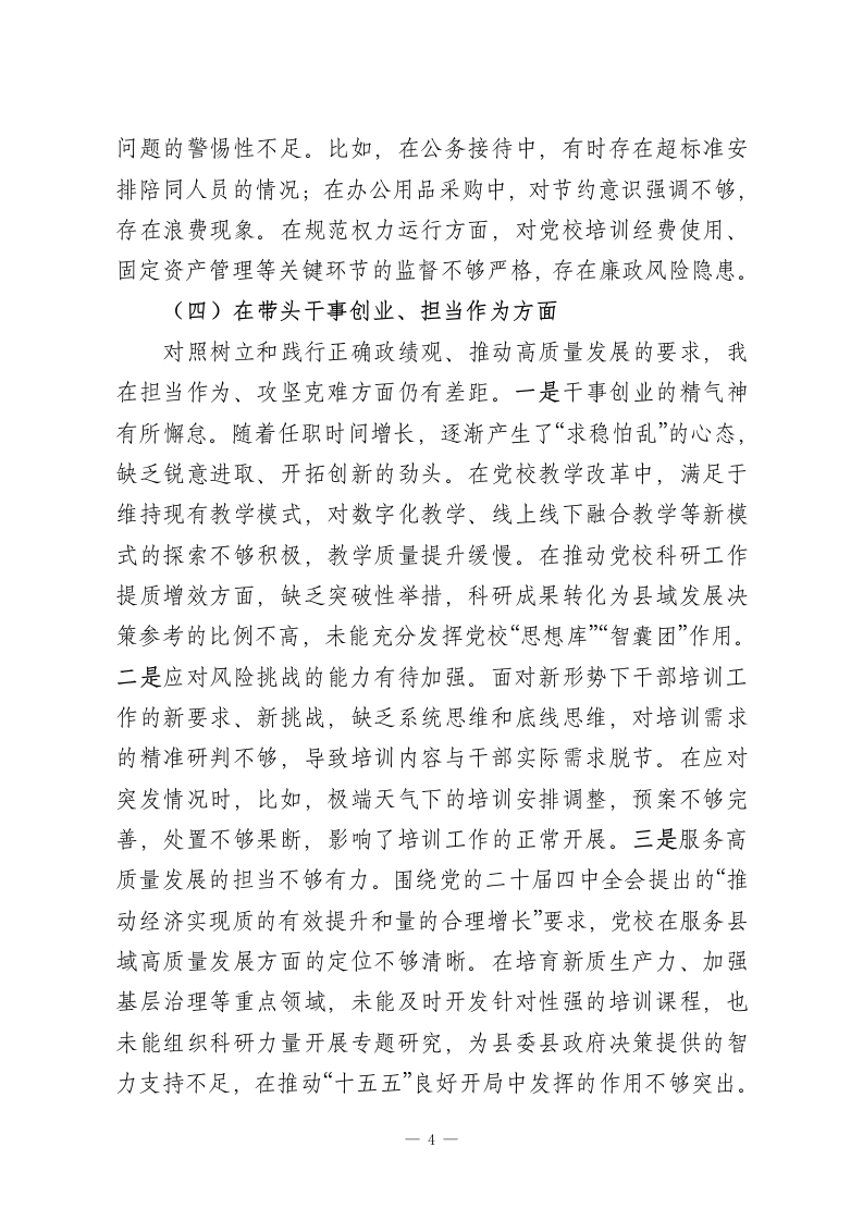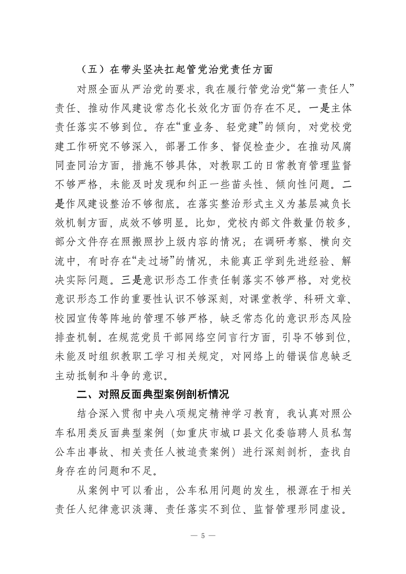 XX县委党校校长2025年度民主生活会对照检查材料1根据县委关于召开2025年度民主生活会的统一部署和要求,我紧扣会议主题,深入学习贯彻党的二十届四中全会精神,扎实参与深入贯彻中央八项规定精神学习教育,紧密联系思想、工作和作风实际,通过自我查摆、谈心谈话、征求意见等方式,全面对照“五个方面”要求,深刻查摆问题不足,深入剖析根源症结,明确整改方向措施。同时,对照酒驾、公车私用类反面典型案例开展警示教育,进一步筑牢思想防线。现将对照检查情况报告如下:一、存在的主要问题(一)在带头强化政治忠诚、提高政治能力方面作为县委党校校长,我始终把政治建设摆在首位,但对照深刻领悟“两个确立”的决定性意义,增强“四个意识”、坚定“四个自信”、做到“两个维护”的核心要求,仍存在一些短板。一是政治理论学习的深度和系统性不足。对习近平新时代中国特色社会主义思想和党的二十届四中全会精神的学习,多停留在会议传达、文件通读层面,缺乏“钻进去*“深下去”的钻研精神,对全会提出的“加快高水平科技自立自强,积极发展新质生产力”等重大部署,结合党校教学科研工作的思考不深、转化不够,未能及时将全会精神精准融入干部培训课程体系。在学习贯彻“两个确立”的决定性意义时,满足于掌握核心要义,但在引导教职工和学员深刻理解其历史逻辑、理论逻辑、实践逻辑方面,1