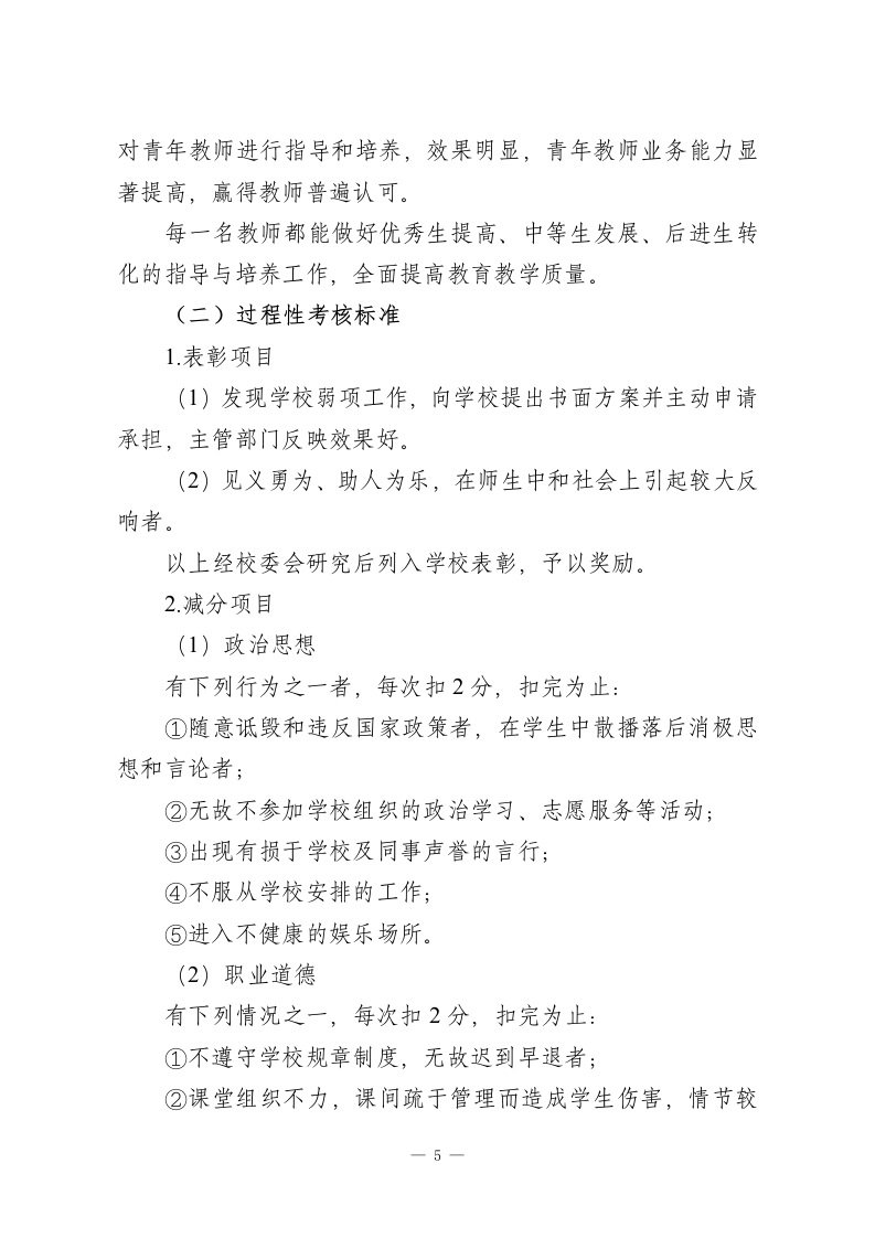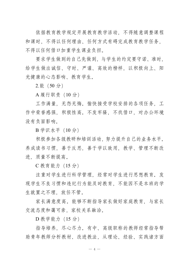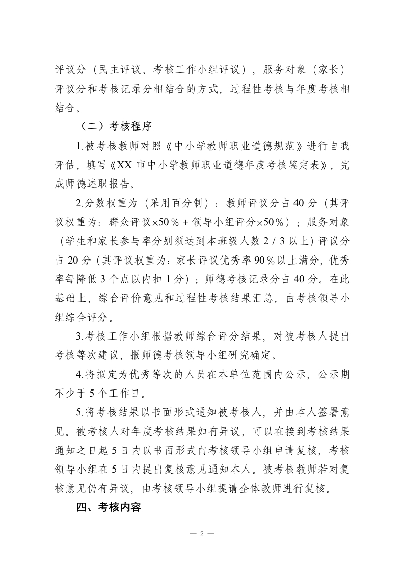 XX小学教师职业道德考核方案为进一步加强师德师风建设,不断提升学校教师队伍的师德水平,建设一支师德高尚、业务精湛的高素质师资队伍。依据《教师法》、《中小学教师职业道德规范》、《XX市中小学教师职业道德考核办法》(X[2013]X号)以及2022年《XX区“强师德严作风”专项整治活动实施方案》的文件精神,结合本校实际,特制定本考核办法。一、考核原则1.以人为本、激励为主。考评的各项规定和标准要起到正面引导和规范的作用。充分调动广大教职工的主动性、积极性和创造性,鼓励教师通过集体教育和自我教育不断提升道德素养。2.客观公正、实事求是。实行考核标准、考核过程和考核结果三公开,力求全面客观、实事求是评价教师的职业道德情况。3.奖优罚劣、促进发展。坚持发挥考核的导向作用,奖优罚劣,引导教师认真践行师德规范,不断提高师德修养和教育教学能力。二、考核对象本校所有被聘的在职在岗教职工三、考核形式和程序(一)考核形式教师职业道德考核与教职工年度考核结合进行。采取教师-1