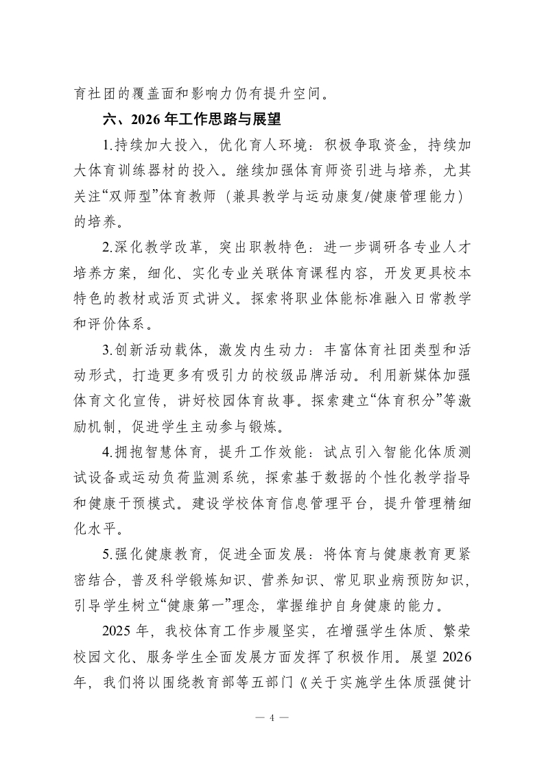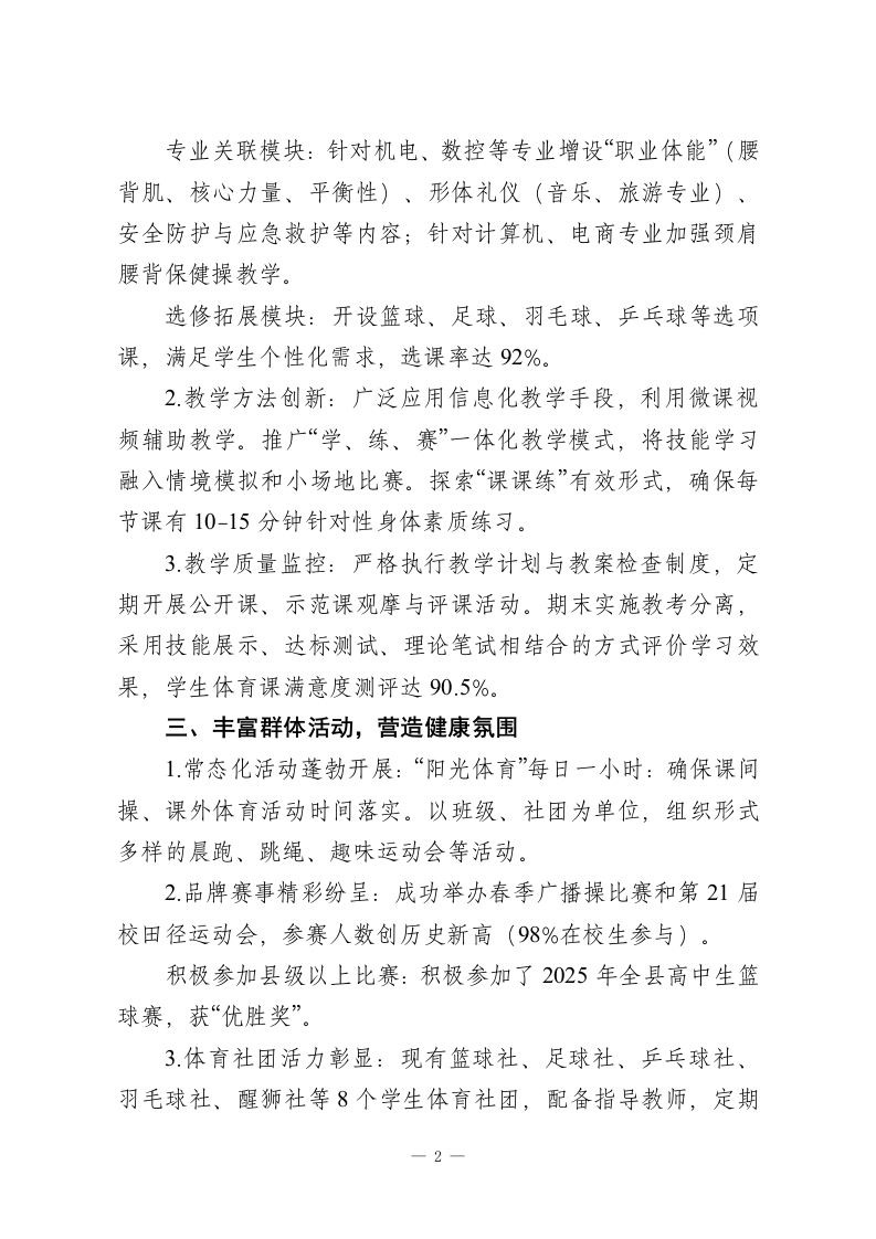 XX学校2026年度学校体育工作开展情况2025年,我校体育工作紧密围绕立德树人根本任务,深入贯彻《关于全面加强和改进新时代学校体育工作的意见》精神,立足中职学生身心发展特点与未来职业素养需求,以提升学生体质健康水平、培养终身体育意识、塑造健全人格为核心目标,系统规划,扎实推进,取得了显著成效。现将全年工作总结如下:一、强化顶层设计,完善工作机制1.制度保障有力:修订完善《学校体育工作条例》《学生体质健康测试管理办法》《体育竞赛奖励办法》等制度,将体育工作纳入学校年度工作计划和部门考核体系,明确各部门职责分工,形成“校长领导、教务统筹、体育组主责、部门协同、全员参与”的工作格局。2资源投入持续:积极争取经费支持,完成田径场塑胶跑道翻新、部分篮球场硅PU铺设升级。新增适合不同专业特点的专项训练器材为教学与活动开展提供坚实硬件支撑。3师资队伍建设:组织体育教师参加市、县级体育教学改革培训共3人次,努力提高体育教师的待遇。二、深化教学改革,提升课堂质量1.课程体系优化:在开足开齐国家规定课程基础上,结合中职特色,构建“基础模块+专业关联模块+选修拓展模块”的课程结构。基础模块:强化田径、体操、球类等基础技能与体能训练。1