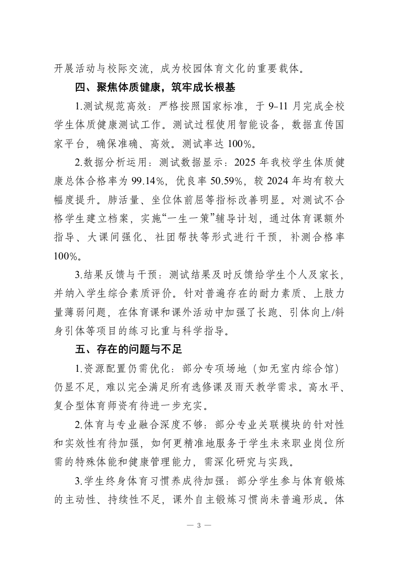XX学校2026年度学校体育工作开展情况2025年,我校体育工作紧密围绕立德树人根本任务,深入贯彻《关于全面加强和改进新时代学校体育工作的意见》精神,立足中职学生身心发展特点与未来职业素养需求,以提升学生体质健康水平、培养终身体育意识、塑造健全人格为核心目标,系统规划,扎实推进,取得了显著成效。现将全年工作总结如下:一、强化顶层设计,完善工作机制1.制度保障有力:修订完善《学校体育工作条例》《学生体质健康测试管理办法》《体育竞赛奖励办法》等制度,将体育工作纳入学校年度工作计划和部门考核体系,明确各部门职责分工,形成“校长领导、教务统筹、体育组主责、部门协同、全员参与”的工作格局。2资源投入持续:积极争取经费支持,完成田径场塑胶跑道翻新、部分篮球场硅PU铺设升级。新增适合不同专业特点的专项训练器材为教学与活动开展提供坚实硬件支撑。3师资队伍建设:组织体育教师参加市、县级体育教学改革培训共3人次,努力提高体育教师的待遇。二、深化教学改革,提升课堂质量1.课程体系优化:在开足开齐国家规定课程基础上,结合中职特色,构建“基础模块+专业关联模块+选修拓展模块”的课程结构。基础模块:强化田径、体操、球类等基础技能与体能训练。1