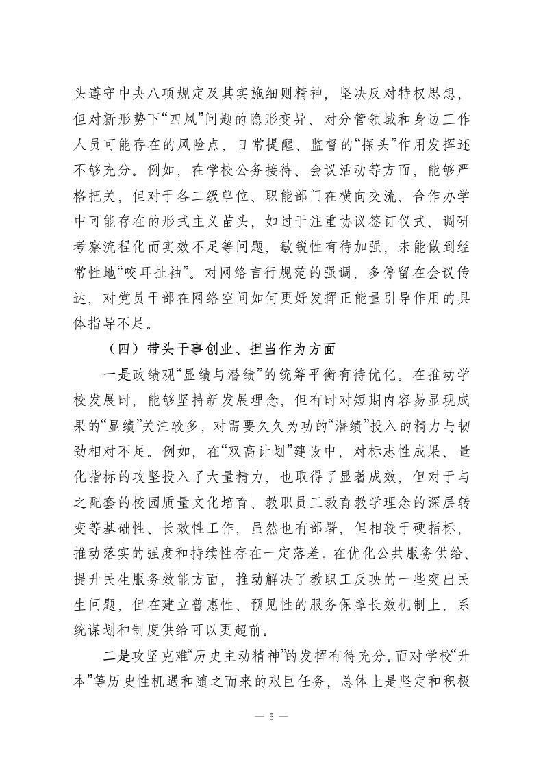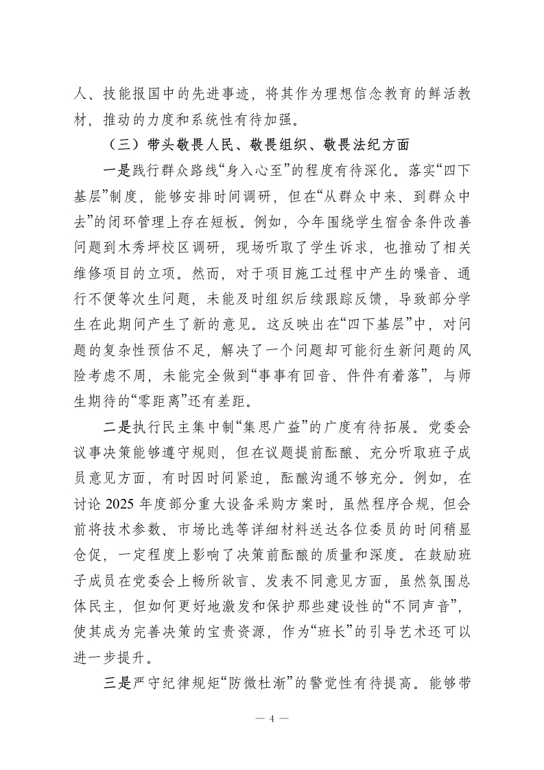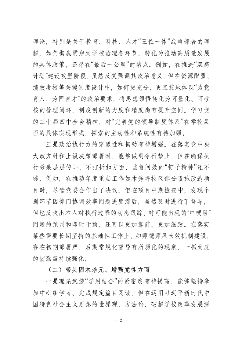 XX职业技术学院党委书记2025年度民主生活会个人对照检查材料(五个带头)根据本次民主生活会主题要求,本人紧扣深入学习贯彻习近平新时代中国特色社会主义思想,全面贯彻落实党的二十届三中、四中全会精神,以及锲而不舍落实中央八项规定精神、推进作风建设常态化长效化的核心要义,在深入开展学习研讨、广泛征求意见建议、坦诚进行谈心谈话的基础上,严格对照“五个带头”要求,紧密联系个人思想、职责和工作实际,进行了深刻的自我剖析和反思。现将个人对照检查情况报告如下。一、存在的主要问题(一)带头强化政治忠诚、提高政治能力方面一是政治判断力的前瞻性和敏锐性有待加强。面对职业教育领域深刻变革和区域发展新形势,有时对潜在的风险挑战和机遇辨识不够及时、精准。例如,在谋划学校“十五五”发展规划前期工作时,虽然组织了多轮研讨,但对国家关于职业技术大学设置政策的深层导向和可能带来的连锁反应,研判的深度和预见性尚有不足,更多侧重于对标既有指标,导致部分规划内容的前瞻布局不够大胆,与地方产业未来需求的超前对接思考可以更进一步。在贯彻“稳定、发展、生态、强边”四件大事结合职业教育落地时,对“稳定”与“发展”的内在统一性把握,有时在具体工作部署中未能完全做到同步谋划、一体推进,存在一定的时序差。二是政治领悟力的贯通性和转化度有待提升。对党的创新1