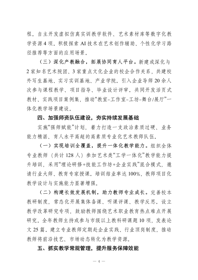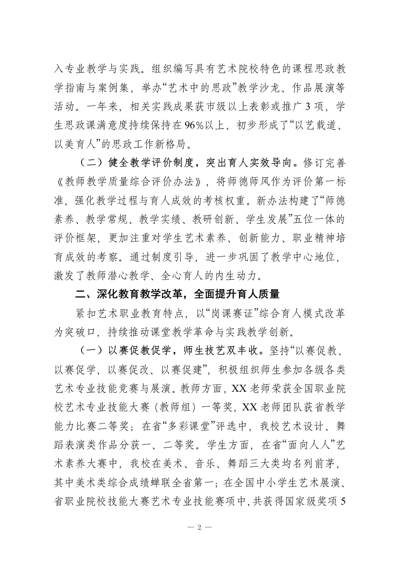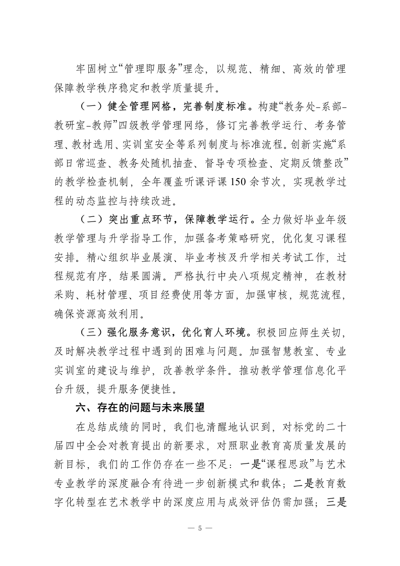 XX中职艺术学校教务处2025年工作总结2025年,我校教务处始终坚持以习近平新时代中国特色社会主义思想为指导,深入学习贯彻党的二十届四中全会精神,紧紧围绕立德树人根本任务,恪守为党育人、为国育才初心使命,以推动艺术职业教育高质量发展为主线,以深化教育教学改革为核心,以强化常规管理为保障,统筹推进思政铸魂、教学提质、专业创新、师资强化与管理增效各项工作,圆满完成年度各项目标任务,为学校内涵式发展奠定了坚实基础。现将全年工作总结如下:一、强化思想政治引领,筑牢立德树人根基教务处始终坚持将政治建设摆在首位,将党的二十届四中全会精神实质融入教育教学全过程。通过组织专题学习、融入课程思政、开展主题教育等多种形式,引导全体教师深刻把握新时代教育工作的方向与要求,不断增强“四个意识”、坚定“四个自信”、做到“两个维护”。同时,严格贯彻落实中央八项规定精神及其实施细则,持续加强作风建设,在各类教学管理、评审评价、项目建设等工作中,厉行勤俭节约,规范工作程序,营造了风清气正、务实高效的教学管理生态。(一)深化“思政+艺术”融合,构建特色育人体系。将思政课建设作为“铸魂工程”抓实抓细,积极探索艺术类专业课程与思想政治理论课同向同行的有效路径。充分挖掘艺术作品中蕴含的爱国情怀、民族精神、时代价值,将社会主义核心价值观、中华优秀传统文化、革命文化、社会主义先进文化有机融1