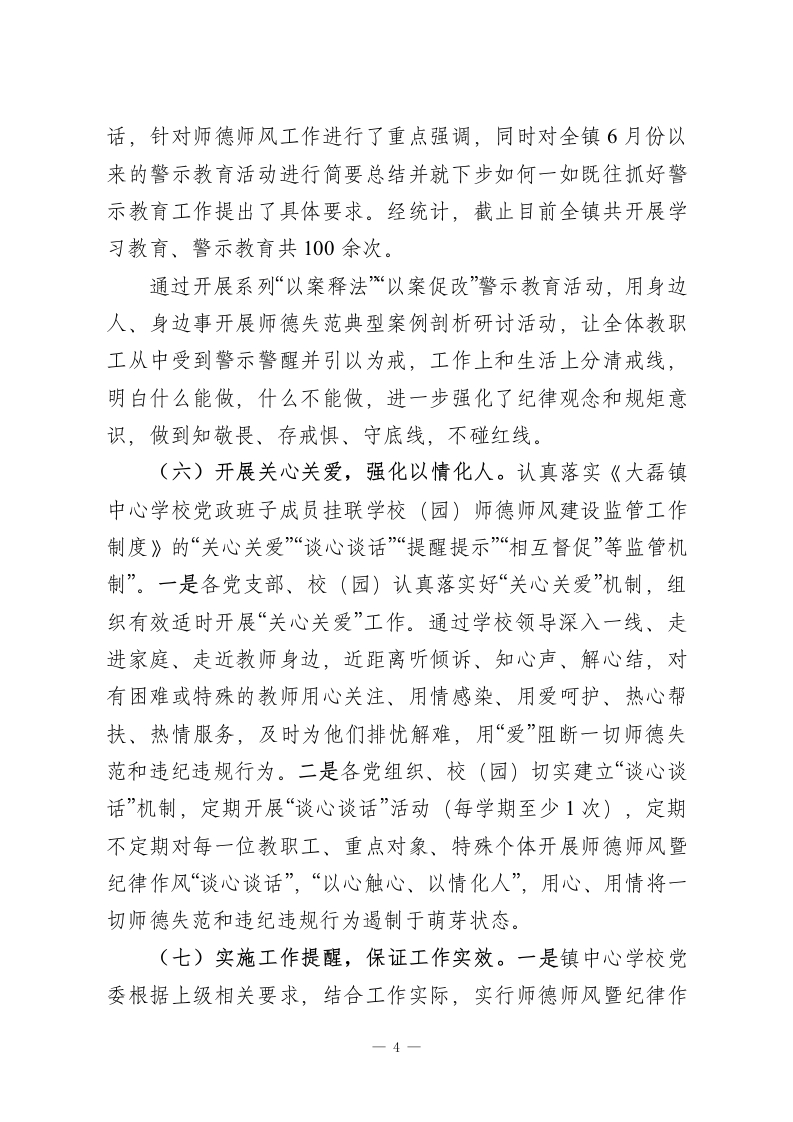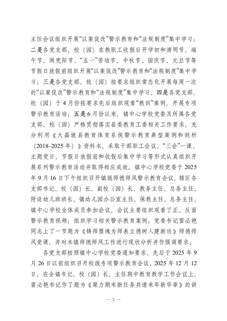 大磊镇中心学校党委年度师德师风暨纪律作风建设工作总结大磊镇中心学校2025年的师德师风暨纪律作风建设工作在上级教育行政主管部门的正确指导和镇中心学校党委的直接领导下,全面贯彻落实《中共中央、国务院关于弘扬教育家精神加强新时代高素质专业化教师队伍建设的意见》精神和上级相关师德师风建设要求,建立挂联监管机制,落实警示教育,落实师德师风暨纪律作风“月提醒”,落实过程严管厚爱,落实排查整治,师德师风建设得到加强,师德失范及违纪违规行为有效防范。现总结如下:一、工作开展情况及成效(一)健全工作机制,压实工作责任。修订《大磊镇中心学校党政班子成员挂联学校(园)师德师风建设监管工作制度》并严格执行,实行“镇中心学校党政班子成员挂联各党支部和各学校(园)中层以上领导班子成员、各党支部和学校(园)领导班子成员挂联本支部、本校(园)教职员工、党员教师与非党员教师,骨干、名师、学科带头人与一般教师(教师与教师)》结对挂联(互联)”机制,明确挂联职责,压实层层挂联监管责任。各党支部、学校(园)、挂联人充分发挥挂联监管作用,对挂联对象全面负责。采取定期与不定期深入了解挂联对象思想动态及师德师风情况,随时对其学习、生活、工作等行为进行监督管理,掌握相应情况,针对存在问题,多形式加强师德师风警示教育,落实谈心谈话、关心关爱、提醒提示等跟踪监1