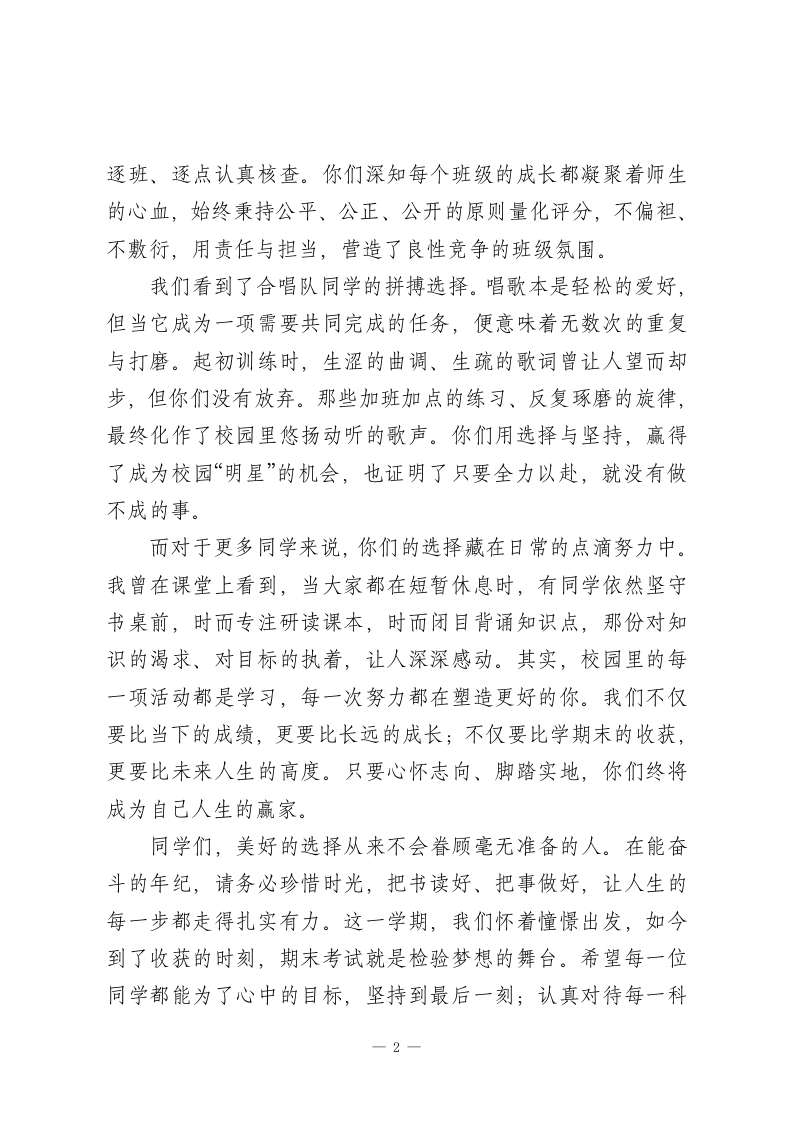 德育副校长期末国旗下讲话:以梦为帆,不负韶华同学们:大家早上好!时光荏苒,转眼间一个学期的旅程即将抵达终点,明天,我们就将迎来期末考试,用笔墨书写这一学期的成长与收获。面对即将到来的检验,面对未来更高阶段的征程,你们是否已做好充分准备?有哲人曾说:“真正的财富,不是金钱与物质,而是选择的机会与把握机会的能力。”而你们,正处于人生中最富朝气与可能的年纪,拥有无数选择的权利,从这个意义上说,你们都是真正的“富翁”。这一学期,每一位同学都在用自己的选择,书写着青春的答卷。我们看到了“文明之星”的坚定选择。各班评选出的文明使者们,身披绶带坚守在校园的各个角落,无论风雨寒暑,始终以自身行动弘扬文明风尚,耐心劝阻不文明行为。正是这份坚守,让校园里随手丢弃的纸屑少了,踩踏草坪的身影不见了,追逐打闹的场景消失了,文明之花在校园的每一个角落静静绽放。你们用选择,定义了校园的美好。我们看到了学生会成员的责任选择。清晨的早自习检查、课间的文明岗值守、课间操的秩序维护、午间的纪律巡查从早到晚,学生会的同学们始终奔波在校园各处,手持记录本,1