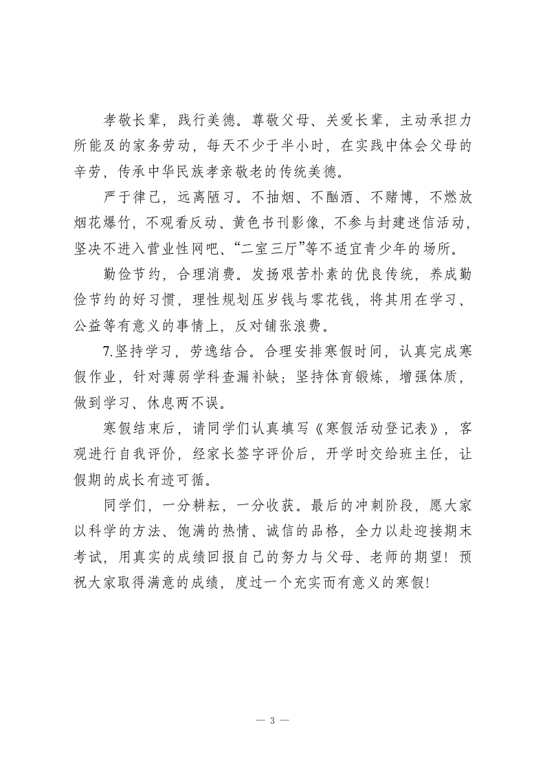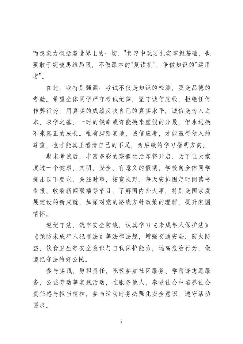 德育副校长秋季学期期末考试励志讲话:诚信应考,不负韶华同学们:时光飞逝,转眼间期末复习已进入冲刺阶段,新年的余温尚未褪去,检验一学期学习成果的时刻已然来临。相信每一位同学都渴望用优异的成绩为这一学期的努力画上圆满句号,这份心愿,需要我们以扎实的复习、诚信的态度去实现。在最后的复习阶段,希望大家把握科学方法,高效冲刺:1.强化重点,精准突破。梳理各科知识体系,聚焦核心知识点与高频考点,将以往的练习、错题分类整理,针对性攻克疑难问题,做到重点过关、难点突破。2提纲挈领,取舍有道。明确复习主线,抓住知识脉络进行系统梳理,不盲目刷题、不贪多求全,集中精力攻克关键章节,让复习更具针对性与实效性。3活学活用,拓展思维。熟练掌握公式、定理等基础内容,在理解的基础上灵活运用;解题时尝试多角度思考,遇到困惑及时向老师、同学请教,拓宽解题思路,避免死记硬背。4.自信从容,劳逸结合。相信自己一学期的积累与付出,考试时沉着冷静、认真细致,不被焦虑情绪困扰。同时合理安排作息,适当参与体育锻炼,以健康的体魄、饱满的精神状态迎接考试,让学习效率事半功倍。爱因斯坦曾说:“想象力比知识更重要,因为知识是有限的,1