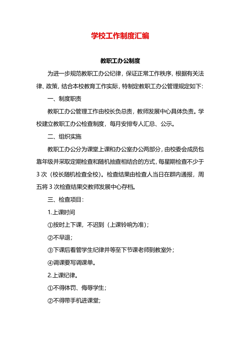 学校工作制度汇编教职工办公制度为进一步规范教职工办公纪律,保证正常工作秩序,根据有关法律、政策,结合本校教育工作实际,特制定教职工办公管理规定如下:一、制度职责教职工办公管理工作由校长负总责,教师发展中心具体负责。学校建立教职工办公检查制度,每月安排专人汇总、公示。二、组织实施教职工办公分为课堂上课和办公室办公两部分,由校委会成员包靠年级并采取定期检查和随机抽查相结合的方式,每星期检查不少于3次(校长随机检查全校)。检查结果由检查人当日在群钠纳通报,周五将3次检查结果交教师发展中心存档。三、检查项目:1.上课时间①按时上下课,不迟到(上课铃响为准):②不早退;③下课后看管学生纪律并等至下节课老师到教室外:④调课要写调课单。2.上课纪律。①不得体罚、侮辱学生;②不得带手机进课堂;