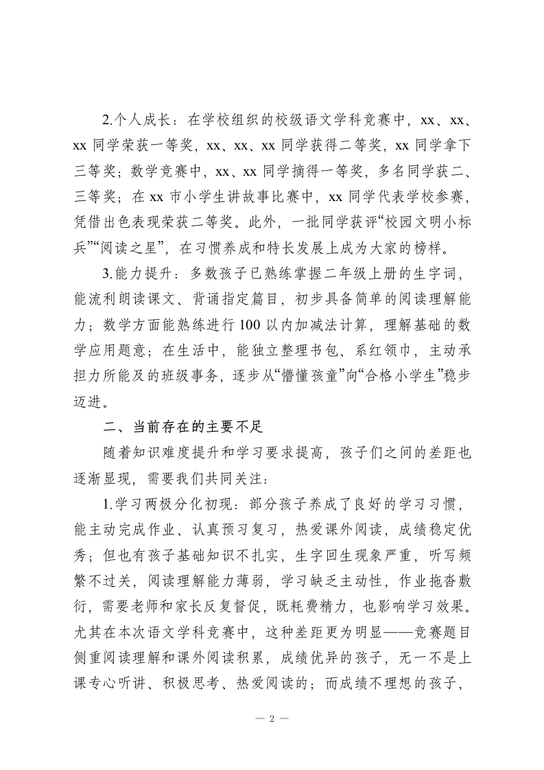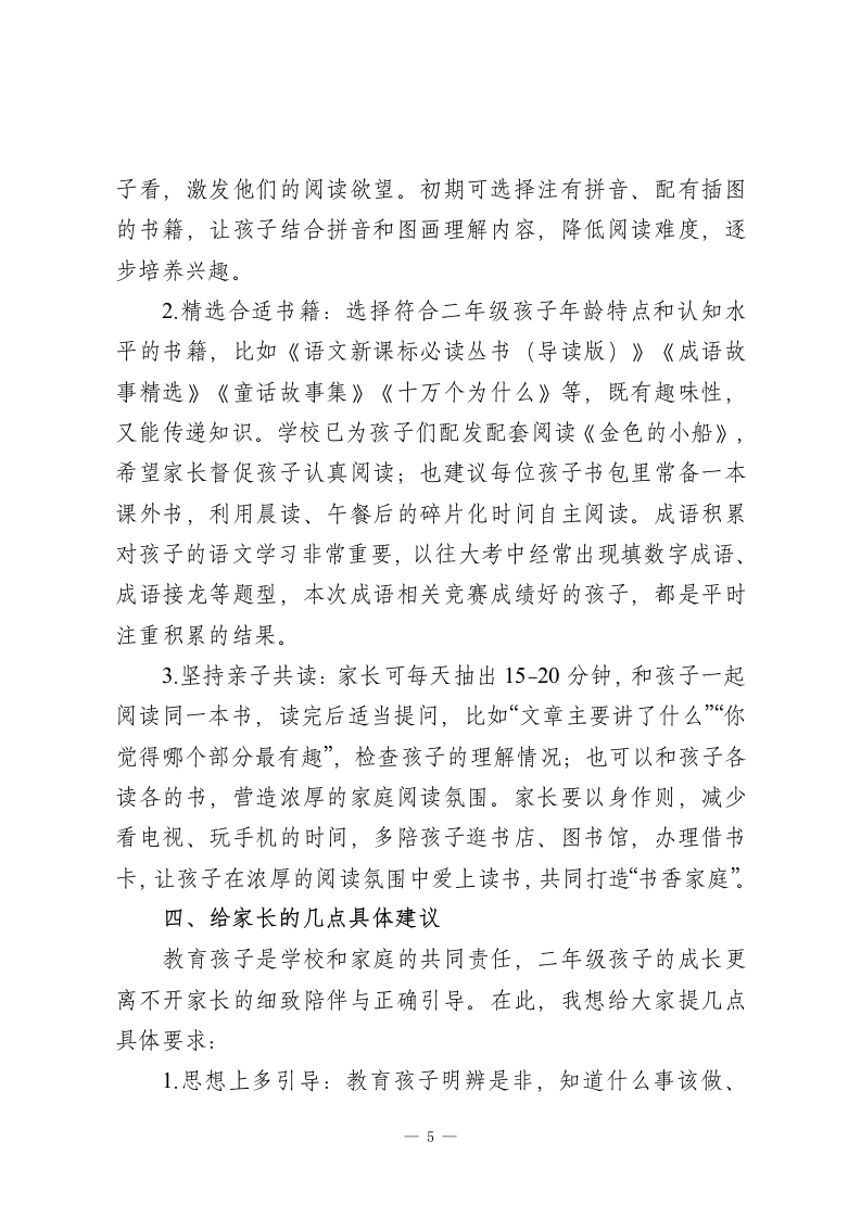 二年级上学期期末家长会,校长讲话:家校同心,稳步进阶各位家长朋友:晚上好!首先,我代表学校,向在百忙之中抽出宝贵时间参加今天家长会的各位,表示最热烈的欢迎和最衷心的感谢!感谢大家长期以来对学校、班级和老师们工作的大力支持与紧密配合。今天我们欢聚一堂,核心目标只有一个一一为了孩子的学习进步、为了孩子的全面成长、为了孩子的美好明天,携手当好孩子成长路上的“护航使者”。二年级是孩子小学学习的“进阶关键期”,既是一年级习惯养成的巩固阶段,也是知识难度提升、能力全面发展的重要时期。回顾这一学期,孩子们的进步让人欣喜:从刚升二年级时的懵懂适应,到现在能熟练遵守课堂纪律、主动参与学习互动;从依赖老师督促,到现在能自主完成早读、收发作业本、认真做值日生,集体荣誉感和自理能力都有了明显提升。一、学期亮点与成长收获这一学期,孩子们在校园里收获满满,不仅学到了知识,更在各类活动中展现了自我:1.班级荣誉:多个班级凭借良好的班风学风、整洁的教室环境,多次斩获“纪律优胜红旗“卫生优胜红旗”,成为校园里的标杆班级。一1