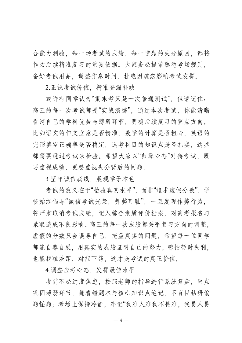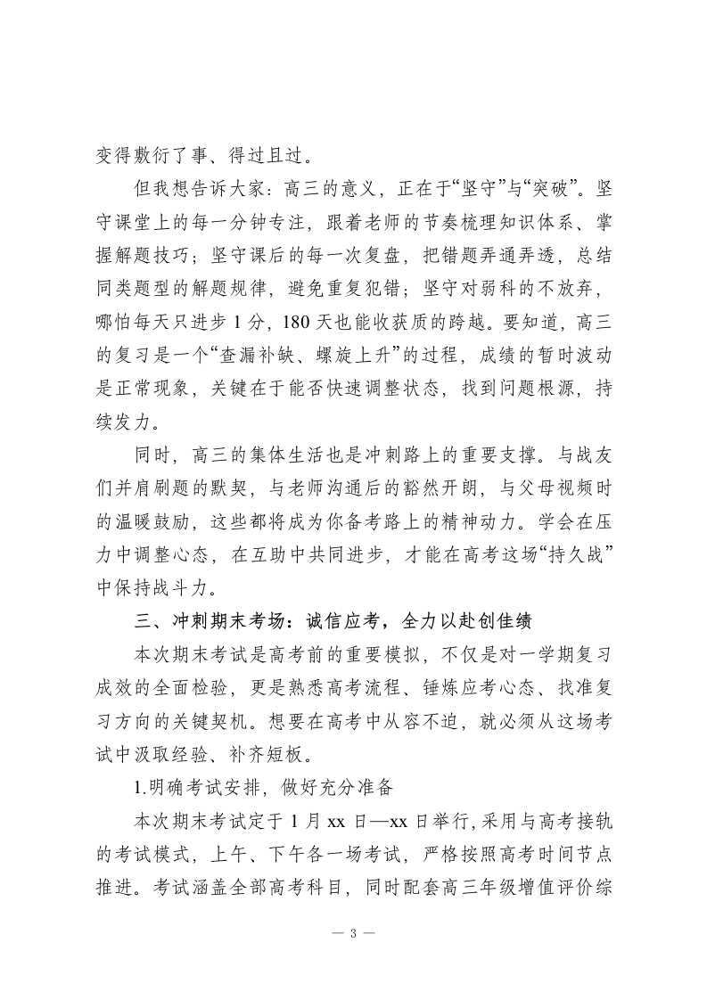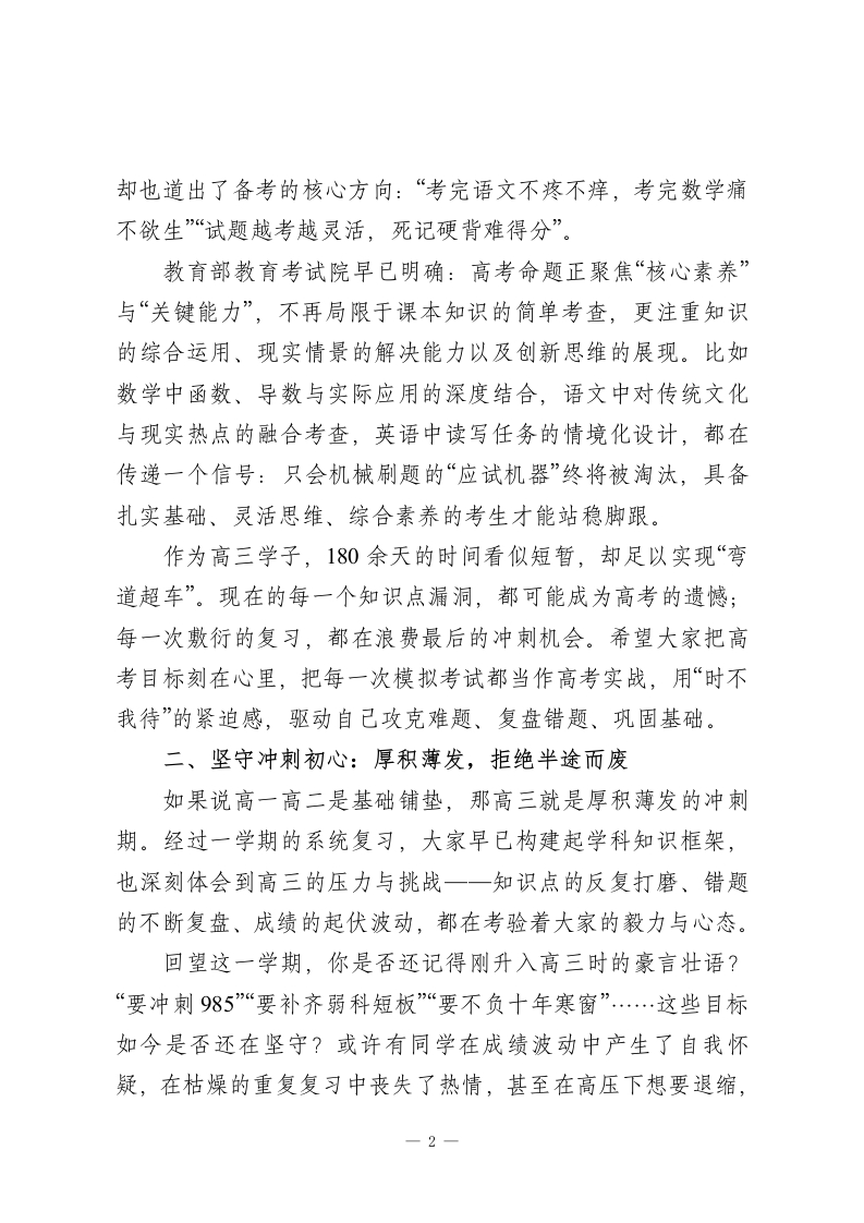 高三秋季学期期末考试动员晨会校长讲话:高三逐梦终有时老师们、同学们:大家早上好!晨雾散尽,朝阳正好,我们齐聚在这熟悉的校园,召开高三秋季学期期末考试动员晨会。此刻的你们,已然站在高考冲刺的最前沿,距离2026年高考仅剩180余天。这场期未考试,是高考前的重要“练兵”,是查漏补缺的关键节点,更是检验一学期复习成效的核心战场。今天,我想和大家聊聊“认清形势“坚守初心”与“全力冲刺”,愿每一份付出都有回响,每一个梦想都能绽放。一、认清高考形势:千军万马过独木桥,唯有实力定乾坤高考从来不是一场轻松的较量,而是一场凭实力说话的终极比拼。它是人生的重要分水岭,决定着你未来的人生平台与发展机遇,想要踏入理想大学的校门,就必须清醒认识竞争态势,拿出背水一战的决心。今年全国千万考生同台竞技,咱们省份xx万考生中,985高校录取率仅0.84%,211高校录取率2.61%,一本录取率11%。这组冰冷的数据背后,是“一分超千人”的残酷现实一一想要在激烈的竞争中脱颖而出,每一分都至关重要,每一次考试都不能掉以轻心。再看今年高考的命题趋势,以数学、语文为代表的科目,难度与综合性持续提升,网上流传的段子虽带调侃,1