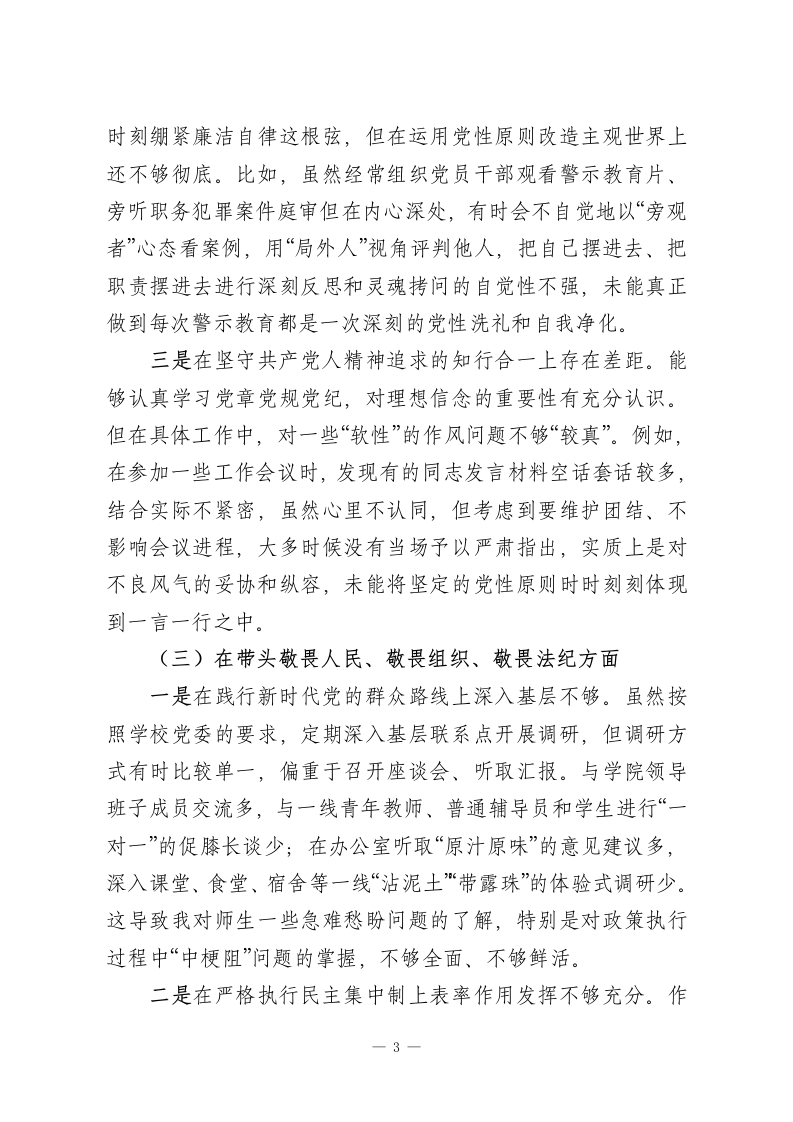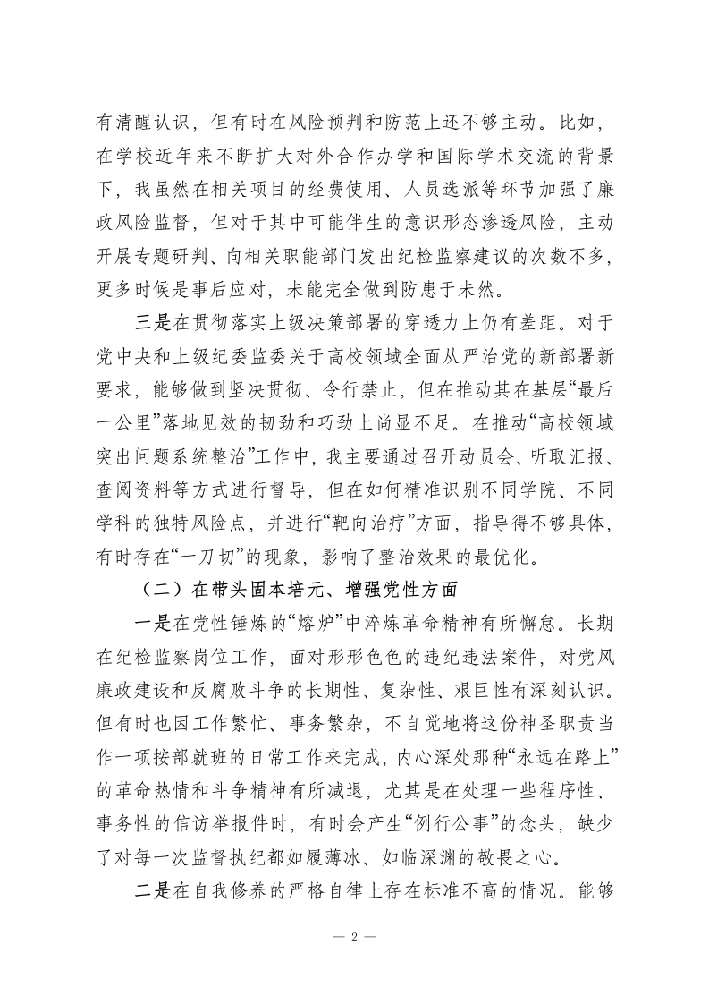 高校纪委书记2025年度民主生活会个人对照检查材料(五个带头)根据校党委关于召开2025年度民主生活会的统一部署和要求,我紧扣本次民主生活会主题,在深入学习领会习近平新时代中国特色社会主义思想,全面贯彻党的二十届三中、四中全会精神,以及持续深化中央八项规定精神学习教育的基础上,通过与班子成员、分管领域同志深入开展谈心谈话,并广泛征求意见建议,对照“带头强化政治忠诚、提高政治能力”等五个方面,深入查摆了自身存在的问题,深刻剖析了问题产生的根源,明确了今后的努力方向和整改措施。现将个人对照检查情况报告如下。一、存在的主要问题(一)在带头强化政治忠诚、提高政治能力方面一是在将政治理论学习成果转化为政治能力的深度上仍有欠缺。虽然能够积极参加校党委理论学习中心组的各项学习活动,并坚持个人自学,但在“深化、内化、转化”上做得还不够。例如,在学习党的二十届四中全会关于完善党的自我革命制度规范体系的新论断新要求时,满足于学过了、理解了,但在如何结合学校纪检监察工作实际,创造性地构建符合我校特点的“大监督”格局方面,思考得不够系统、谋划得不够深远,导致提出的部分工作举措仍然沿袭过往思路,缺乏前瞻性和创新性。二是在运用政治眼光观察分析问题的敏锐性上仍有不足。作为纪委书记,对校园内的政治风险和意识形态领域的复杂性1