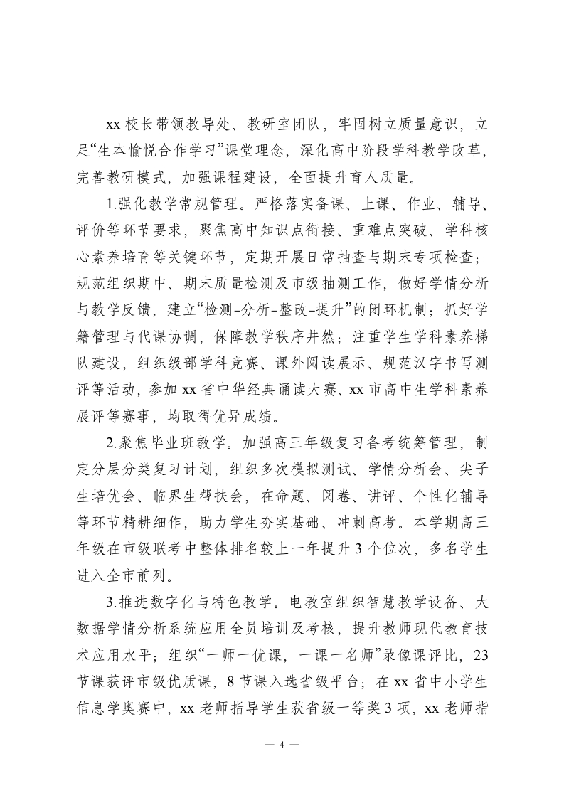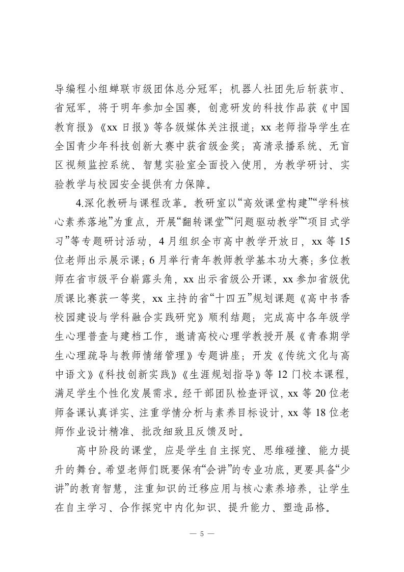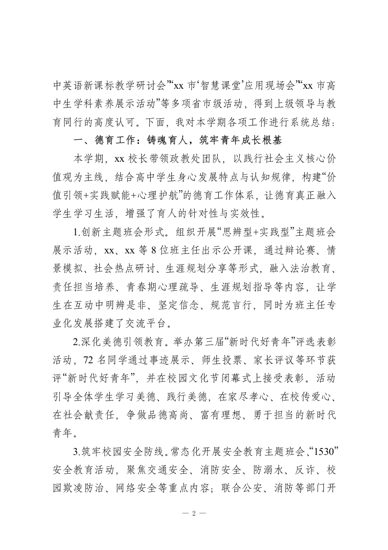 高中2025-2026学年秋季学期期末全校教师大会,校长讲话:铸魂结硕果,砥砺奋进再攀峰各位老师:大家下午好!时光荏苒,本学期已圆满收官,充实的工作时光画上句点,愉快的寒假即将开启。尽管本学期教学任务紧凑、升学压力叠加,但全体高中部教职工始终秉持教育初心、真抓实干,在学科教学、德育引领、特色发展等方面多点突破,交出了一份亮眼的成绩单。今天召开本次大会,一是与大家共同复盘本学期的成长与收获,正视不足与改进方向;二是部署假期相关工作,确保大家度过一个安全、充实、有意义的假期。刚才,学校对本学期表现突出的优秀团队和个人进行了表彰,在此,我代表学校向大家表示最衷心的祝贺!希望大家珍惜荣誉、乘势而上,在新的学期再创佳绩、再攀高峰。本学期,我校高中部始终坚守“办人民满意的教育”宗旨,以提升办学质量为核心,以促进学生全面而有个性的发展为目标,以强化教师专业成长为支撑,在规范办学、德育创新、教学改革、特色品牌打造等方面精准发力,收获了一系列丰硕成果:学校先后荣获“xx省高中机器人创新大赛优秀组织奖”“xx市教育体育工作先进单位”“xx市数字智慧校园示范校”“全国中学生陶艺作品展示优秀组织奖”等多项荣誉;成功承办“Xx省高1