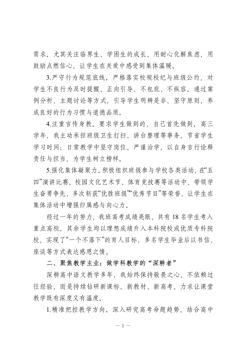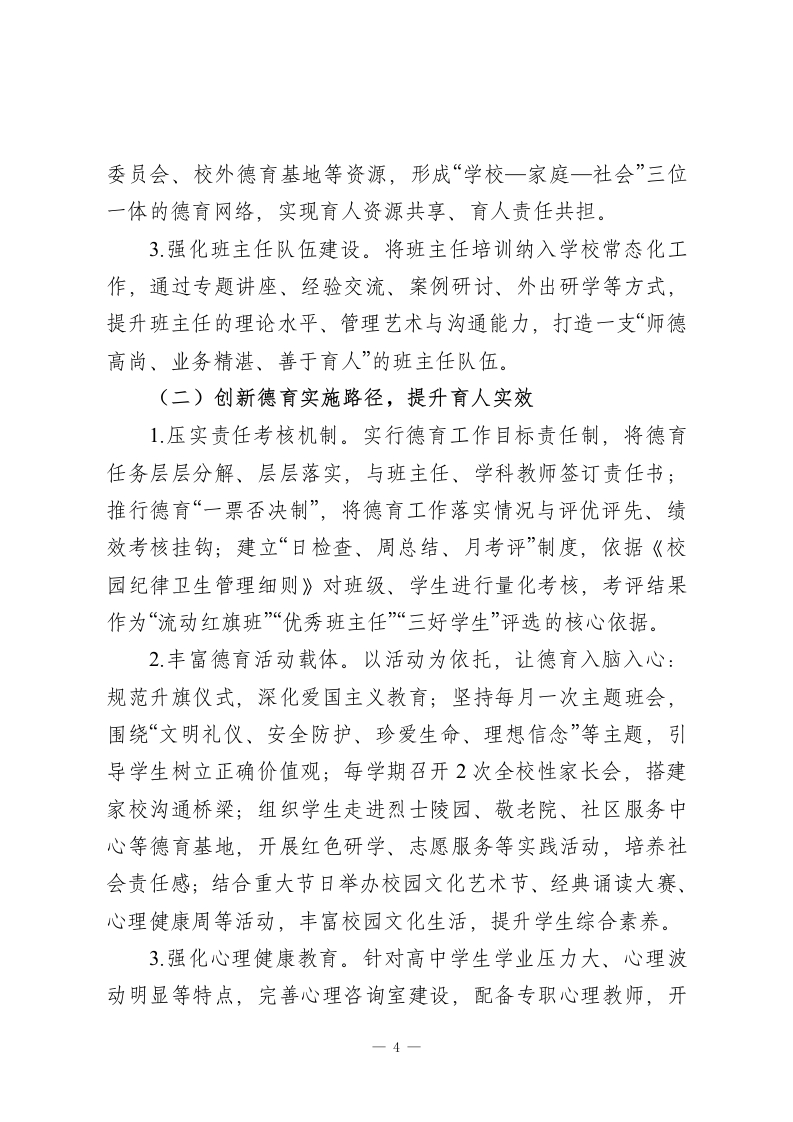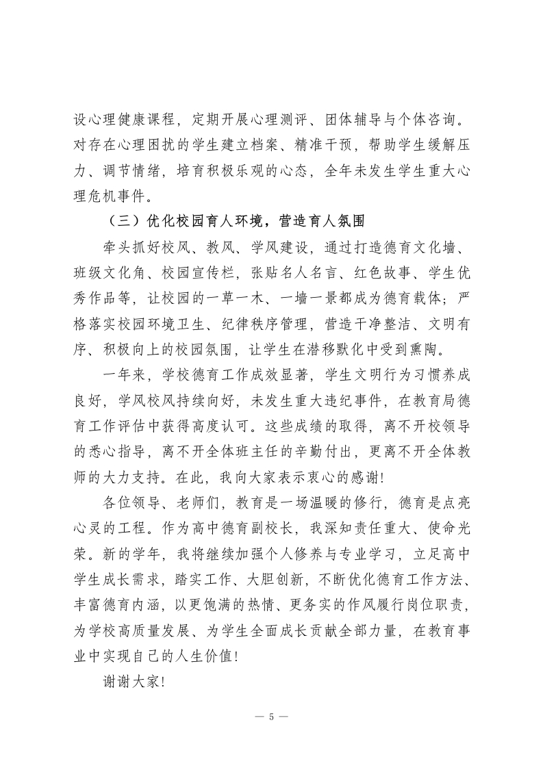 高中德育副校长述职报告:深耕德育沃土,赋能青春成长各位领导、老师们:大家好!过去一年,我始终秉持“立德树人”根本任务,以高中学生成长规律为遵循,在承担德育管理核心工作的同时,圆满完成高三毕业班班主任、语文教学及学校安排的专项工作,在满负荷的履职中深耕不辍、务实笃行。面对高中阶段学生思想活跃、需求多元、管理难度大等现实挑战,我始终以乐观韧劲直面问题,充分发挥主观能动性,推动学校德育工作与教学管理协同提质,现将一年来的工作情况汇报如下:一、深耕班级管理:做学生成长的“引路人”作为高三毕业班班主任,我始终坚守“让每个学生全面发展、学有所成”的育人理念,围绕“学风建设、品格塑造、目标引领”三大核心,打造有温度、有凝聚力的班集体。1.构建自主管理体系。推行“事事有人做、人人有事管”的班级治理模式,将卫生、纪律、学习、活动等事务细化分工,建立“班主任一班干部一学生”三级管理网络,让每位学生都成为班级管理的参与者、责任人,培养自主管理能力与集体荣誉感。2.倾注全员关爱。面对班级学生基础差异、个性特点不同的现状,我坚持一视同仁、因材施教,通过谈心谈话、家校沟通、个性化辅导等方式,精准把握每位学生的思想动态与学习1