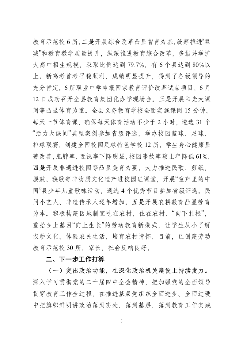 教体局党建引领工作经验总结2025年,县教育局党组始终坚持以习近平新时代中国特色社会主义思想为指导,认真学习贯彻落实党的二十届四中全会精神,坚持“以高质量党建引领高质量发展”定位,创新“三强化三培养”工作模式,全力推动党建工作高质量发展,为办好人民满意的教育提供坚强保障。一、主要工作情况(一)强化思政建设,培养红色传人。充分利用红色资源,传承红色基因。一是做足革命传统教育。鼓励中小学校把“特色班、团、队会搬到革命旧址去开,把思政课放到纪念馆去上”,开展到烈士纪念地祭扫等活动,让学生接受爱国主义教育和革命思想洗礼,更加珍惜来之不易的幸福生活。二是做好思政教育。积极开展思政课教师“大练兵”活动和思政金课评选活动。加强精神课题研究,目前,精神专项微型课题立项394项,结题230项,规划课题立项213项;分学段编辑设计“用精神教书育人”专题精品课100节,发挥好100所“用精神教书育人”示范校的示范引领作用,《人民日报》出版社出版《思政课》丛书。三是做靓小小讲解员等实践活动品牌。常态化开展读红色经典、唱红色歌曲、讲红色故事、访红色足迹等系列教育实践活动,形成了“精神讲习社“精神小小讲解团”等一批鲜活新颖的红色主题实践活动品牌。延职附小精神红领巾讲解团(集体)入选全国“新时代好少年”。(二)强化队伍建设,培养履职能人。坚持党建引领,促一1