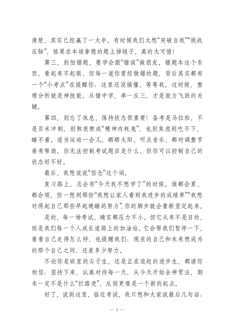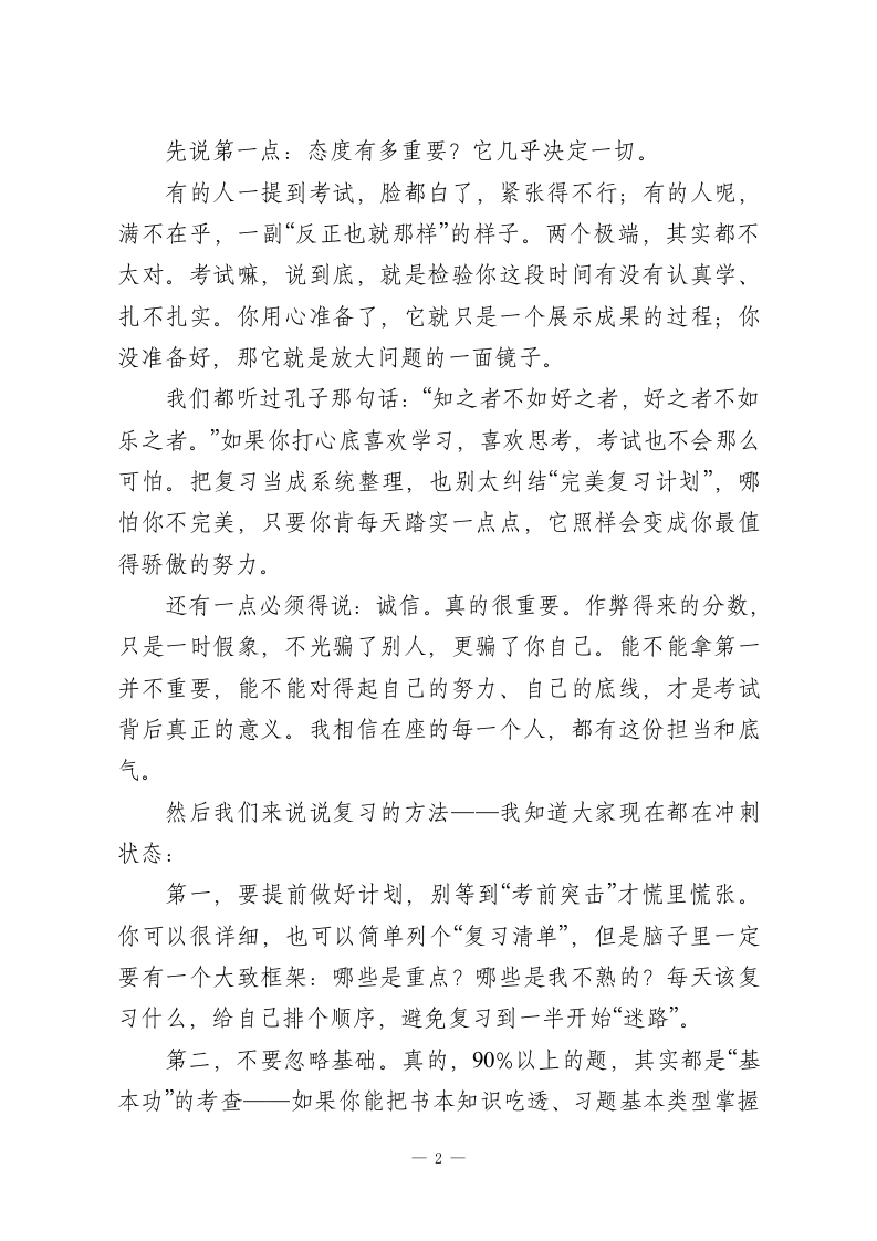临近期末考试,校长在国旗下讲话:你们都准备好了吗?尊敬的老师们,亲爱的同学们:大家好,早上好」站在这鲜艳的国旗下,说实话,我的心情真的很激动。看着五星红旗缓缓升起,在庄严的国歌声中,我不禁想起这样一句话:“天行健,君子以自强不息。”是啊,不知不觉,我们已经走到了这个学期的尾声。两周之后,期末考试就要来了。不知道你们感受到了没有一一时间仿佛按了加速键,回过神的时候,这学期竟然已经快要结束了。那么问题来了:大家,准备好迎接挑战了吗?回头看看过去几个月的生活,我们真的一起走过了许多值得纪念的时刻。春天,我们在朗朗书声中种下希望;夏天,在汗水中浇灌知识;秋天,我们收获了点滴进步的喜悦。现在,寒冬已至,该是检验成果的时候了。每天清晨,第一缕阳光洒进教室,我看到你们低头读书的样子;黄昏时分,放学的路上,还能听到你们讨论问题、互相提问的声音。这一幕幕,都是青春最真实、最动人的模样。不过我们也听过一句老话:“行百里者半九十。”越是接近终点,越不能松懈。期末考试不仅是一次成绩上的“检测仪”,更是一次态度、方法、意志的“全身体检”。它能帮助我们看清自己距离目标还有多远,也能让我们明白,谁在坚持,谁是真努力。所以下面,我想和大家聊聊几个让我特别想说的话题。1