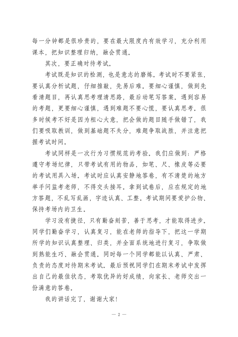 临近期末考试,校长在国旗下讲话学习没有捷径,只有勤奋刻苦,善于思考,才能取得进步尊敬的各位老师,亲爱的同学们:同学们,时间过得飞快,转眼又到了检验我们学习状况的时刻,几天后,我校将进行期末考试。满怀信心地迎接期末考试,争取优异的成绩,是我们共同的心愿,为了同学们能够获得理想成绩,针对期末考试,我向同学们提出以下几点建议和要求:首先要重视考前的复习。孔子说:“温故而知新”,这句话告诉我们学习要重视复习。在此我提出以下建议:1、重视课堂课本,不要囫囵吞枣。老师在课堂上讲的内容当天就要消化,布置的作业也要认真完成。有的同学想要先囫图吞枣,再指望回头复习,这种方法是行不通的,既降低了学习效率,又不利于按部就班的学习和复习。2、重视基础知识,不要只做难题。一学期下来,学习成绩没有多大提高,有些同学就着急起来,拼命扑在难题上,这是很不明智的。在考试中,难题是用来拉开差距的,而占绝大多数比例的都是基础题。最好先保证基础题全部拿分,再冲刺能力题,要分清楚轻重缓急。3、重视复习时间,有针对性地合理安排时间和分配精力。