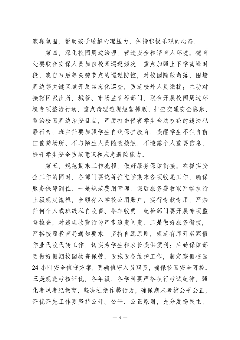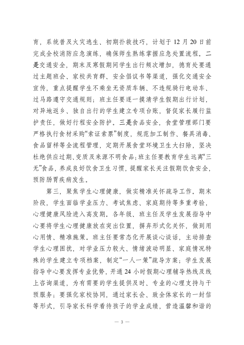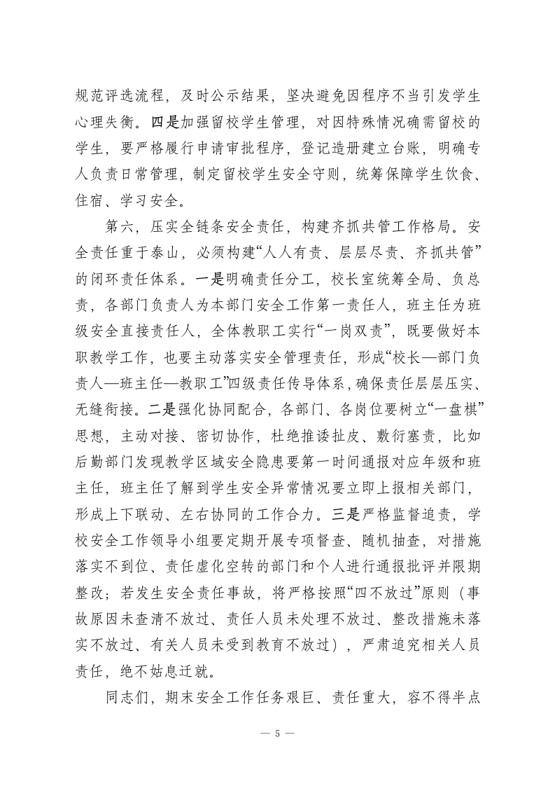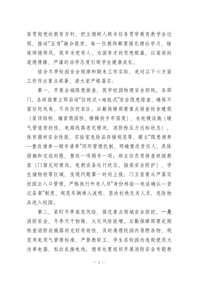 期末及寒假安全工作部署会,校长讲话:守牢安全底线,护航成长之路各位教职工:今天我们召开专题会议,核心任务是统一思想、压实责任,全面部署学期末及寒假前后安全工作,持续巩固平安校园建设成效,守护每一位学生的身心健康,确保本学期各项工作圆满收官、寒假假期安全有序。当前岁末年初,安全风险交织叠加,冬季气候特点又加剧了各类隐患发生概率,安全工作绝不能有丝毫松懈懈怠。希望全体同仁以高度的政治责任感和育人使命感,将各项安全举措抓细抓实抓落地,为孩子们的健康成长筑起坚不可摧的安全屏障。首先,必须坚守意识形态安全底线。意识形态工作是学校工作的生命线,筑牢意识形态阵地是每一位教育工作者的政治职责。全体教职工要切实提高政治敏锐性,密切关注学生思想动态,既要抓好课堂教学、校园活动中的思想引领,更要警惕线上线下各类不良信息对学生的侵蚀,加强校园网络平台、宣传阵地、学生社交群组的常态化排查与规范管理,及时发现并纠正错误思潮、不当言论,坚决防范校园宗教渗透与不良信息传播。要通过主题班会、思政课堂、社会实践等多元载体,引导学生树立正确的世界观、人生观、价值观,厚植家国情怀,增强辨别是非的能力。同时,我们要持续深入学习关于未成年人思想道德建设的重要论述精神,始终以党的创新理论武装头脑、指导实践,全1