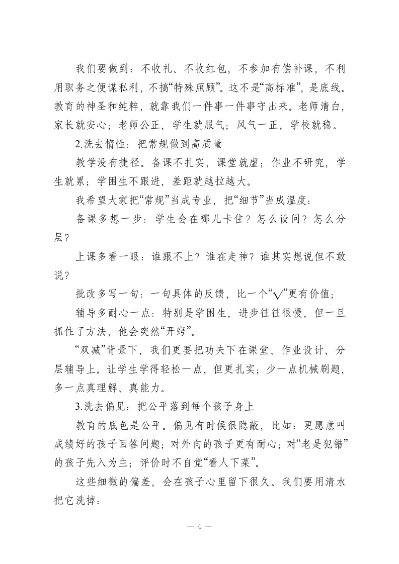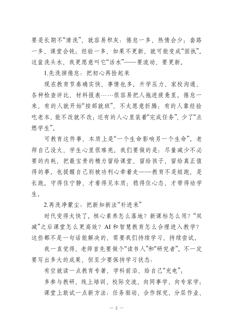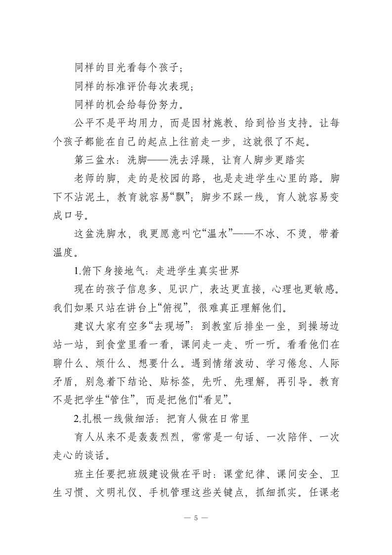 期末教师大会上,校长精彩讲话:师者当备三盆水(洗头,洗手,洗脚)各位老师:大家好!到期末了,坐在这儿回望一学期,心里是踏实的,也是感慨的。每一份成绩、每一次进步,背后都有大家的辛苦:早到校的那一盏灯,晚离校时走廊里最后的脚步声,作业本上一遍遍的批注,办公室里一次次的讨论、商量、复盘…这些都不是“例行公事”,是真真切切的付出和坚守。常说“师者,所以传道授业解惑也”。可我们都知道,今天的“师者”不止这些:我们在教知识,也在教做人;在教方法,也在给孩子撑起一段人生的底气。你们的言行、学识、气度,直接影响着孩子的未来,也决定着学校教育的温度和高度。那,怎么做一名新时代的好老师?怎么在教育这条路上走得稳、走得远、走得有劲儿?我这学期有个越来越清晰的感悟,今天想跟大家分享一作为教育人,我们要常备“三盆水”。一盆水洗头:让头脑清醒,理念常新;一盆水洗手:让双手干净,底线不破;一盆水洗脚:让脚步踏实,心里装着学生。这“三盆水”,说得朴素,但挺管用。它是修身之水、教学之水,也是育人之水。愿我们常洗常新,走得更坚定、更从容。第一盆水:洗头一洗去蒙尘,让教育智慧常新老师的脑子里装的,是理念、知识、方法、判断力。脑子1