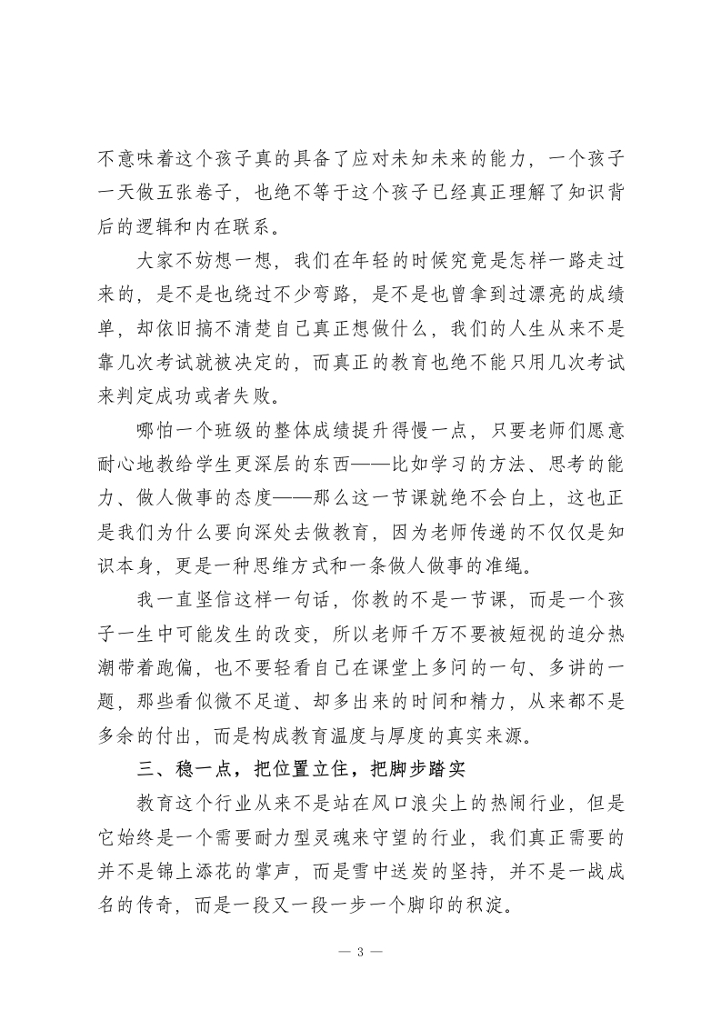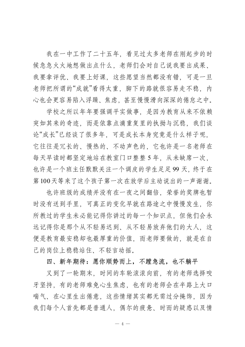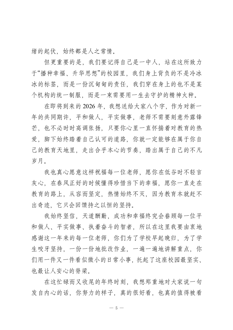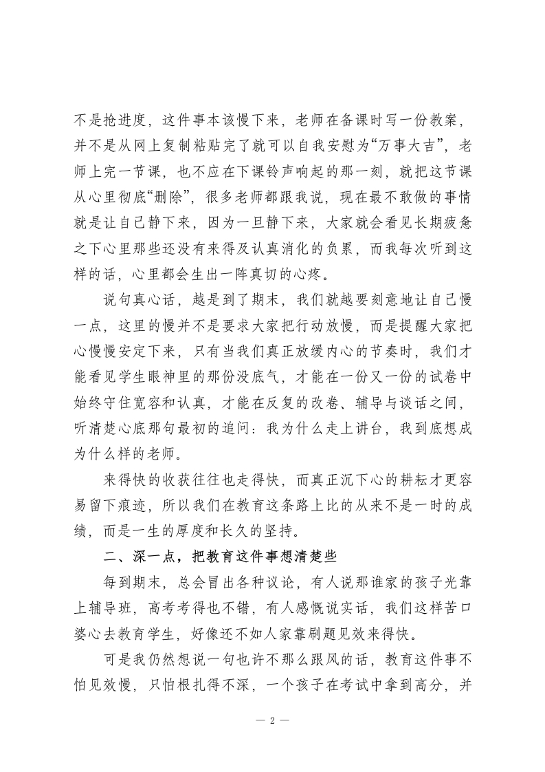 期末教师会议,校长讲话:你努力的样子,真的很好看,也真的值得被记住一一校长这一场收心讲话太温柔了!教工同志们:大家下午好!外面的天气一天天转冷,离马年的钟声也越来越近,2025年已经慢慢走到了尾声,就像我们教室黑板上那几个早已被粉笔磨淡的字,写着“始于春,终于冬”,而2026年已经悄然走到了我们面前。今天这场期末教职工会议,我并不打算向大家铺陈各种数据,也不想再一条条罗列任务,我更希望能和大家像老朋友一样坐下来,好好聊一聊“人”和“教育”,聊一聊在这条路上我们共同的状态与追求一慢一点、深一点、稳一点。我一直觉得,教育这行说到底是一场慢功夫搭起的修行,这是一段需要我们既修身、又修心、更修行的长远旅程。一、慢一点,把节奏还给自己这几年,我越来越清楚地发现一个问题,大家在这条路上的步子实在走得太快了,老师们坐下批作业时总要下意识地一边看手机,给学生讲题时往往把语速压得连自己都觉得有些喘不过气,每到“五一”假期大家都说要抽时间多陪陪家人,可一到暑假又立刻投入到各种赶资料、交课题的忙碌之中。但是我们有没有认真想过,教育不是快递,不是跑数据,1