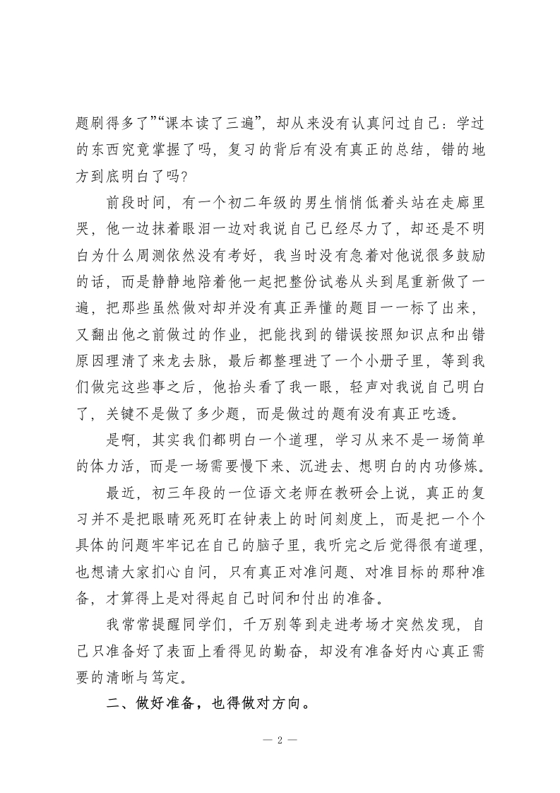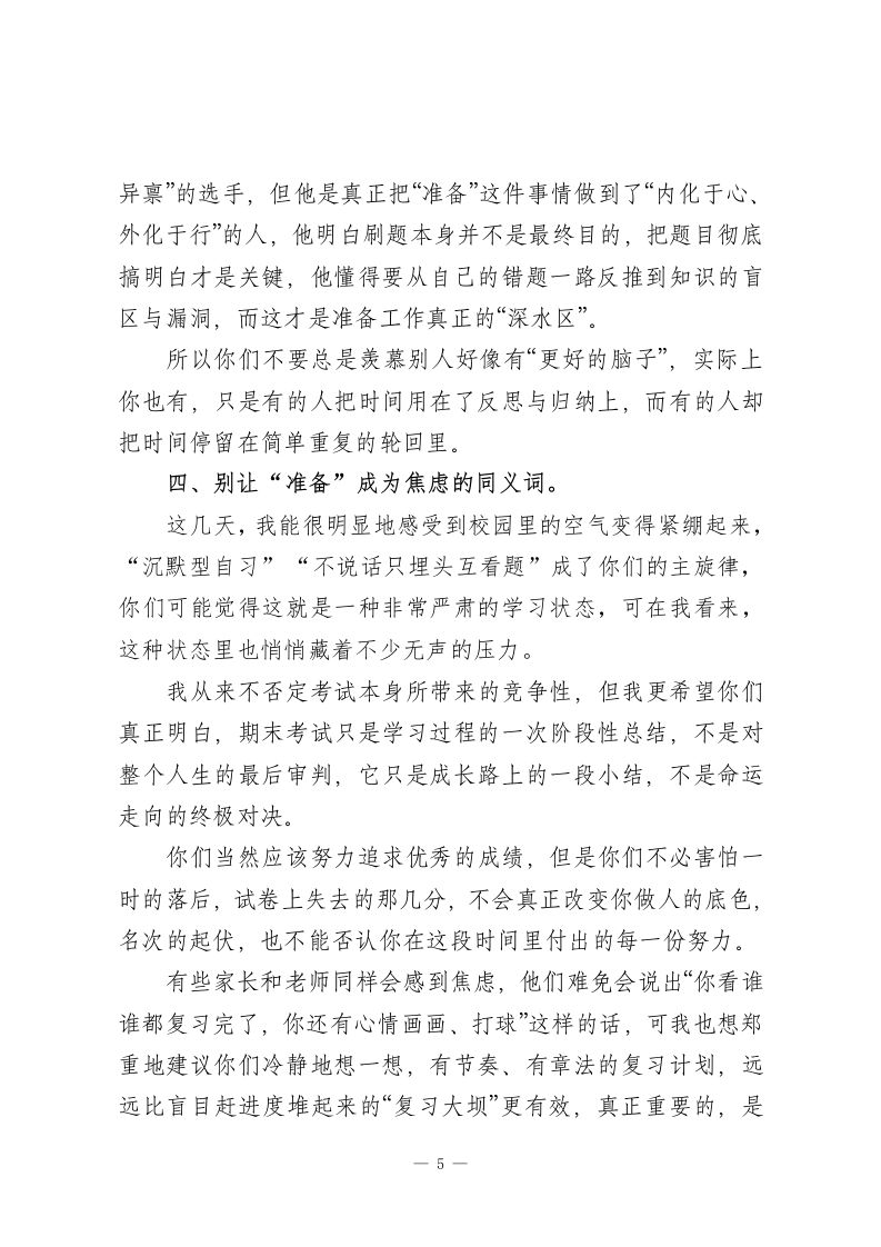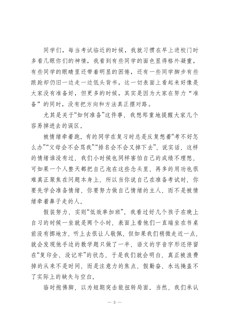 期末考试临近,校长在国旗下讲话:校长发问,你说你准备好了,那你准备“对”了吗?尊敬的各位老师、亲爱的同学们:大家早上好!我今天讲话的题目,只有一句话一一你说你准备好了,那你准备“对”了吗?这个问题,说给在座的每一位同学听,也说给我自己听。因为这不是一句“口号式”的激励话,也不是一句“应景”的考试动员词,而是我们每个人都应该在这个时间点上,认认真真、好好问问自己的一个问题。一、准备,不只是翻书刷题这么简单。最近,我看到不少老师在办公室里几乎是连轴转,3班的王老师嗓子哑了一周都还没来得及好好休息,5年级的李老师和几位科任老师,晚上还在群里陪着学生一同整理错题,我也看到许多同学学习劲头很足,图书馆早已经坐不下人,教室里的自习常常持续到很晚、灯光久久不灭,一张张被刷得快透的试卷,一本本被翻得发旧的错题本,都让我的心里既感动又敬佩。但是,我心里也一直有点不踏实,我总在想,这样的用力方式究竟是不是我们真正需要的“准备”。是从什么时候开始,我们对于考试的“准备好像只剩下了“题海战”这一个选择,我并不是反对做题,也绝不是要贬低努力,我只是担心,有些同学心里所谓的“准备好了”,可能只是觉得“习1