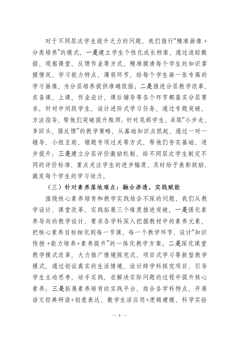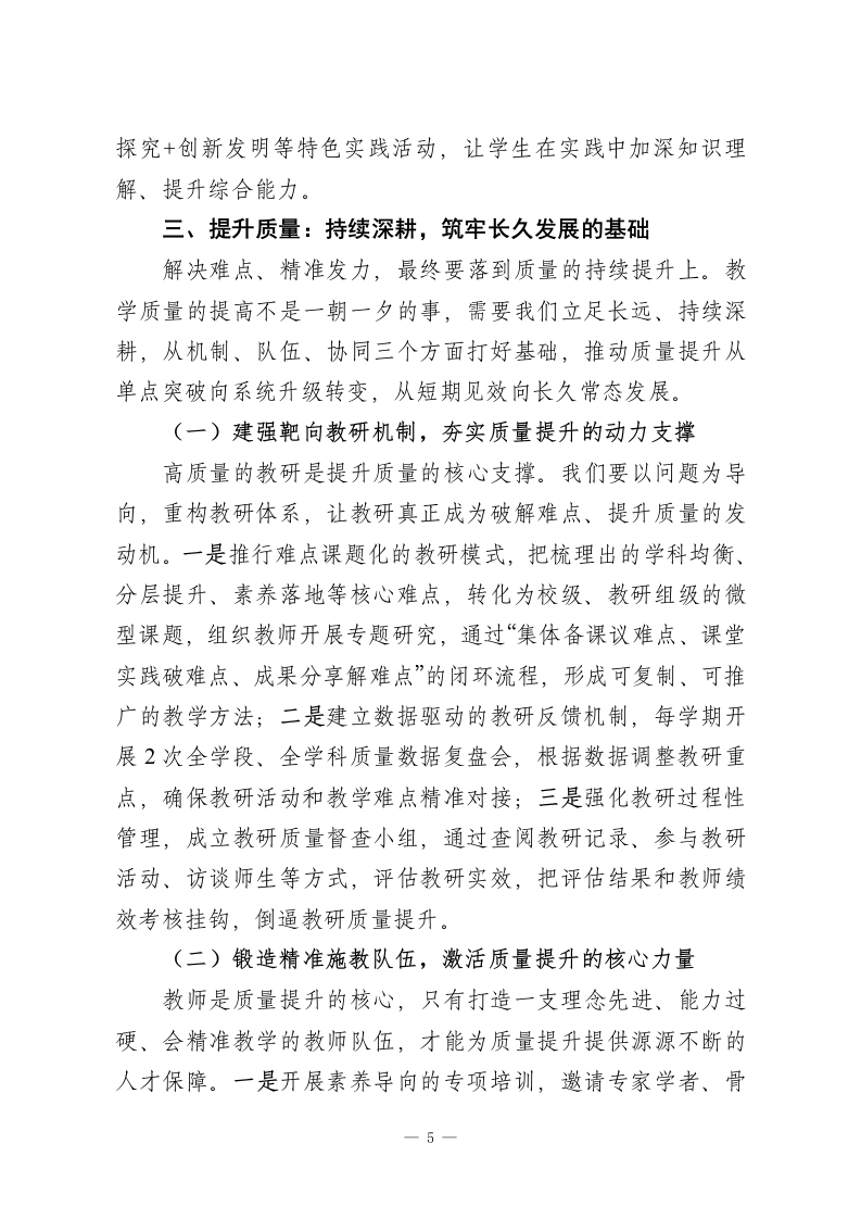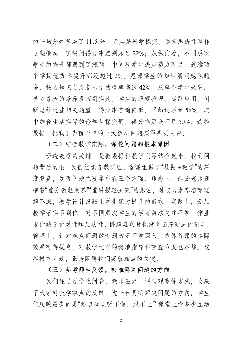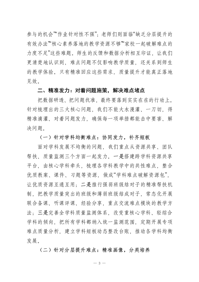 期末考试质量分析会,校长精彩讲话:“研”透数据,“精”准发力,“提”升质量各位老师:大家好!期末考试结束了,马上就要放寒假了!我们回头看看这一学期的工作,教学质量一直是我们最核心的任务;展望明年,更得找对努力方向、拧成一股劲往前冲。今天开期末质量分析会,核心就是三句话:研透数据、精准发力、提升质量。这十二个字,把我们破解教学难题、提高教学质量的路子说清楚了:先把数据研究透,找到问题根源;再对着问题精准施策,解决堵点难点;最终落脚到质量提升上,守住育人的初心。今天,我们就围绕这主线,好好交流,一起商量怎么把质量提上去。一、研透数据:以数据为基础,摸清问题根源数据就像教学质量的晴雨表,更是解决教学难题的导航仪。但数据本身不会说话,得我们沉下心去分析、看透本质,才能从里面找到真正的难点、摸准问题症结。这里说的“研透”,不是简单看看数字,而是要结合平时教学实际,多方面、深层次解读,让数据真正帮我们解决问题。(一)多维度分析数据,找准问题的精准位置这学期期末检测结束后,我们依托教学质量监测平台,对全年级、全学科的数据做了横向对比、纵向追溯、个体剖析的多方面分析。从横向看,学科发展不均衡的问题很突出,部分综合学科和核心学科的质量差距明显,同一个学科,不同班级1