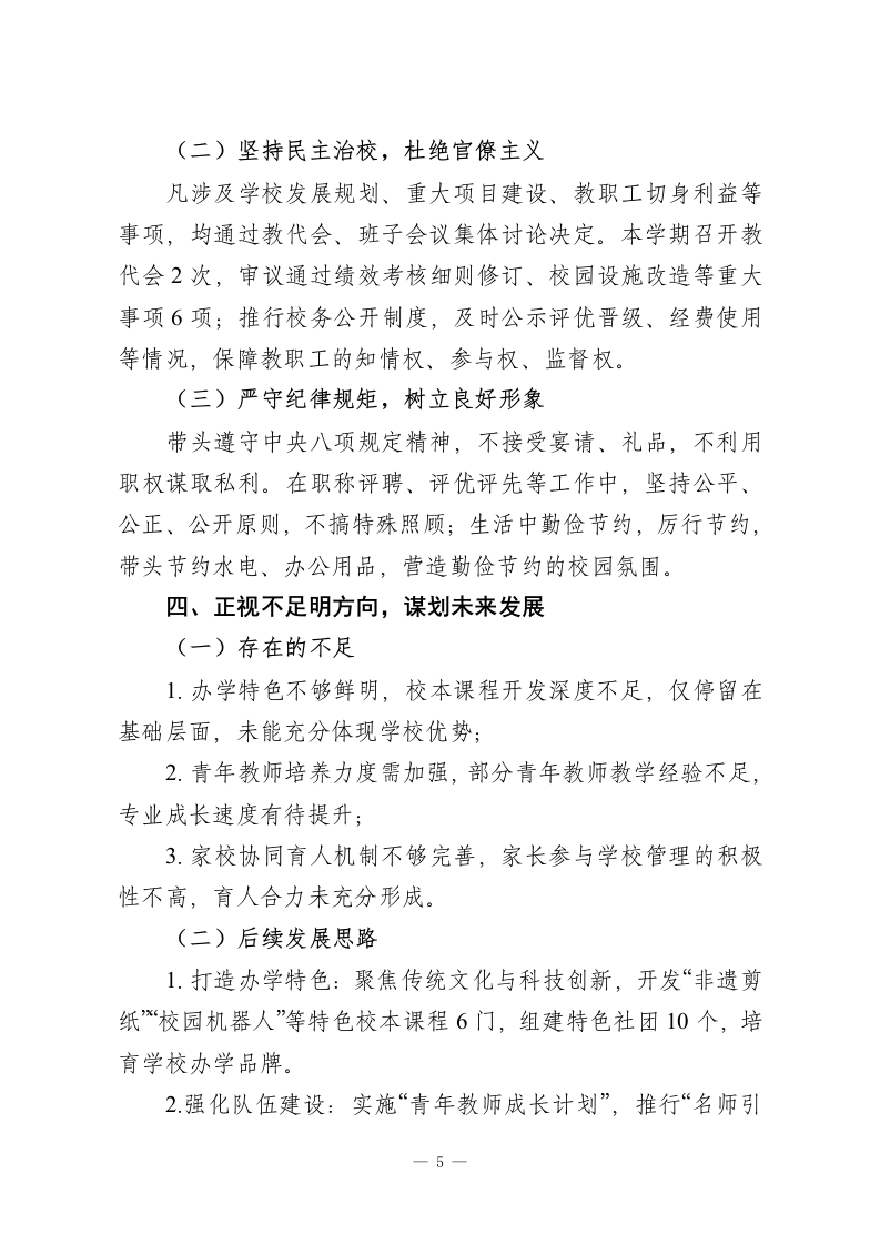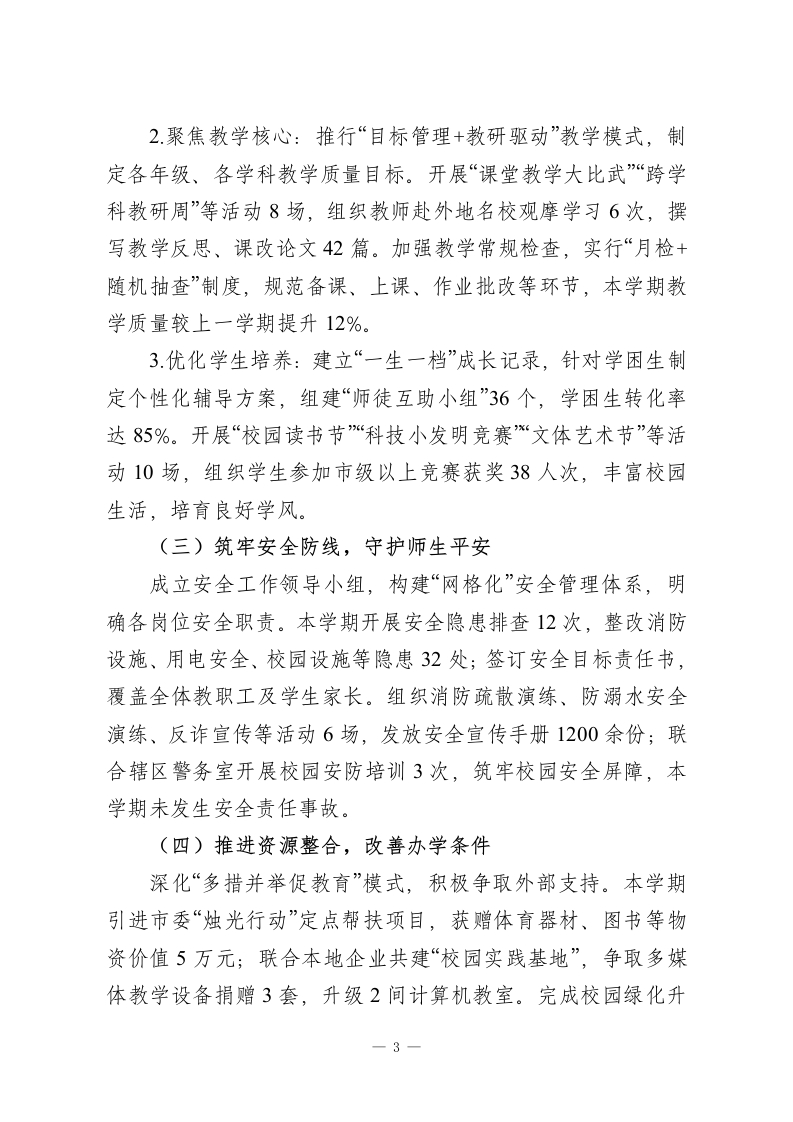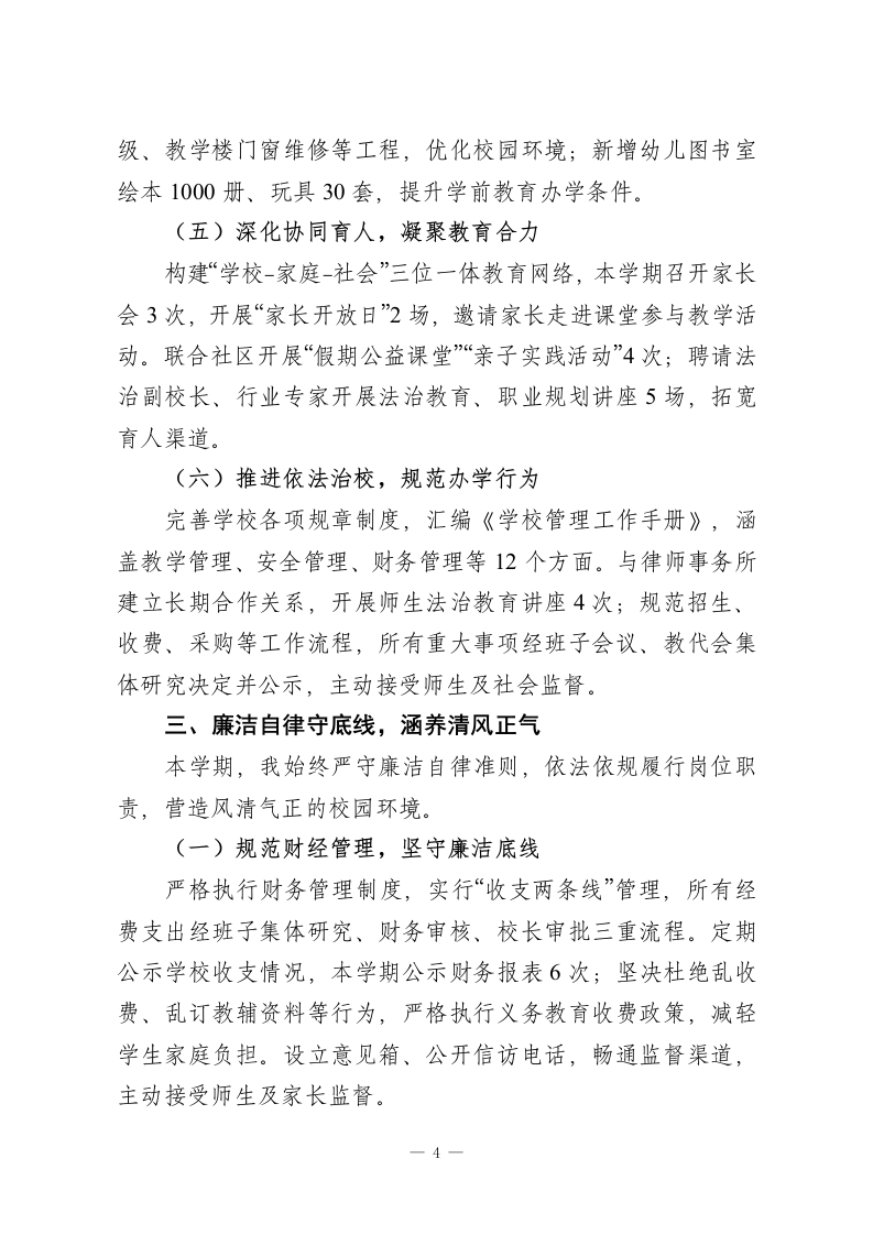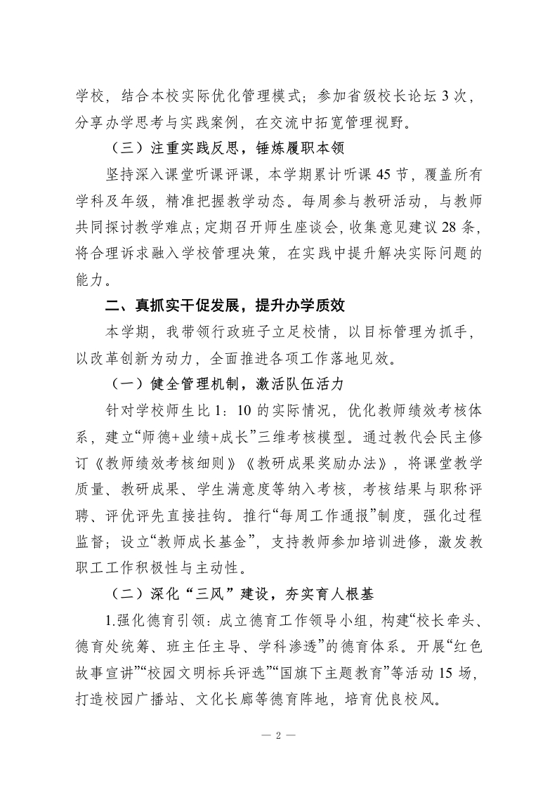 秋季第一学期校长述职报告:深耕管理提质效,创新赋能促发展尊敬的各位领导、各位老师:大家好!本学期已近尾声,在上级教育主管部门的正确指导下,我始终坚守“为党育人、为国育才”初心,秉持“以生为本、以研促教”办学理念,带领全校教职工凝心聚力、真抓实干,圆满完成本学期各项教育教学任务。现将本学期履职情况、廉洁自律表现及后续发展规划汇报如下,请予评议。一、勤学笃行强素养,筑牢履职根基新时代教育改革持续深化,唯有不断学习才能紧跟发展步伐。作为校长,我始终将自身素养提升放在首位,为学校发展掌舵领航。(一)强化政治学习,坚定办学方向深入学习习近平新时代中国特色社会主义思想、党的二十大精神及全国教育大会部署,积极参加上级组织的校长研修班、政策解读会,全年开展专题学习12场次。带头遵守教育法律法规,严格落实党组织领导下的校长负责制,确保学校办学始终沿着正确方向前进。(二)深耕业务钻研,提升管理能力聚焦核心素养导向的教育教学改革,主动研读《义务教育课程标准(2022年版)》,订阅《中小学管理》《教育研究》等专业期刊,汲取先进办学经验。走访调研区内10所优质兄弟1
