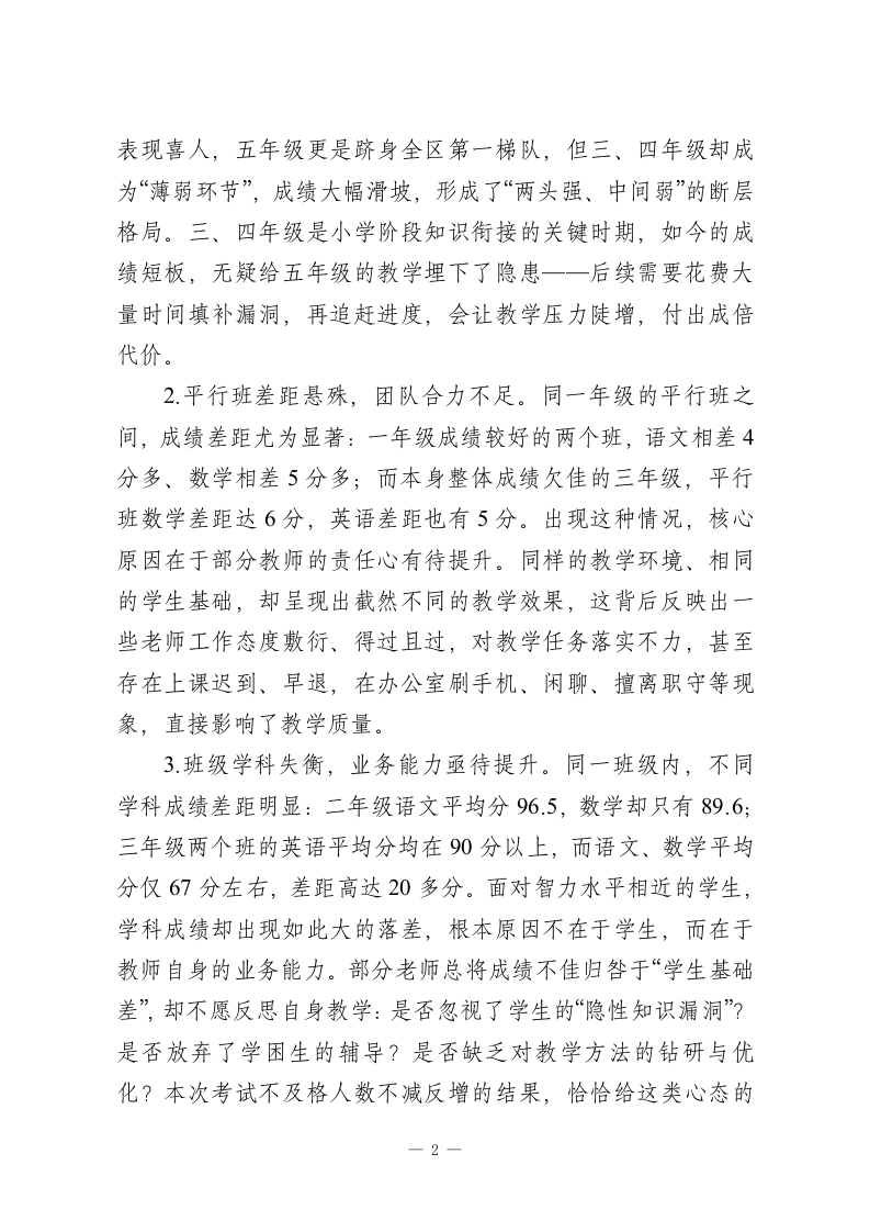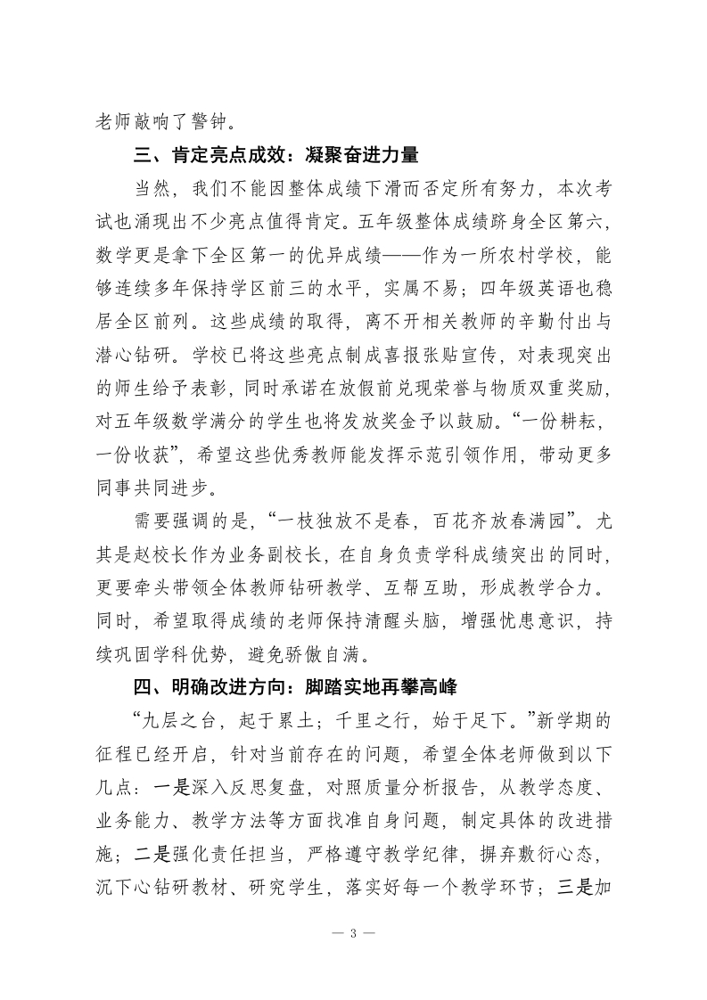 秋季寒假学期末质量分析会小学校长讲话:成绩下滑要重视,一步一个脚印赶上来各位老师:大家下午好!考试成绩是检验教学成效的“试金石”,既反映了学生知识掌握的实际情况,也折射出我们教学工作中的亮点与不足。刚才教务处已经对本学期期末质量进行了详细分析,下面结合这份报告,我想和大家深入复盘问题、明确方向,为新学期教学工作蓄力赋能。一、正视成绩短板:清醒认识当前现状经过连续两年的成绩稳步提升后,本学期我校整体成绩出现明显下滑,创下近两年来的最低水平,这一结果值得我们所有人警醒。其中,三、四年级表现尤为突出,语数英三科的“三率”均未达标一一语文平均分仅在60分左右徘徊,数学平均分约70分,就连以往的优势学科英语,也跌至70多分。或许有老师会认为是试题难度较大,但区排名倒数第三、部分学科乡级排名靠后的现实,却无法回避。这不仅是对我们教学工作的考验,更关乎学校的声誉和家长的信任,必须引起高度重视。二、剖析核心问题:找准根源才能破局深入分析成绩数据,我们发现当前教学存在三大突出问题:1“腰部年级”乏力,断层现象明显。一二年级成绩保持稳定、