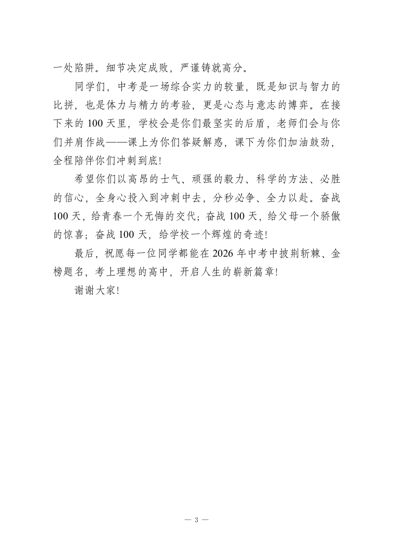 秋季学期初三优等生中考冲刺动员大会校长讲话:冲刺百天铸锋芒,决胜中考创辉煌亲爱的同学们:大家下午好!今天,我们齐聚一堂,召开这场特殊的中考冲刺动员大会。首先,我要向在座的每一位同学道一声:你们辛苦了!作为学校最具潜力冲击重点高中的优等生,你们是父母的骄傲,是学校的希望,更是自己青春的掌舵人。此刻,距离2026年中考仅剩100天!这100天,是万米赛跑的最后冲刺,是三年寒窗的收官之战,更是人生路上的关键一跃。嘹亮的冲锋号已经吹响,接下来的每一天,都将是与时间的赛跑、与自我的较量。老师的叮嘱、父母的期盼会化为前行的动力,但最核心的力量,永远源于你们自己一一给自已加压、给自己信心,不到最后一刻,坚决不放弃,把所有“不可能”都变成“我能行”!三年前,你们怀揣着五彩梦想,带着家人的期许踏入校园。如今,三年时光沉淀为扎实的知识、娴熟的技巧和坚韧的意志,你们早已具备了冲刺巅峰的实力。接下来的100天,我想送给大家四个关键词,与你们共勉:一、以“勇”为剑,坚定信念敢冲锋经过三年积累,你们的知识储备已足够丰厚,答题经验也