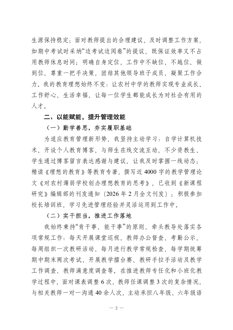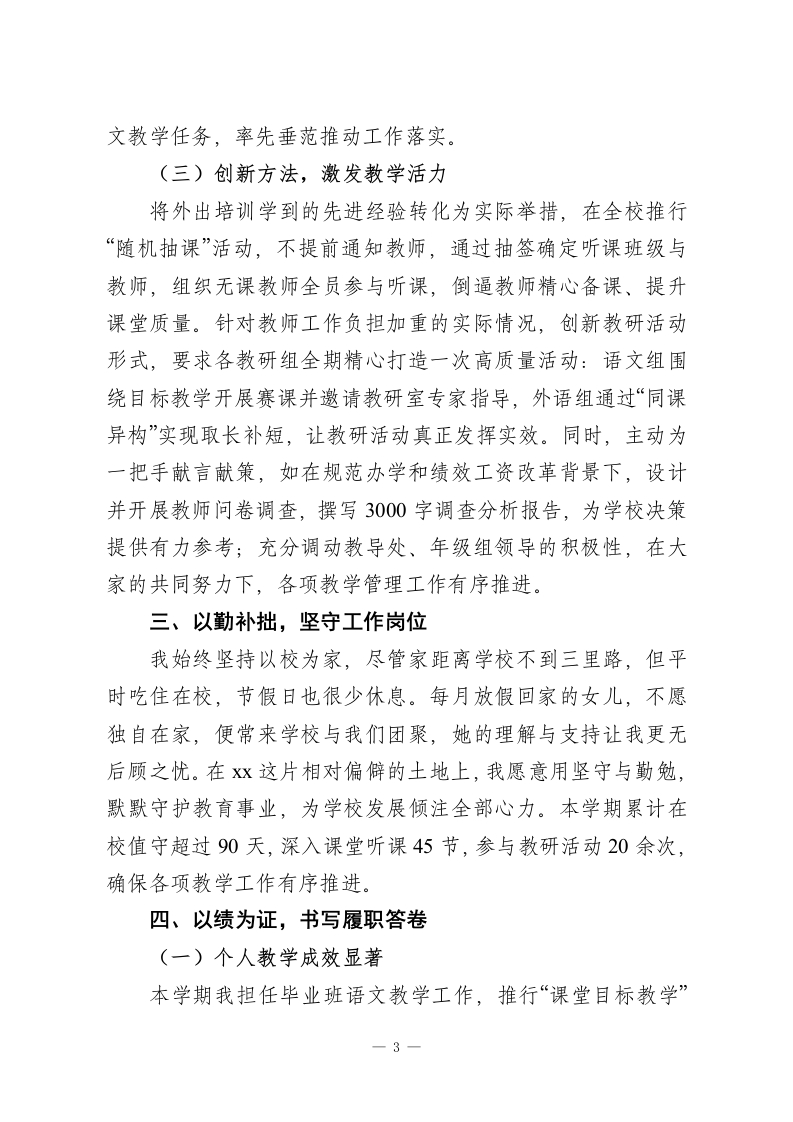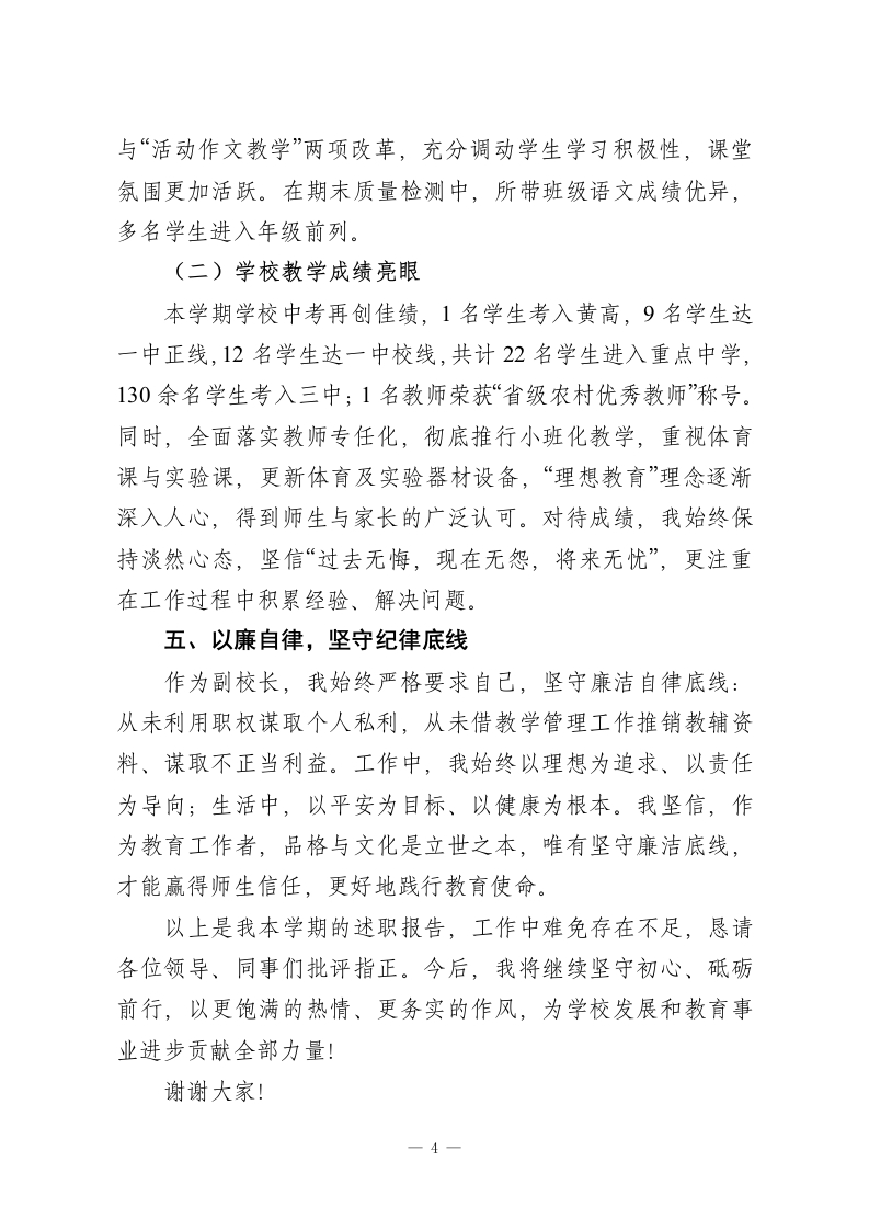 秋季学期副校长德能勤绩廉述职报告:过去无悔、现在无怨、将来无忧尊敬的各位领导、同事们:大家好!我是学校副校长x,主要负责教学管理工作。本学期已圆满结束,现将本学期我在“德、能、勤、绩、廉”五个方面的履职情况汇报如下,恳请各位审核指正!一、以德立身,筑牢教育初心(一)心怀感恩,深耕教育事业自Xx年调入Xx中学以来,我已在这片热土上深耕近Xx年,亲眼见证学校从稳步发展到不断壮大。从普通教师成长为中学语文一级教师,再到走上副校长岗位,每一步成长都离不开学校的培养、领导的信任和同事们的支持,这份感恩之情始终激励我用心对待每一项工作。(二)秉持爱心,守护师生成长我始终将学校发展与师生利益放在心上:当教学质量面临挑战时,主动牵头找问题、想对策;当学生因各种原因转学离校时,深感自责并暗自鼓劲;当学校步入良性发展轨道、教师取得成绩、学生圆梦理想学校时,由衷地为大家感到高兴。对待工作中的不足,我坚持原则、坦诚沟通,被批评的同事总能理解我的初衷一这份严格源于对教育事业的热爱与责任。(三)坚守诚信,践行履职承诺在工作中,我始终坚守诚信底线:承诺提升教学质量,便牵头推进各项教改措施,如今不少曾转学的学生主动要求回流,—1