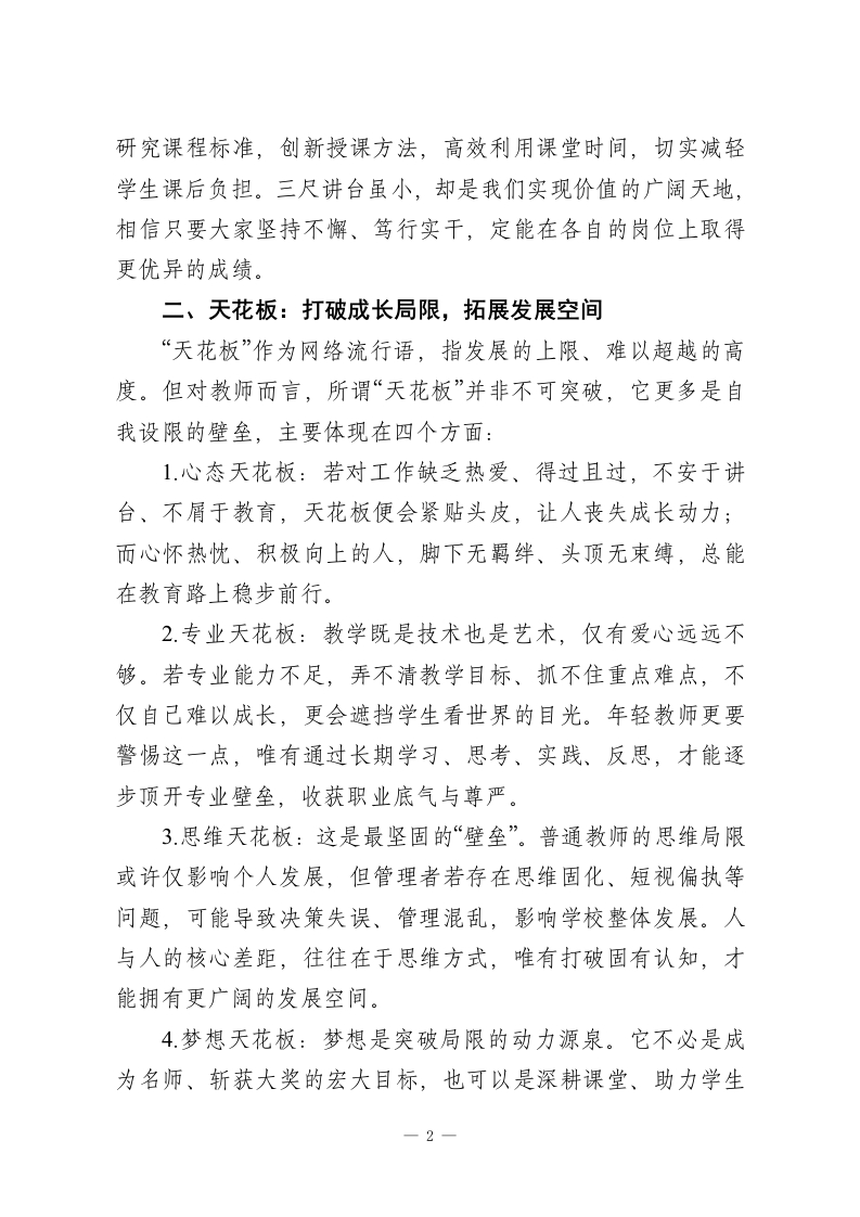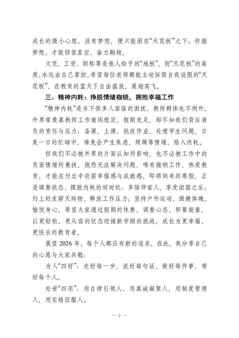 秋季学期寒假期末教师大会校长讲话:3个流行语,帮老师新学期少内耗、多进步各位老师:下午好!时光飞逝,马年新春的脚步也愈发临近。过去这一学期,在全体教职工的共同努力下,学校年级管理井然有序,纪律与安全教育常抓不懈,德育活动亮点纷呈,教科研工作扎实推进,优良的教风、学风、校风愈发浓厚。尤其是班主任老师们,起早贪黑、默默奉献,用责任与爱心守护着学生成长,让学校领导班子深受感动。正是每一位“xx人”的凝心聚力,学校各项工作才取得了令人欣慰的成绩。在此,我谨代表学校,向各位的辛勤付出、无私奉献表示诚挚的谢意,并通过大家,向支持学校工作的教职工家属们致以衷心的感谢!近年来,诸多流行语走进大众视野,它们既反映时代风貌,也蕴含着生活智慧。今天,我从中选取3个关键词,与大家共勉,希望能为新学期的工作注入新的动力。一、踔厉奋发、勇毅前行:以初心赴使命,以实干促成长“踔厉奋发”彰显精神振奋、斗志昂扬的状态,“勇毅前行”体现勇敢坚毅、不畏艰难的品格。作为教育工作者,我们肩负着立德树人的重大使命,更需秉持这份精神底色。新时代对教育提出了更高要求,我们不能固步自封,要以更高标准严格要求自已:与时俱进更新教育理念,持续学习提升教学能力,从素质均衡、创新思维等多方面培养学生;深入1